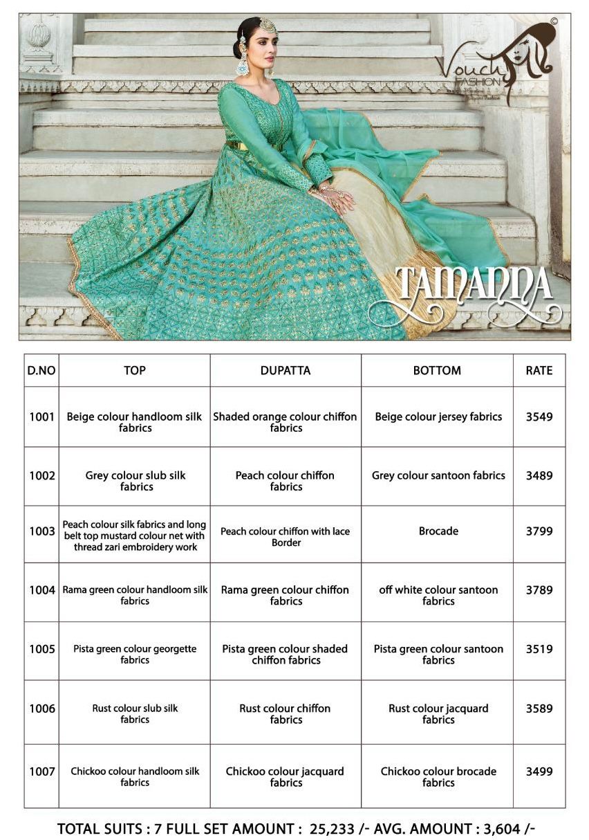 Buy Online Tamanna Series 1001 To 1007 By Vouch Fashion Single And Set Stockiest And Supplier From Surat 7 Pcs of Full Catalogue at Wholesale Price. Looking for Tamanna Series 1001 To 1007 By Vouch Fashion Single And Set Stockiest And Supplier From Surat Full Catalouge at Best Price? Buy Now Tamanna Series 1001 To 1007 By Vouch Fashion Single And Set Stockiest And Supplier From Surat at Wholesale Rate of Rs 25228 with Total 7 Pcs from authroized dealer and supplier of Brand. Cost of Each piece is just only Rs 3604 which is very low and affordable price to resale the product in your retail store ,This is Surat based Wholesale Supplier & Dealer of Brand. Click on Brand name to Know more about Brand's products.Call or Whatsapp on 9898838984 for booking or enquiry