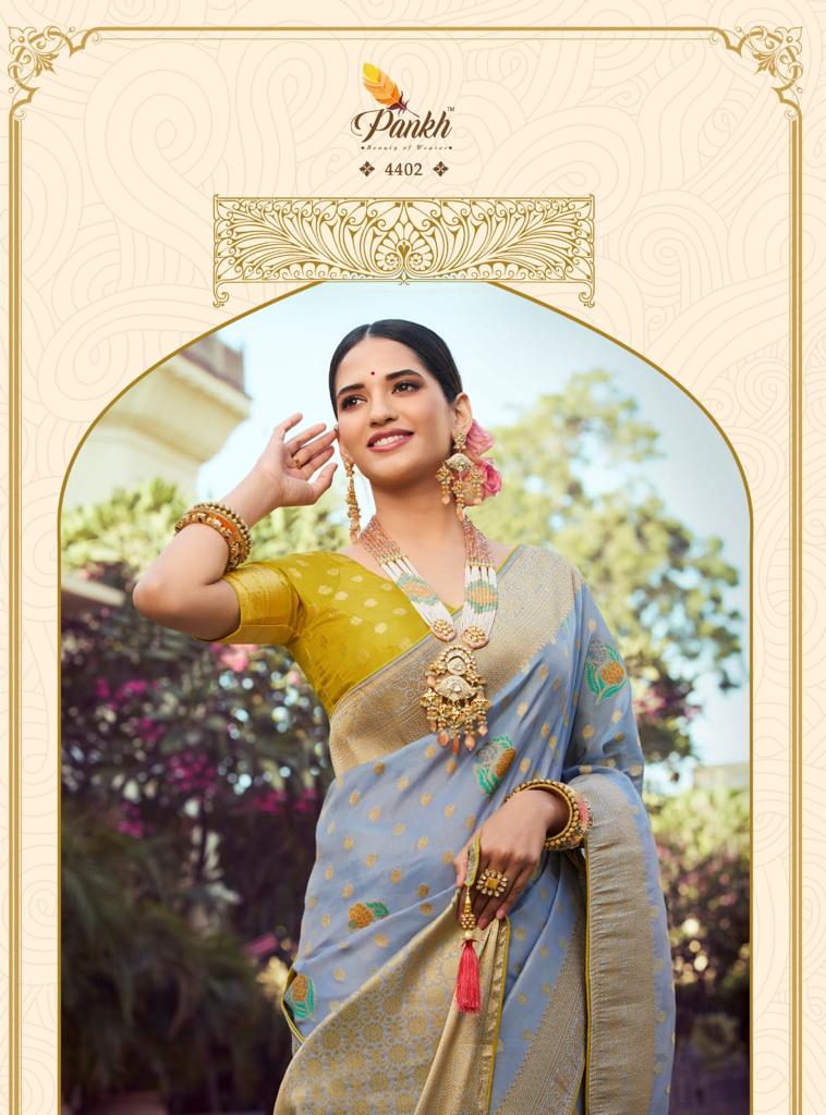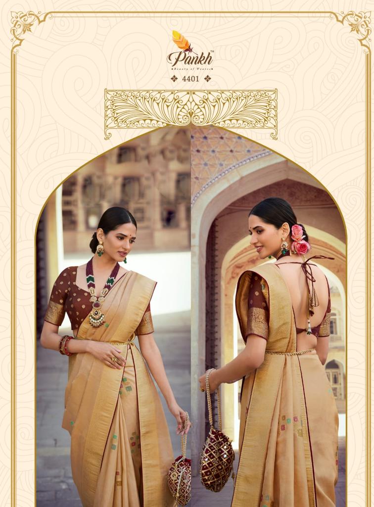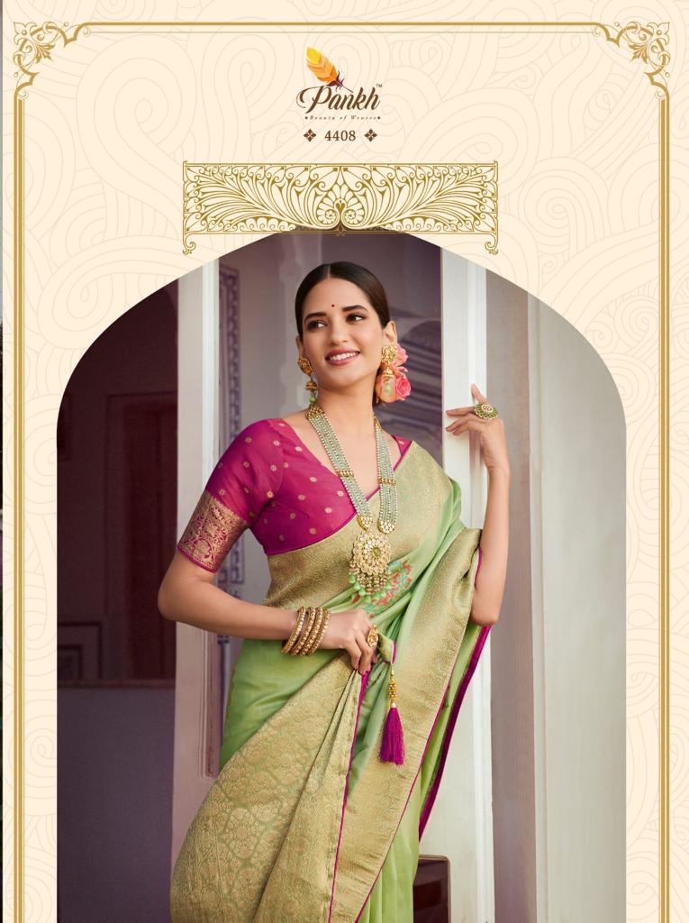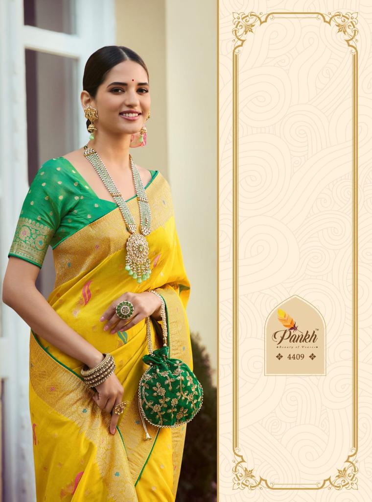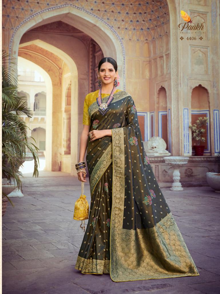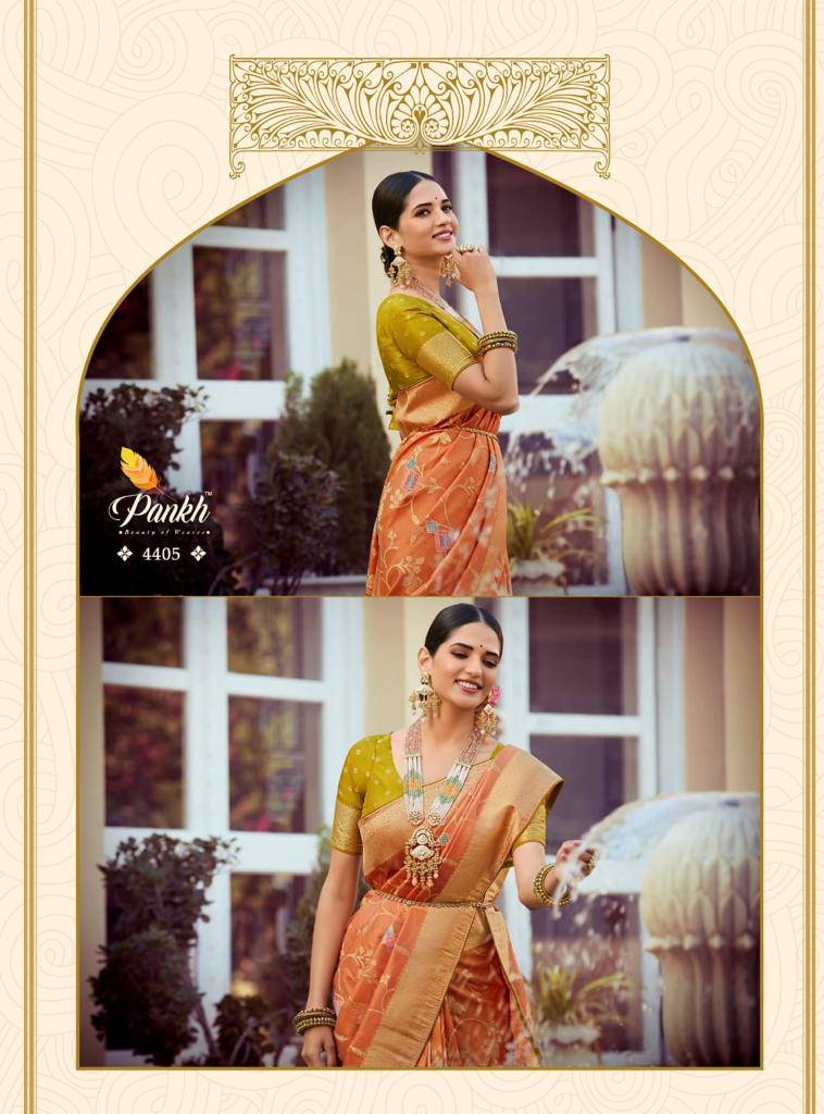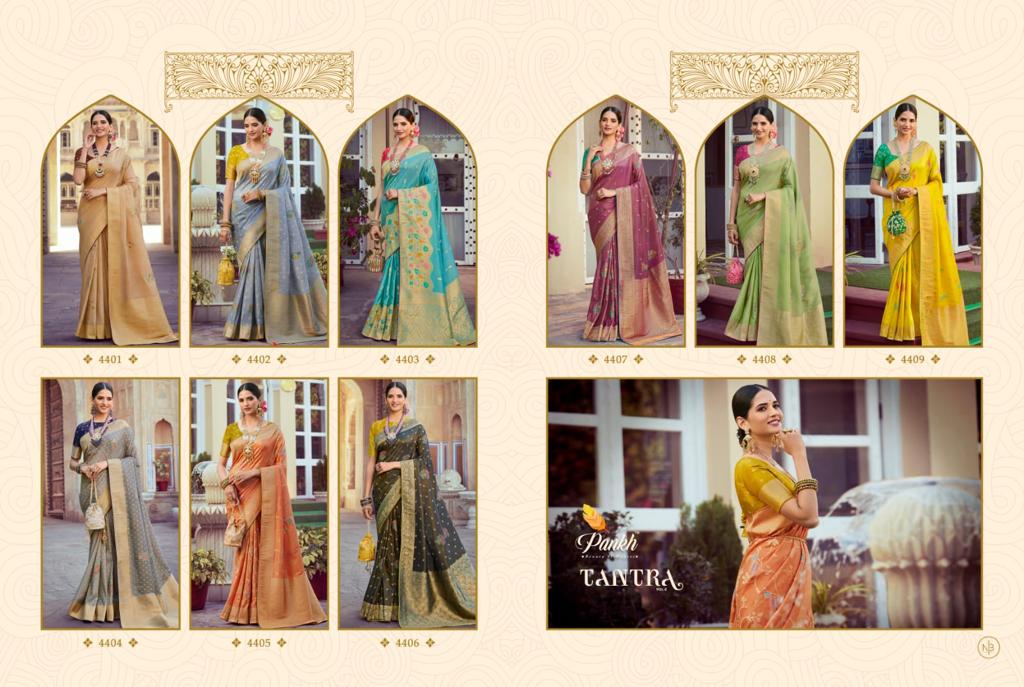 Buy Online Tantra Vol 2 By Pankh Pure Silk Saree 9 Pcs of Full Catalogue at Wholesale Price. Looking for Tantra Vol 2 By Pankh Pure Silk Saree Full Catalouge at Best Price? Buy Now Tantra Vol 2 By Pankh Pure Silk Saree at Wholesale Rate of Rs 21555 with Total 9 Pcs from authroized dealer and supplier of Pankh Brand. Cost of Each piece is just only Rs 2395 which is very low and affordable price to resale the product in your retail store ,This is Surat based Wholesale Supplier & Dealer of Pankh Brand. Click on Brand name to Know more about Pankh Brand's products.Call or Whatsapp on 9898838984 for booking or enquiry