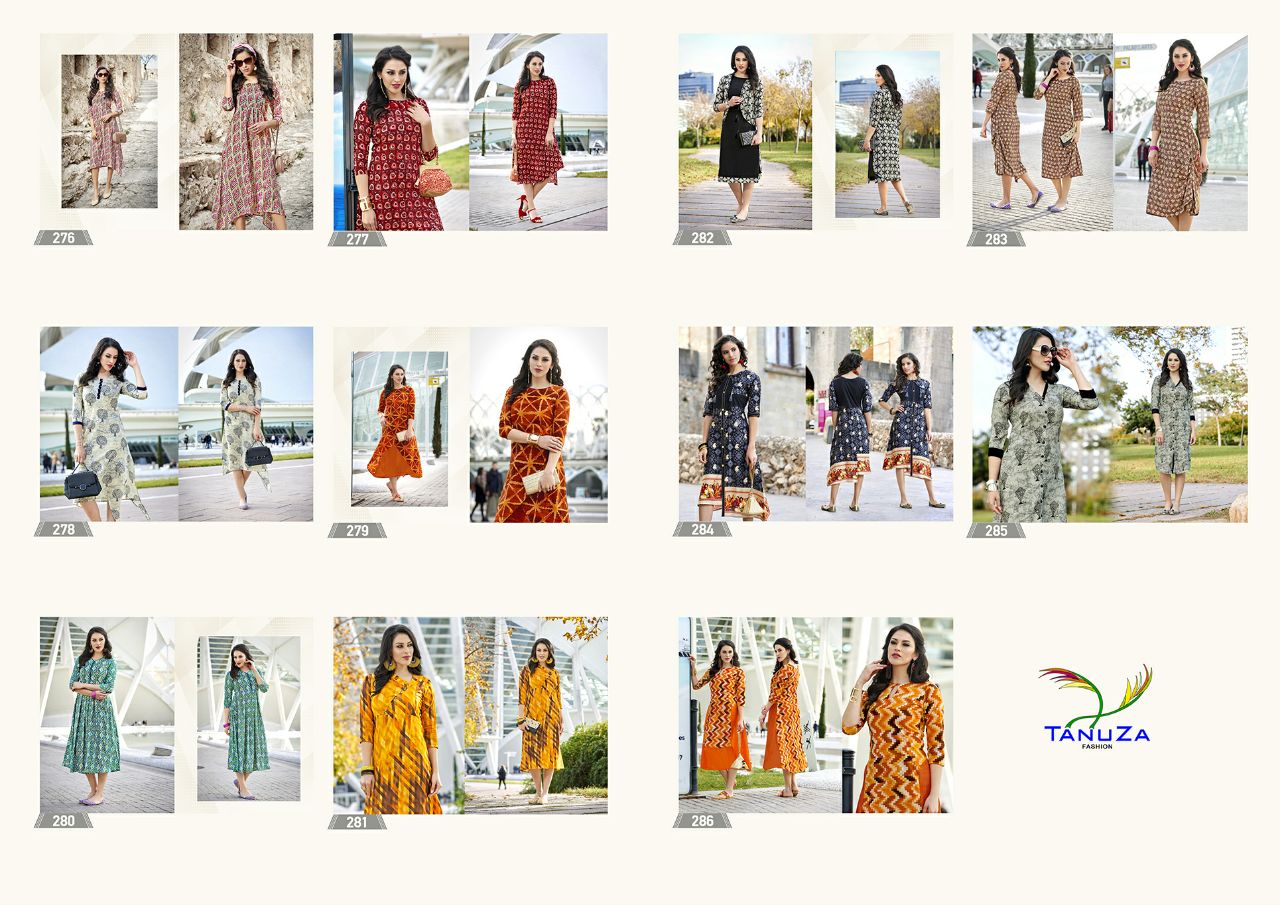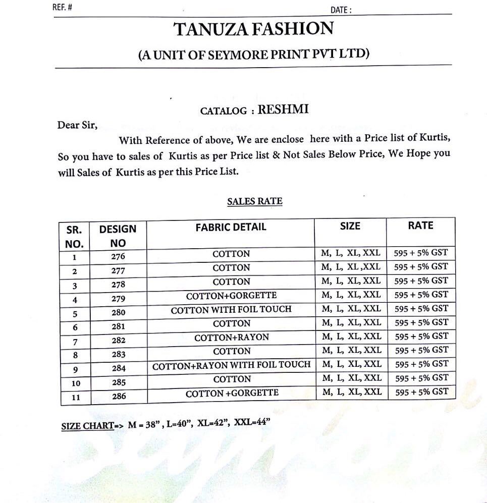 Buy Online Tanuza Fashion Reshmi 276 Series Cotton Printed Kurti Dealer 11 Pcs of Full Catalogue at Wholesale Price. Looking for Tanuza Fashion Reshmi 276 Series Cotton Printed Kurti Dealer Full Catalouge at Best Price? Buy Now Tanuza Fashion Reshmi 276 Series Cotton Printed Kurti Dealer at Wholesale Rate of Rs 6545 with Total 11 Pcs from authroized dealer and supplier of TANUJA Brand. Cost of Each piece is just only Rs 595 which is very low and affordable price to resale the product in your retail store ,This is Surat based Wholesale Supplier & Dealer of TANUJA Brand. Click on Brand name to Know more about TANUJA Brand's products.Call or Whatsapp on 9898838984 for booking or enquiry