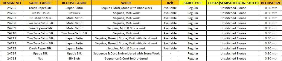 Buy Online TARINI SERIES 24705 TO 24715 BY MAHOTSAV DESIGNER WEDDING SAREES 11 Pcs of Full Catalogue at Wholesale Price. Looking for TARINI SERIES 24705 TO 24715 BY MAHOTSAV DESIGNER WEDDING SAREES Full Catalouge at Best Price? Buy Now TARINI SERIES 24705 TO 24715 BY MAHOTSAV DESIGNER WEDDING SAREES at Wholesale Rate of Rs 0 with Total 11 Pcs from authroized dealer and supplier of Mahotsav Saree Brand. Cost of Each piece is just only Rs 0 which is very low and affordable price to resale the product in your retail store ,This is Surat based Wholesale Supplier & Dealer of Mahotsav Saree Brand. Click on Brand name to Know more about Mahotsav Saree Brand's products.Call or Whatsapp on 9898838984 for booking or enquiry
