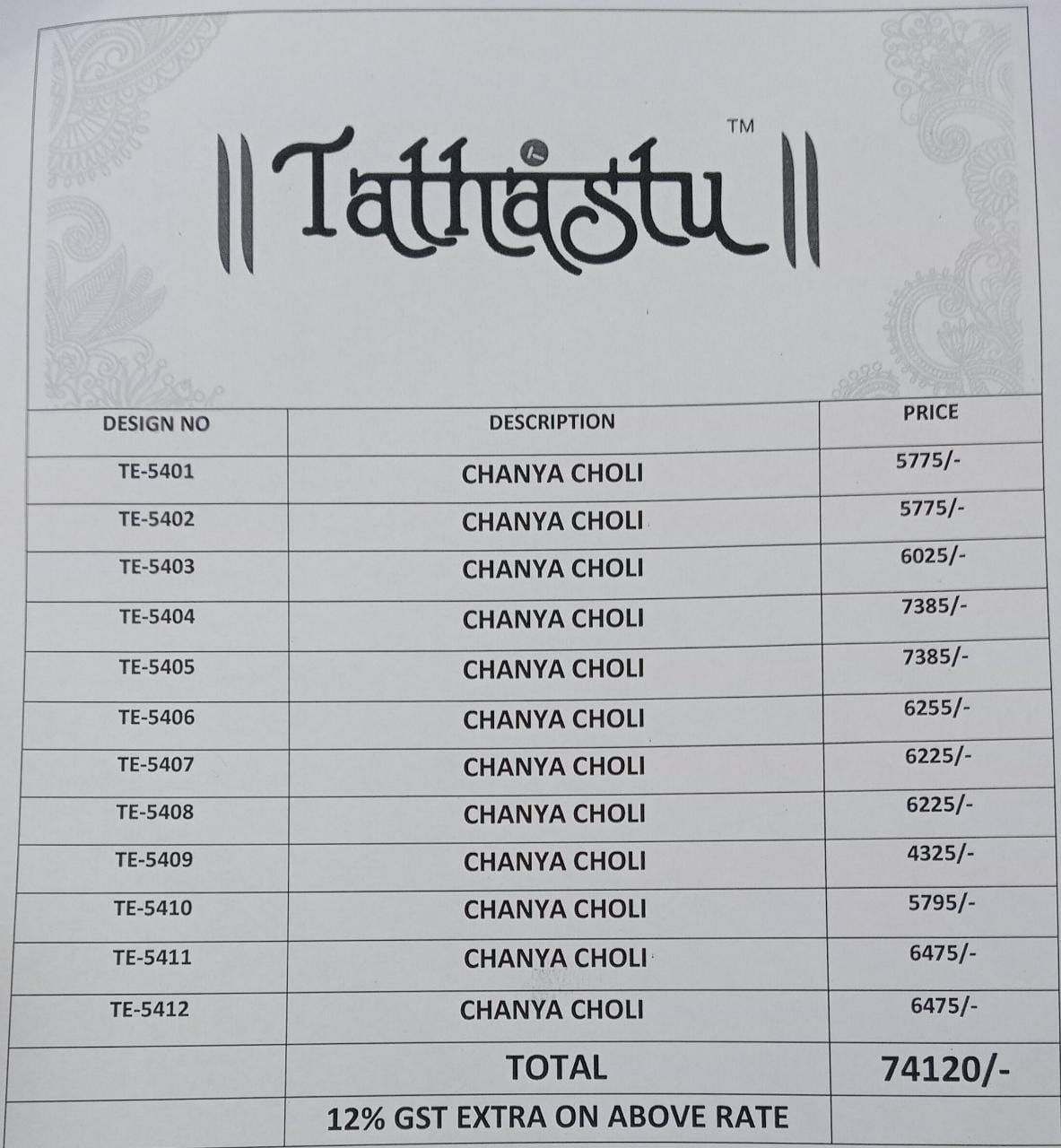 Buy Online Tathastu Lehanga Series Te 5401 To Te 5412 Heavy Lehangas Single And Sets Dealer From India 12 Pcs of Full Catalogue at Wholesale Price. Looking for Tathastu Lehanga Series Te 5401 To Te 5412 Heavy Lehangas Single And Sets Dealer From India Full Catalouge at Best Price? Buy Now Tathastu Lehanga Series Te 5401 To Te 5412 Heavy Lehangas Single And Sets Dealer From India at Wholesale Rate of Rs 0 with Total 12 Pcs from authroized dealer and supplier of TATHASTU Brand. Cost of Each piece is just only Rs 0 which is very low and affordable price to resale the product in your retail store ,This is Surat based Wholesale Supplier & Dealer of TATHASTU Brand. Click on Brand name to Know more about TATHASTU Brand's products.Call or Whatsapp on 9898838984 for booking or enquiry