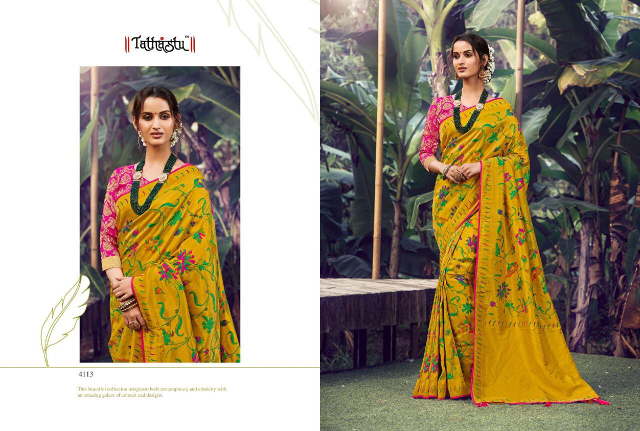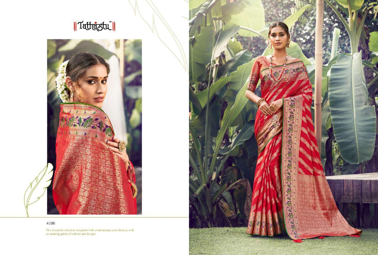 Brand - Tatsthu. Type - saree. Fabric- Silk . Series - 4101 to 4114. Rate- 1365 per pcs . * set & loose & Singel * GST 5 Percent Extra. Delivery from tomorrow 100+ singles |