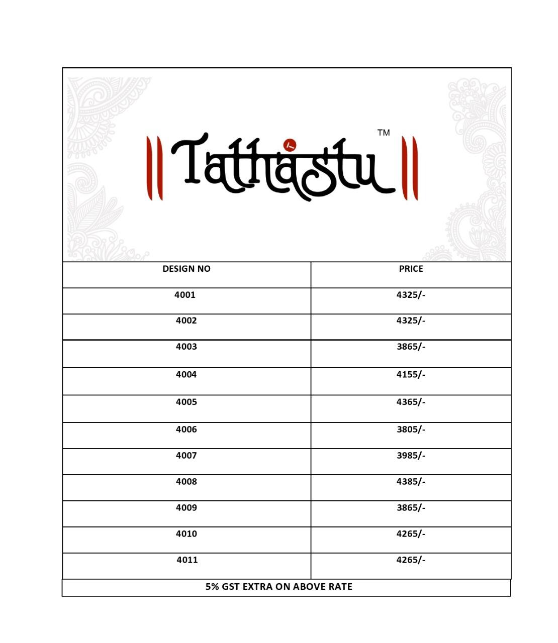 Brand - TATHASTU. Series - - 4001 to 4011 Fabric- Dola silk . Set & loose & Singel . Single extra 100 GST 5 Percent Extra. * Delivery From Today * |