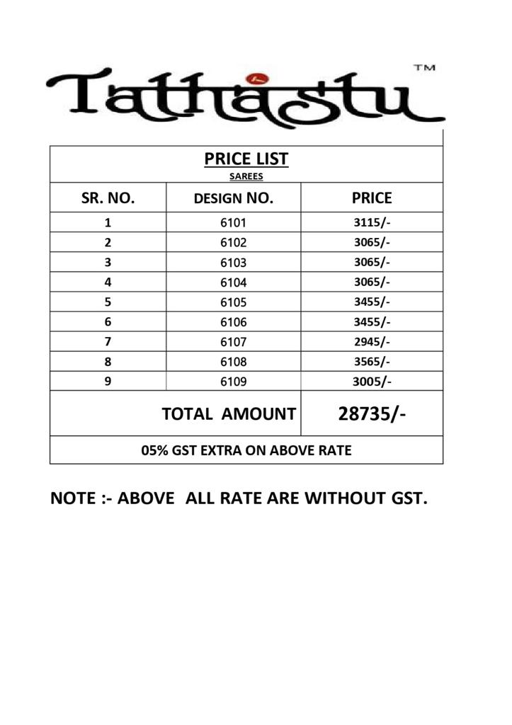 Brand - Tathastu saree D No- 6101 to 6109 Gst 5% extra Ship extra Single available 100+Singles |