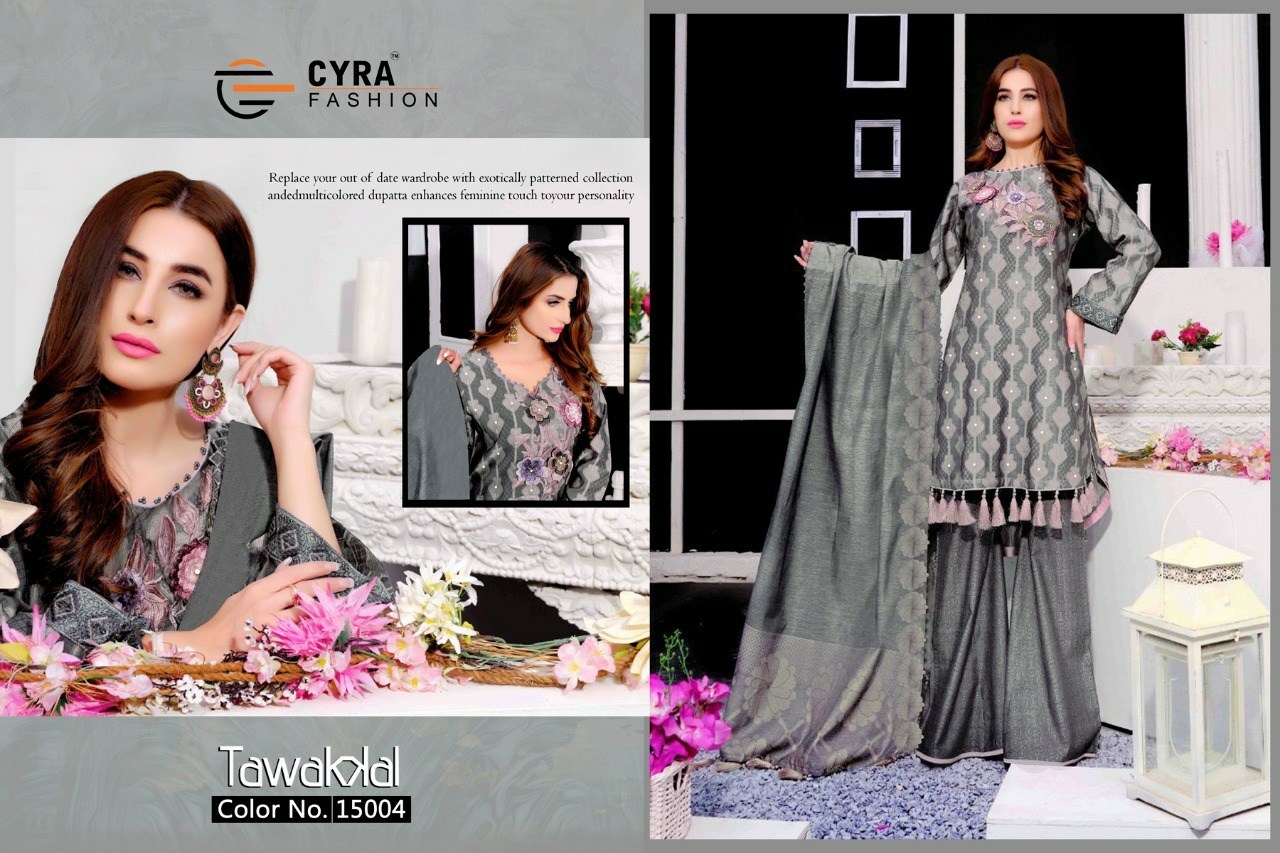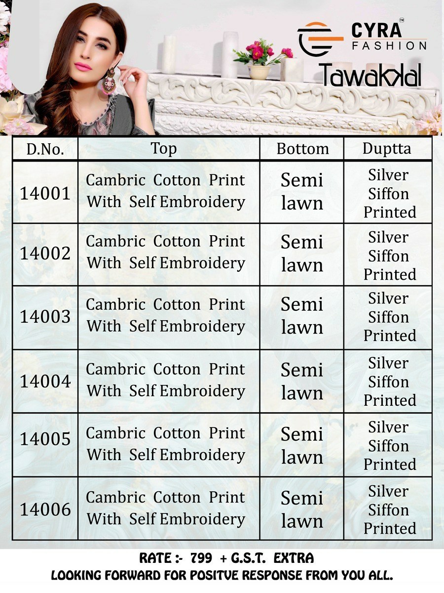 *Brand :* cyra fashion *Catalog Name :* Tawakkal *Price :* ?799 *Piece :* 6 *Total Price :* 4794 ( GST Extra ) *Size :* Unstitched *Fabric :* Cambric Cotton *Availibility :* On Booking |