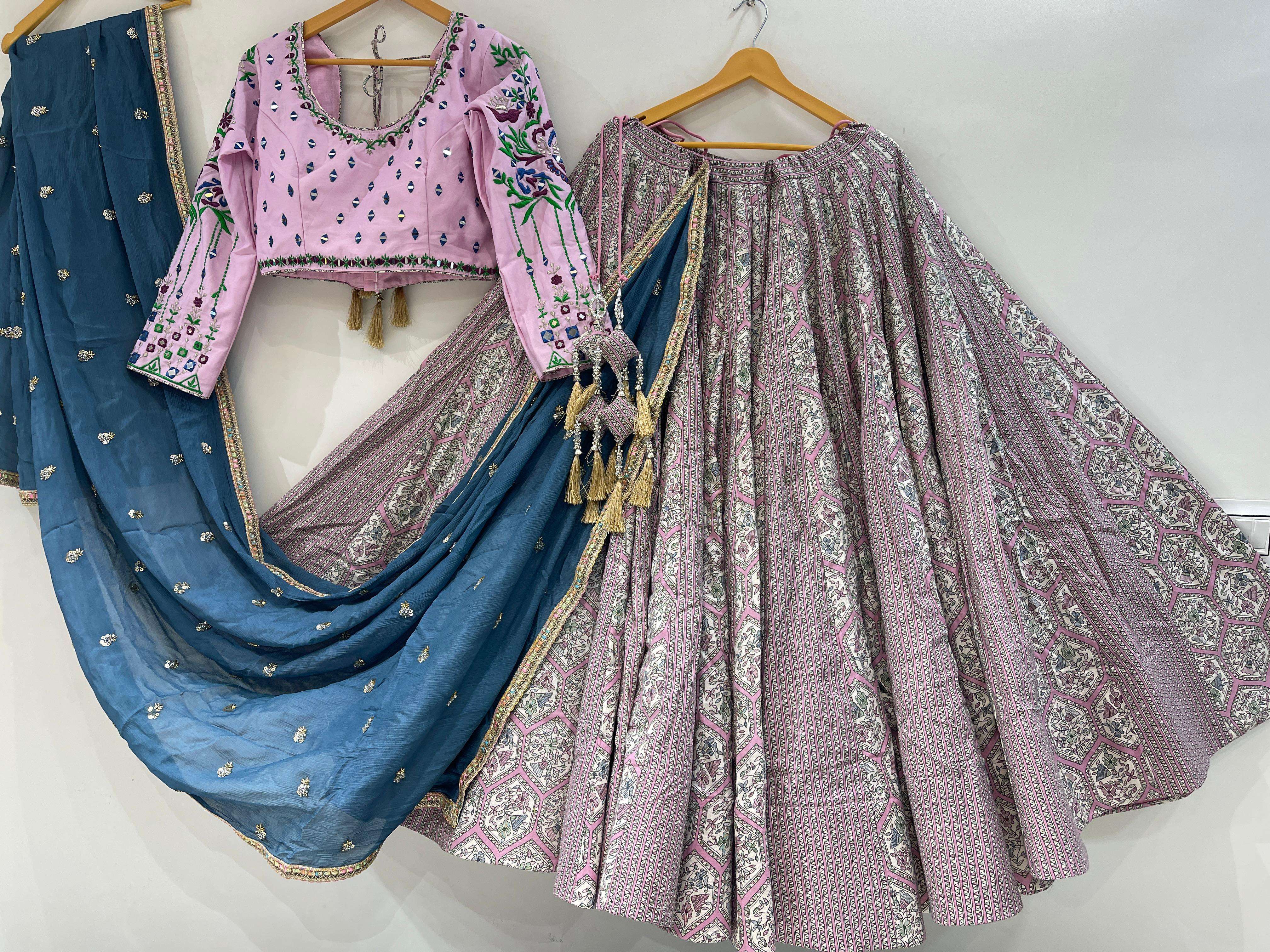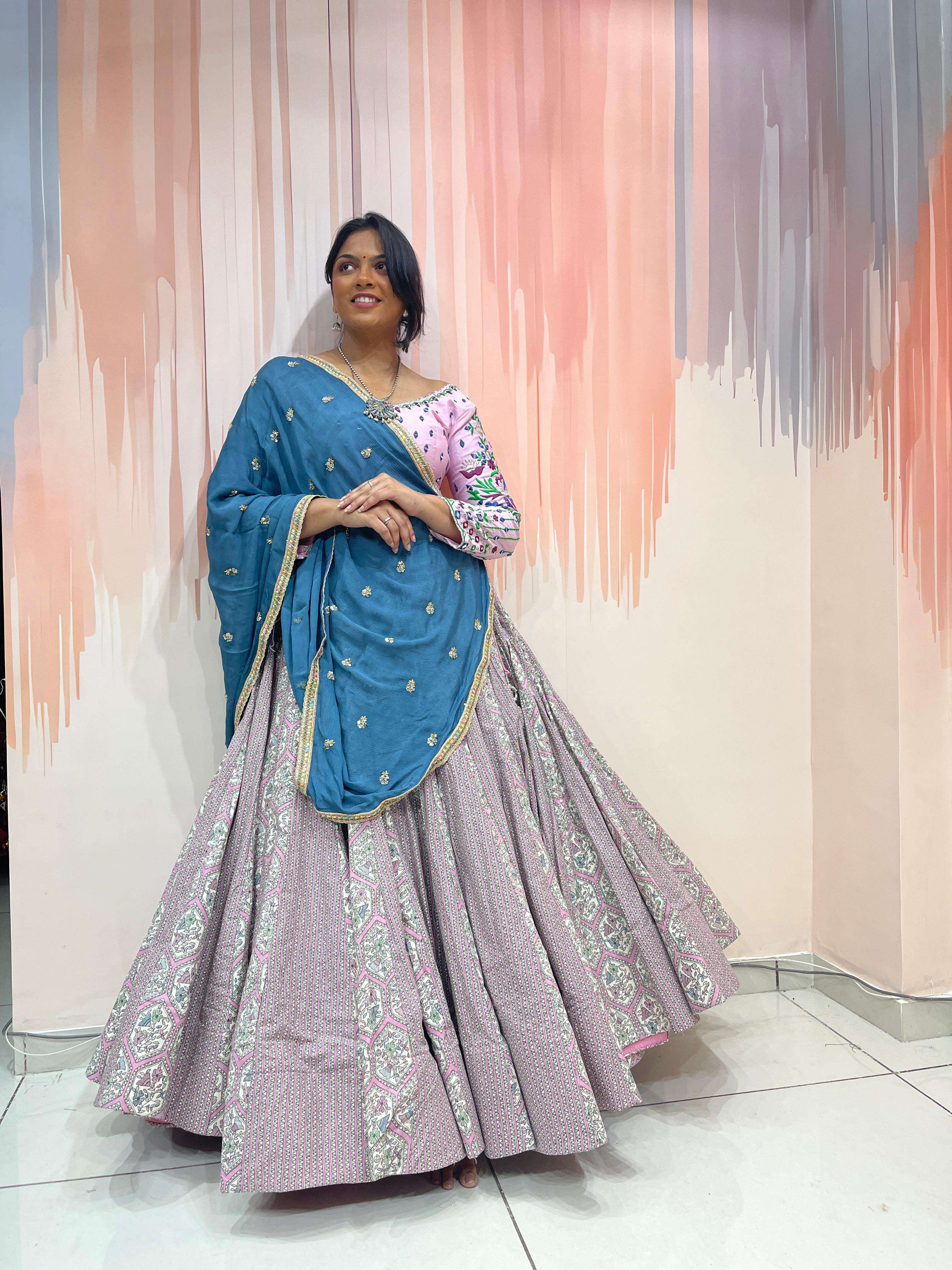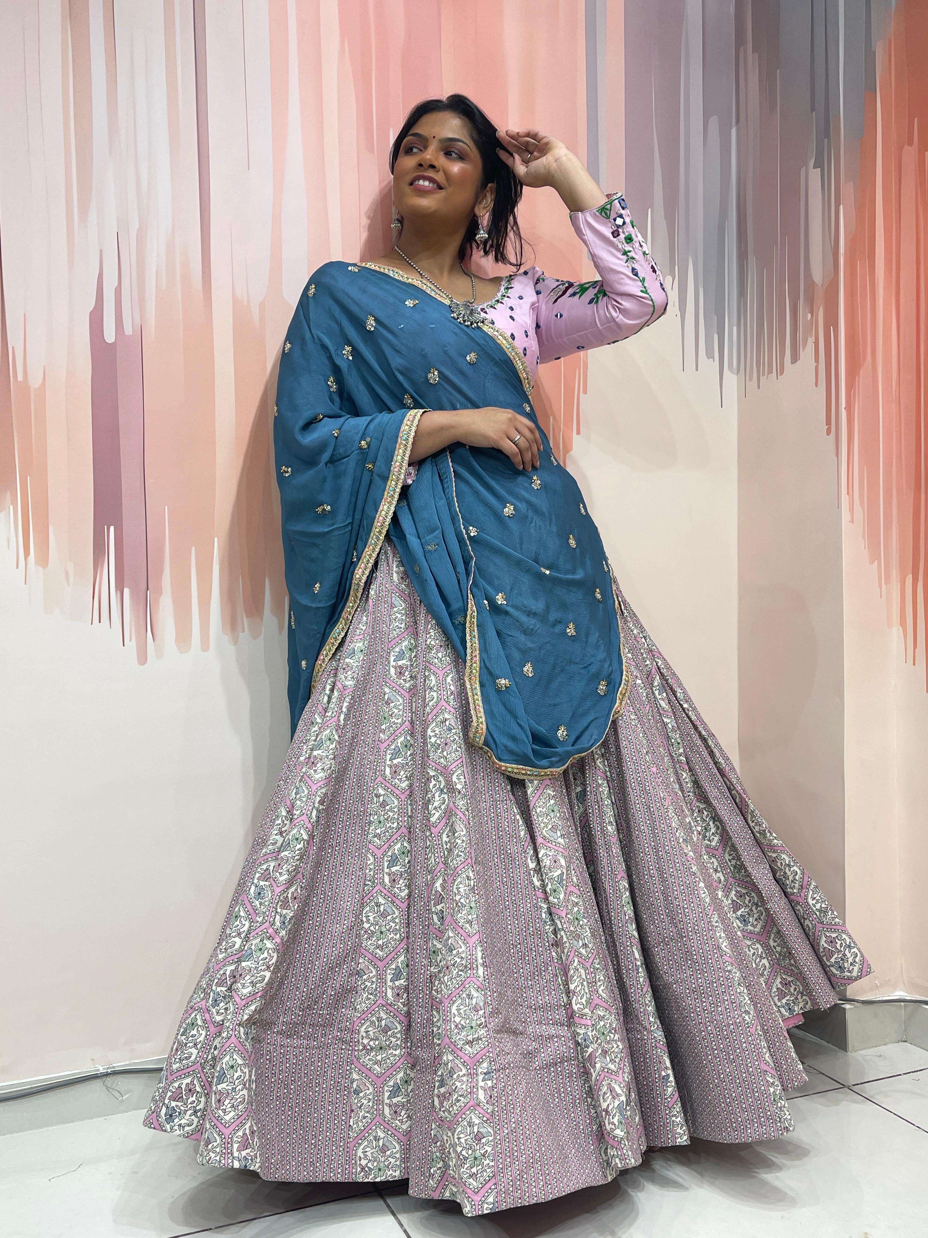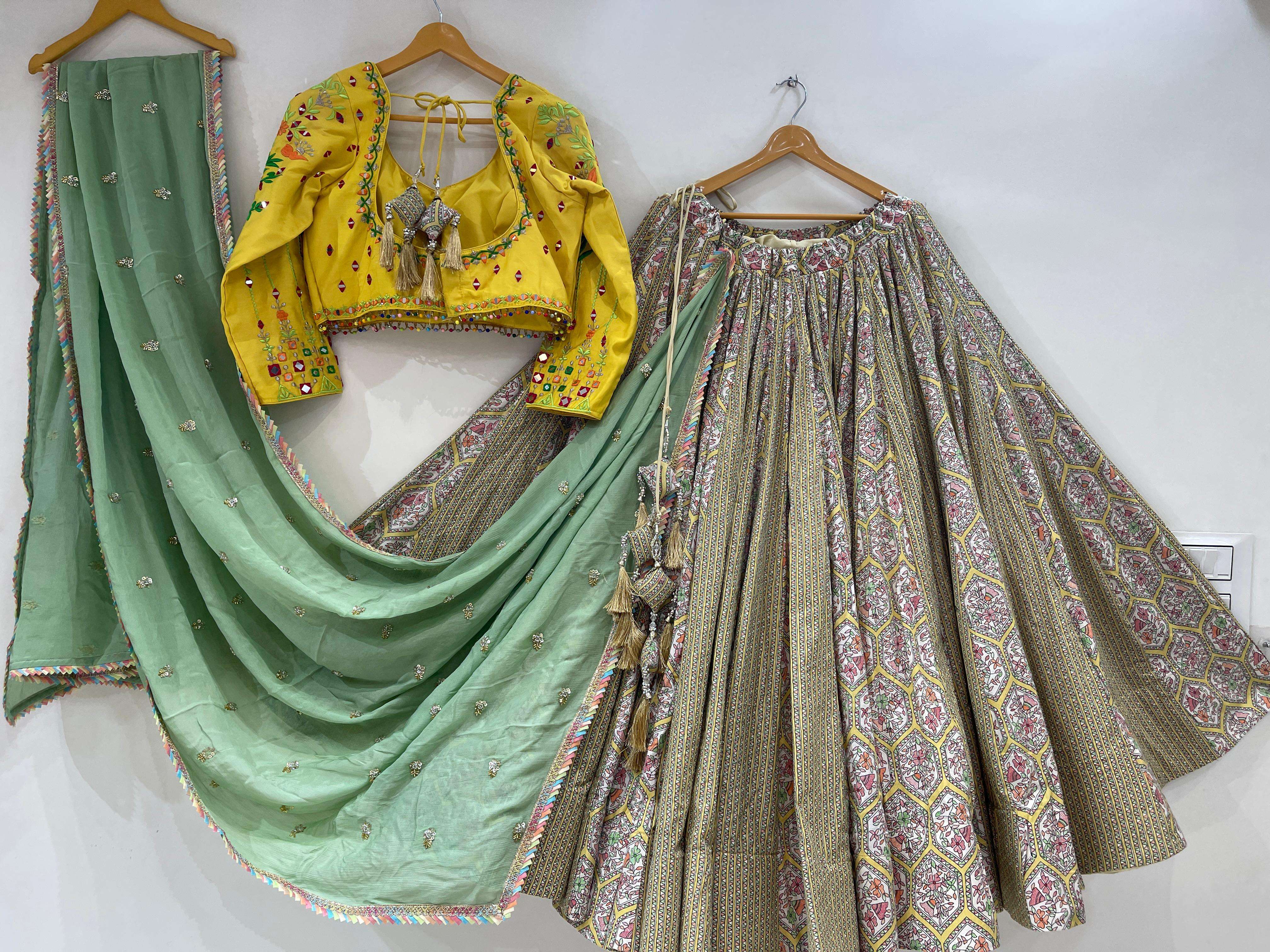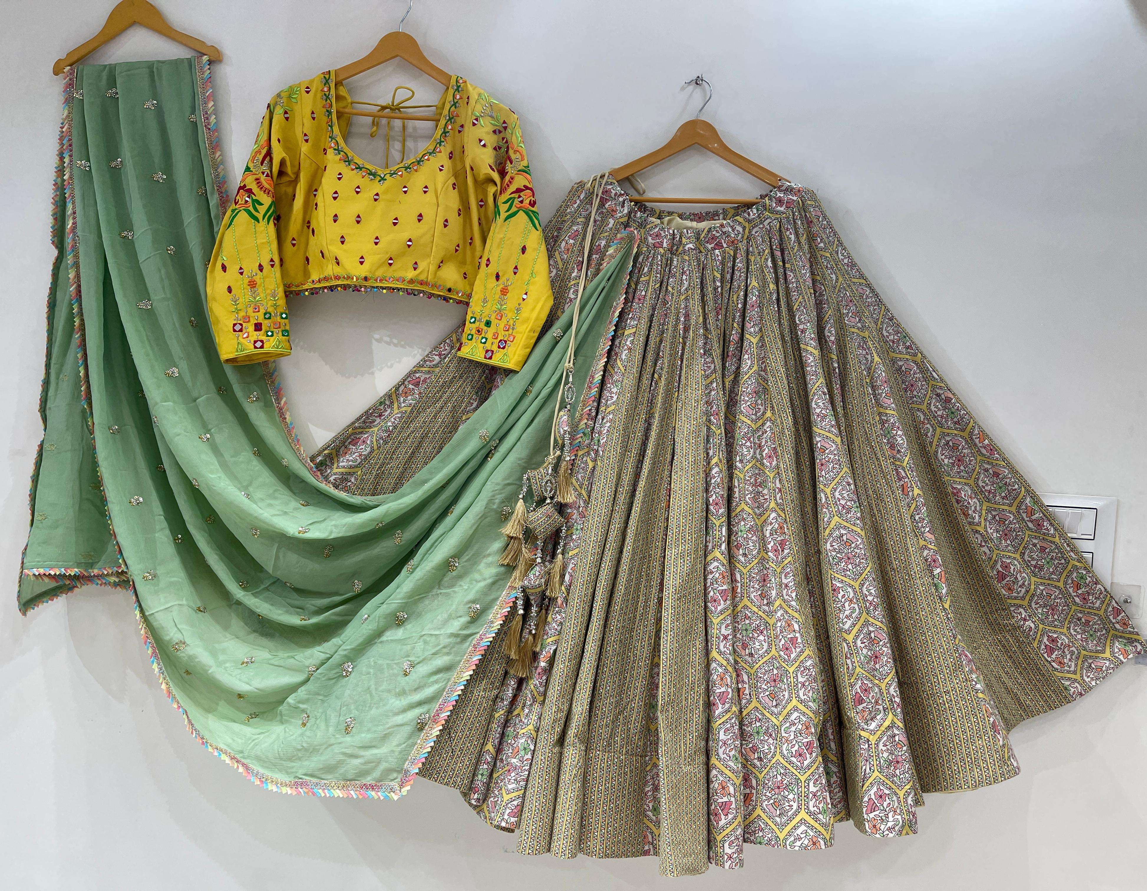 *Indo Western Concept Full long sleeve embroidery Cotton Printed Full ghera approx 10/12 Mtrs in trend Cotton Silk Blouse fusion style Chaniya Choli*