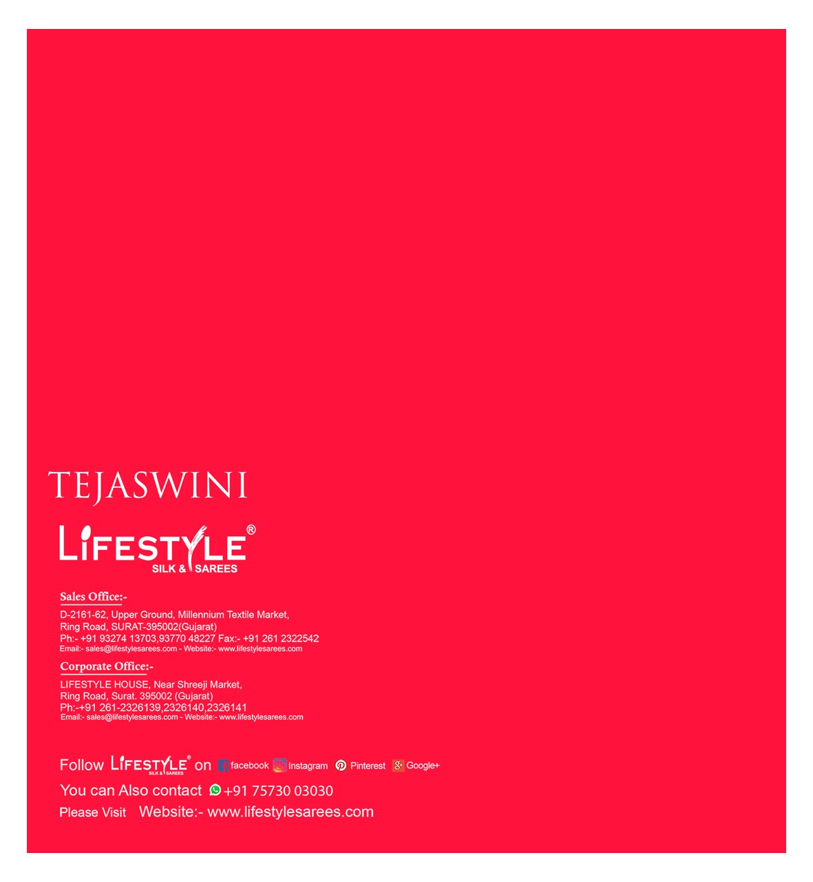 Buy Online Tejaswini Vol 1 By Lifestyle Manufacturer Traders Surat 6 Pcs of Full Catalogue at Wholesale Price. Looking for Tejaswini Vol 1 By Lifestyle Manufacturer Traders Surat Full Catalouge at Best Price? Buy Now Tejaswini Vol 1 By Lifestyle Manufacturer Traders Surat at Wholesale Rate of Rs 9756 with Total 6 Pcs from authroized dealer and supplier of LIFESTYLE Brand. Cost of Each piece is just only Rs 1626 which is very low and affordable price to resale the product in your retail store ,This is Surat based Wholesale Supplier & Dealer of LIFESTYLE Brand. Click on Brand name to Know more about LIFESTYLE Brand's products.Call or Whatsapp on 9898838984 for booking or enquiry