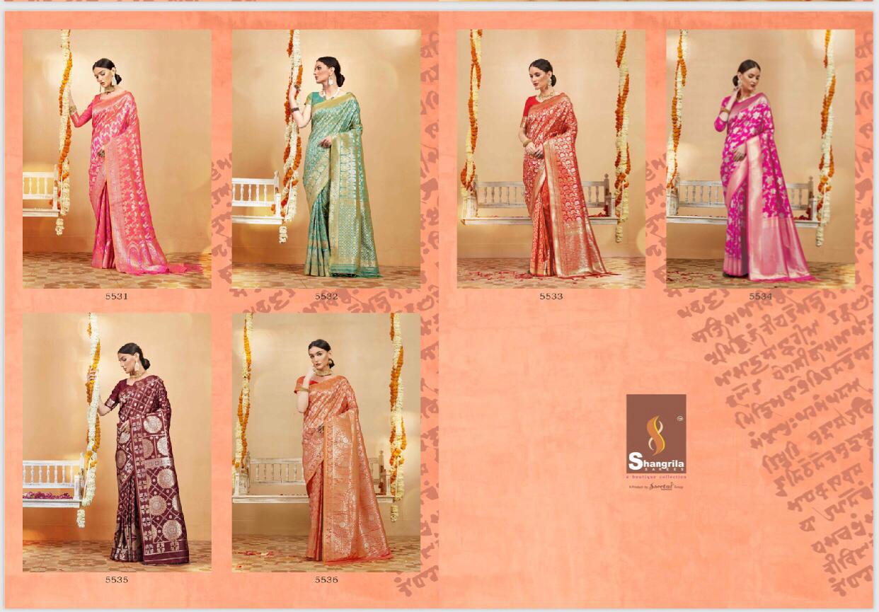 Buy Online The Banarsi Zari By Shangrila 5531 Series Designer Banarsi Silk Saree Collection Wholesaler Surat 6 Pcs of Full Catalogue at Wholesale Price. Looking for The Banarsi Zari By Shangrila 5531 Series Designer Banarsi Silk Saree Collection Wholesaler Surat Full Catalouge at Best Price? Buy Now The Banarsi Zari By Shangrila 5531 Series Designer Banarsi Silk Saree Collection Wholesaler Surat at Wholesale Rate of Rs 9900 with Total 6 Pcs from authroized dealer and supplier of SHANGRILA Brand. Cost of Each piece is just only Rs 1650 which is very low and affordable price to resale the product in your retail store ,This is Surat based Wholesale Supplier & Dealer of SHANGRILA Brand. Click on Brand name to Know more about SHANGRILA Brand's products.Call or Whatsapp on 9898838984 for booking or enquiry