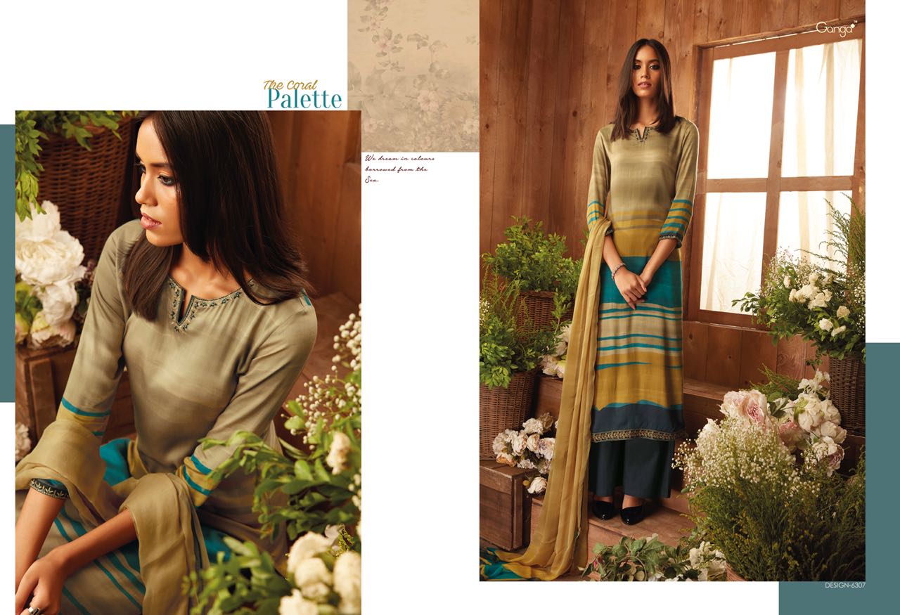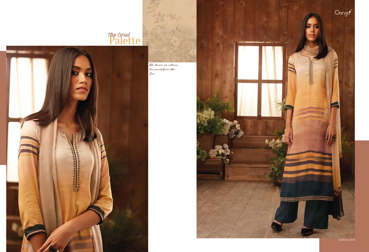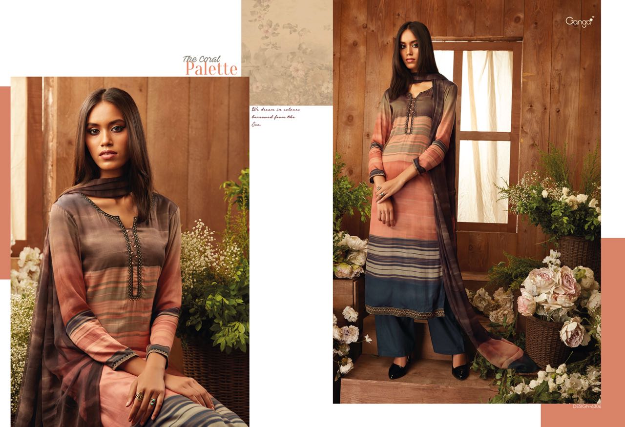 Buy Online The Coral Pallete By Ganga Designer Suit Natural Printed Satin With An Embroidary In 9 Designs Wholesale Supplier And Dealer Surat 9 Pcs of Full Catalogue at Wholesale Price. Looking for The Coral Pallete By Ganga Designer Suit Natural Printed Satin With An Embroidary In 9 Designs Wholesale Supplier And Dealer Surat Full Catalouge at Best Price? Buy Now The Coral Pallete By Ganga Designer Suit Natural Printed Satin With An Embroidary In 9 Designs Wholesale Supplier And Dealer Surat at Wholesale Rate of Rs 16200 with Total 9 Pcs from authroized dealer and supplier of GANGA Brand. Cost of Each piece is just only Rs 1800 which is very low and affordable price to resale the product in your retail store ,This is Surat based Wholesale Supplier & Dealer of GANGA Brand. Click on Brand name to Know more about GANGA Brand's products.Call or Whatsapp on 9898838984 for booking or enquiry