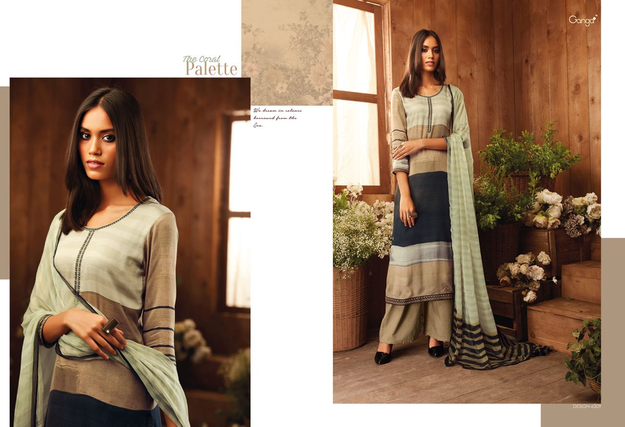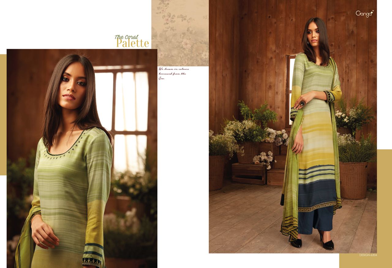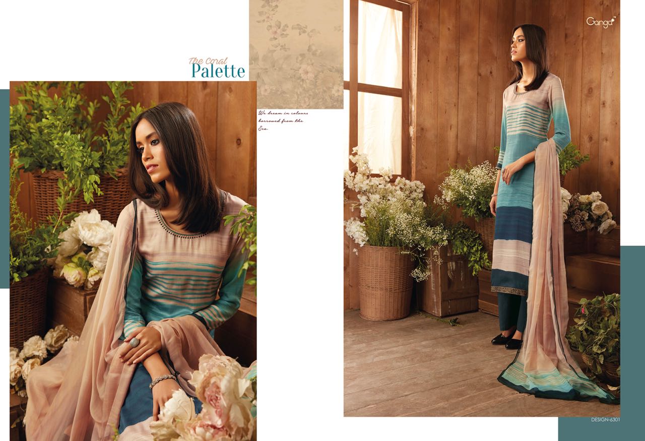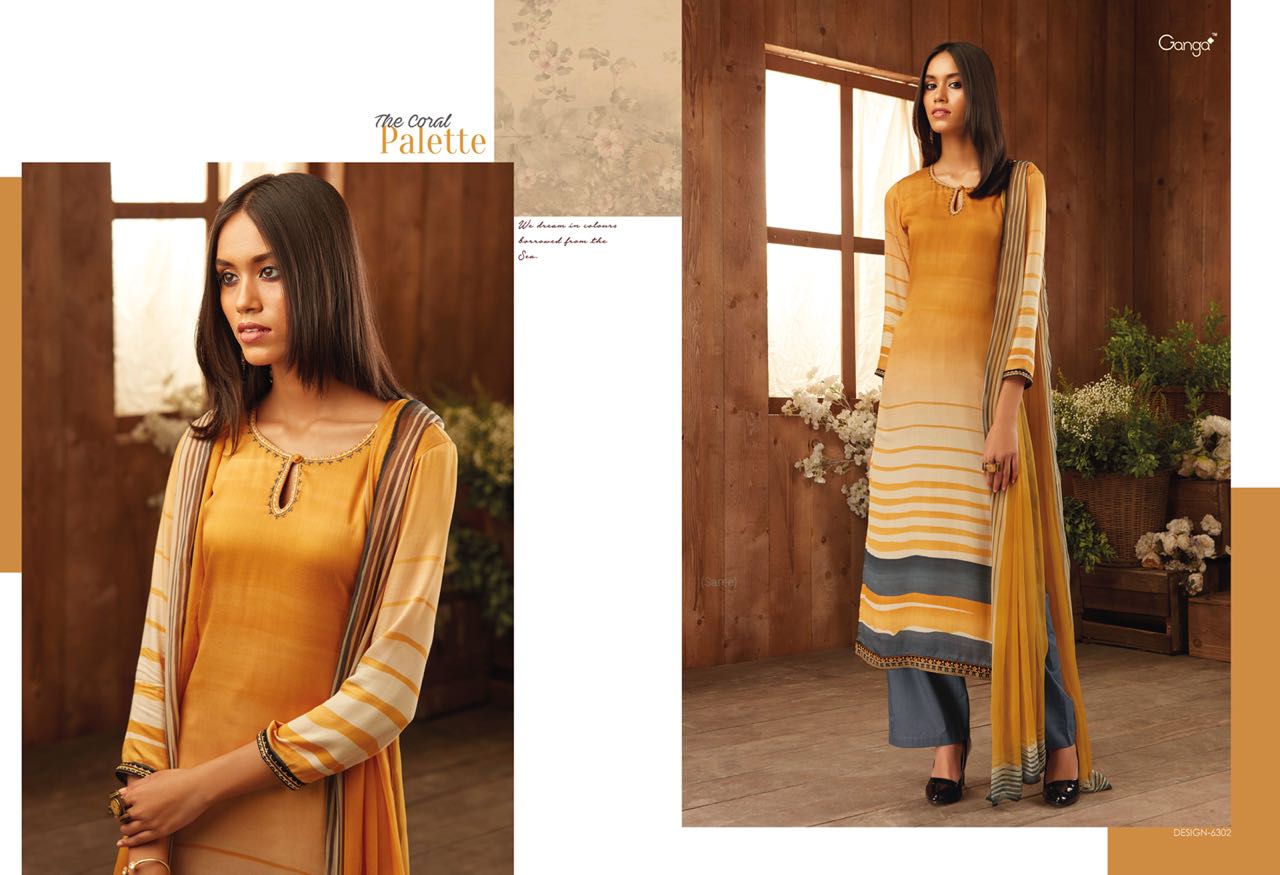 Buy Online The Coral Pallete By Ganga Designer Suit Natural Printed Satin With An Embroidary In 9 Designs Wholesale Supplier And Dealer Surat 9 Pcs of Full Catalogue at Wholesale Price. Looking for The Coral Pallete By Ganga Designer Suit Natural Printed Satin With An Embroidary In 9 Designs Wholesale Supplier And Dealer Surat Full Catalouge at Best Price? Buy Now The Coral Pallete By Ganga Designer Suit Natural Printed Satin With An Embroidary In 9 Designs Wholesale Supplier And Dealer Surat at Wholesale Rate of Rs 16200 with Total 9 Pcs from authroized dealer and supplier of GANGA Brand. Cost of Each piece is just only Rs 1800 which is very low and affordable price to resale the product in your retail store ,This is Surat based Wholesale Supplier & Dealer of GANGA Brand. Click on Brand name to Know more about GANGA Brand's products.Call or Whatsapp on 9898838984 for booking or enquiry