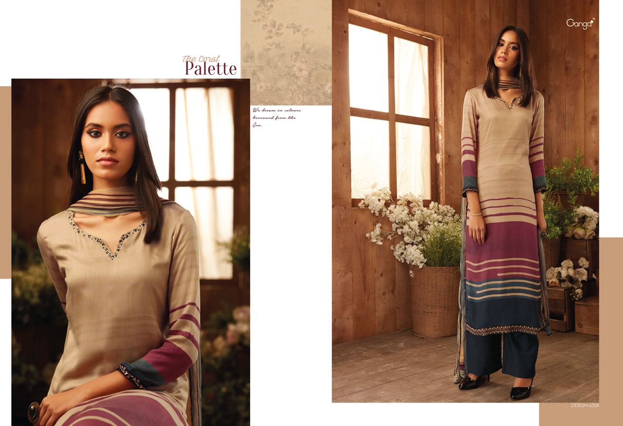 The Coral Pallete By Ganga Designer Suit Natural Printed Satin With An Embroidary In 9 Designs Wholesale Supplier And Dealer Surat