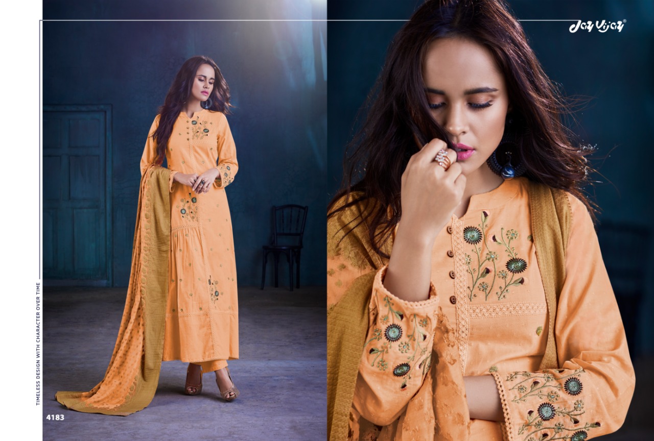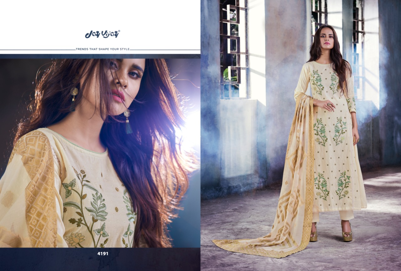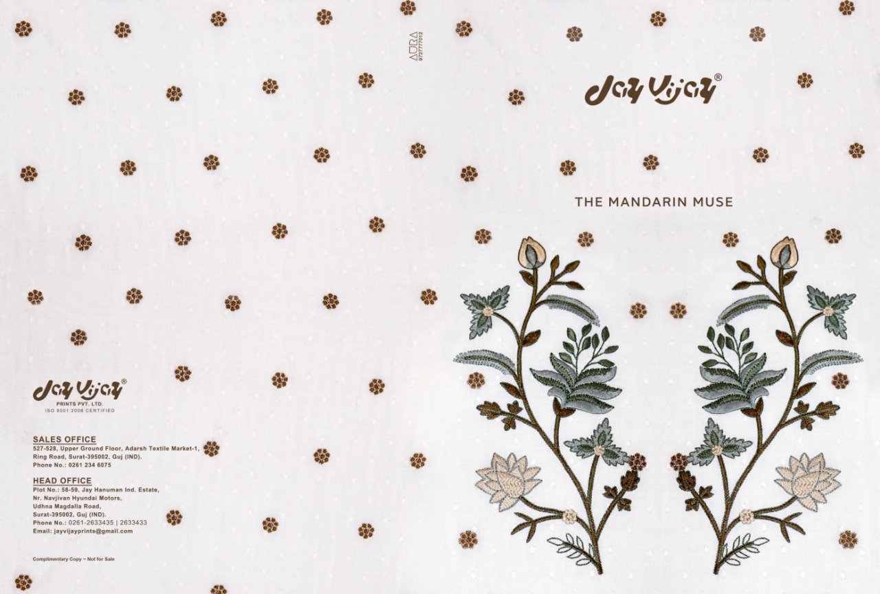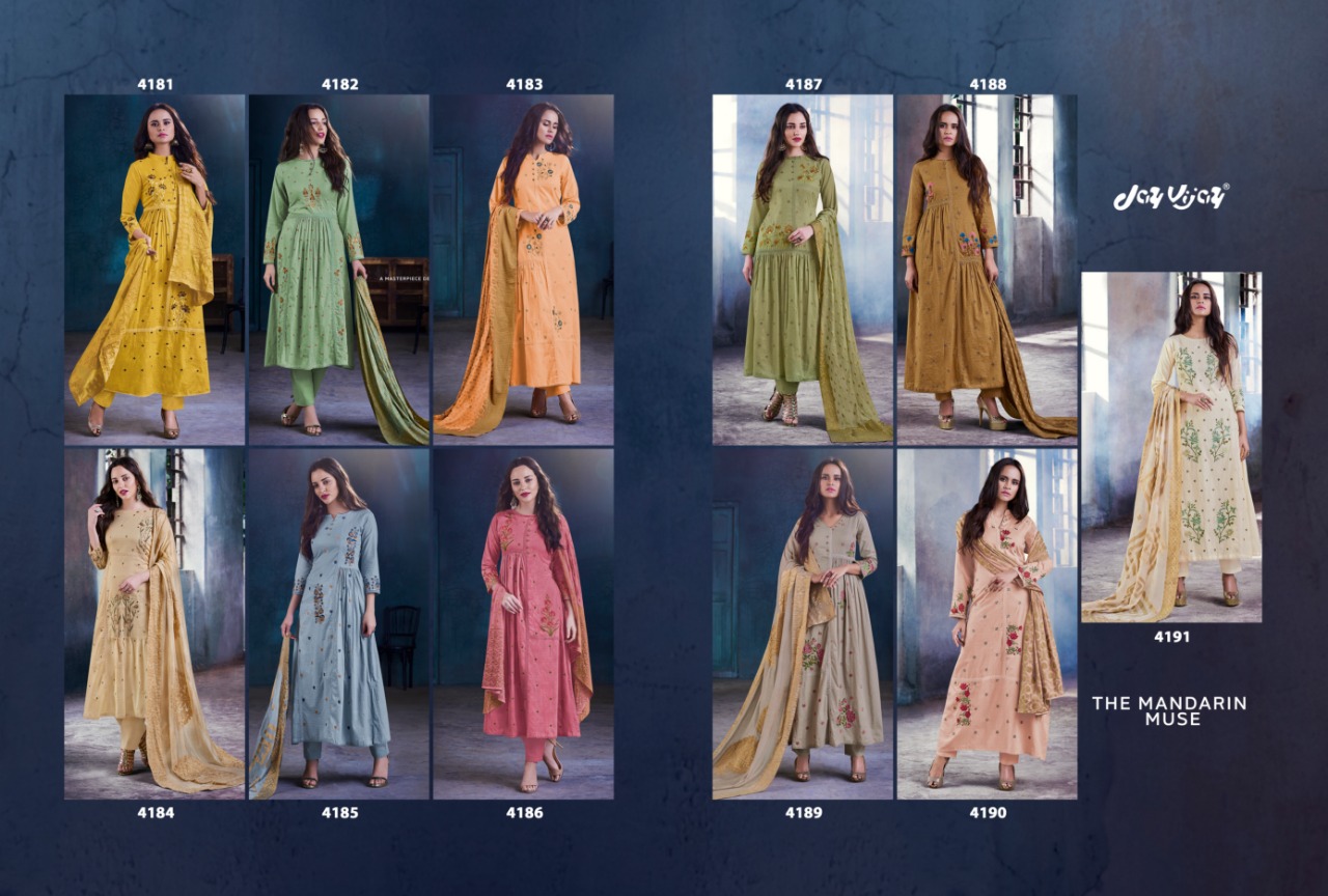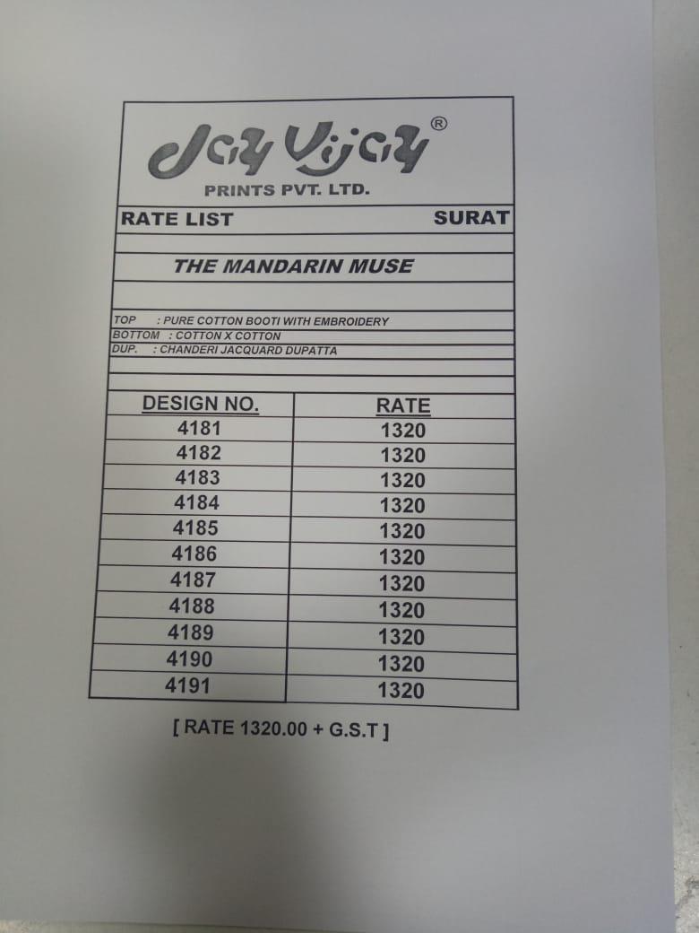 Buy Online The Mandarin Muse By Jay Vijay Series 4181 To 4191 Pure Cotton Embroidered Party Wear Suits Wholesale Supplier Nd Dealer Gujarat 11 Pcs of Full Catalogue at Wholesale Price. Looking for The Mandarin Muse By Jay Vijay Series 4181 To 4191 Pure Cotton Embroidered Party Wear Suits Wholesale Supplier Nd Dealer Gujarat Full Catalouge at Best Price? Buy Now The Mandarin Muse By Jay Vijay Series 4181 To 4191 Pure Cotton Embroidered Party Wear Suits Wholesale Supplier Nd Dealer Gujarat at Wholesale Rate of Rs 14520 with Total 11 Pcs from authroized dealer and supplier of JAY VIJAY Brand. Cost of Each piece is just only Rs 1320 which is very low and affordable price to resale the product in your retail store ,This is Surat based Wholesale Supplier & Dealer of JAY VIJAY Brand. Click on Brand name to Know more about JAY VIJAY Brand's products.Call or Whatsapp on 9898838984 for booking or enquiry