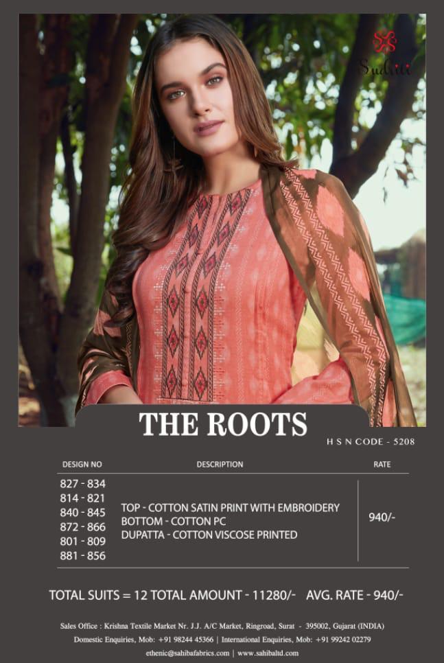 Buy Online The Roots By Sudriti Sahiba Fancy Cotton Satin Printed Salwar Kameez Catlog Wholesalr Surat 12 Pcs of Full Catalogue at Wholesale Price. Looking for The Roots By Sudriti Sahiba Fancy Cotton Satin Printed Salwar Kameez Catlog Wholesalr Surat Full Catalouge at Best Price? Buy Now The Roots By Sudriti Sahiba Fancy Cotton Satin Printed Salwar Kameez Catlog Wholesalr Surat at Wholesale Rate of Rs 11280 with Total 12 Pcs from authroized dealer and supplier of SUDRITI Brand. Cost of Each piece is just only Rs 940 which is very low and affordable price to resale the product in your retail store ,This is Surat based Wholesale Supplier & Dealer of SUDRITI Brand. Click on Brand name to Know more about SUDRITI Brand's products.Call or Whatsapp on 9898838984 for booking or enquiry