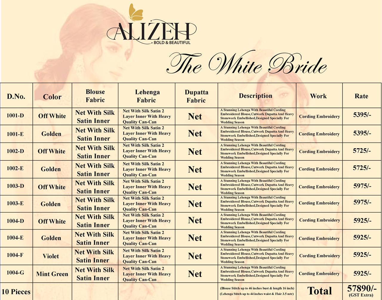 Buy Online The White Bride Series 1001 To 1004 By Alizeh Single And Set Stockiest And Supplier From Surat 10 Pcs of Full Catalogue at Wholesale Price. Looking for The White Bride Series 1001 To 1004 By Alizeh Single And Set Stockiest And Supplier From Surat Full Catalouge at Best Price? Buy Now The White Bride Series 1001 To 1004 By Alizeh Single And Set Stockiest And Supplier From Surat at Wholesale Rate of Rs 0 with Total 10 Pcs from authroized dealer and supplier of Brand. Cost of Each piece is just only Rs 0 which is very low and affordable price to resale the product in your retail store ,This is Surat based Wholesale Supplier & Dealer of Brand. Click on Brand name to Know more about Brand's products.Call or Whatsapp on 9898838984 for booking or enquiry