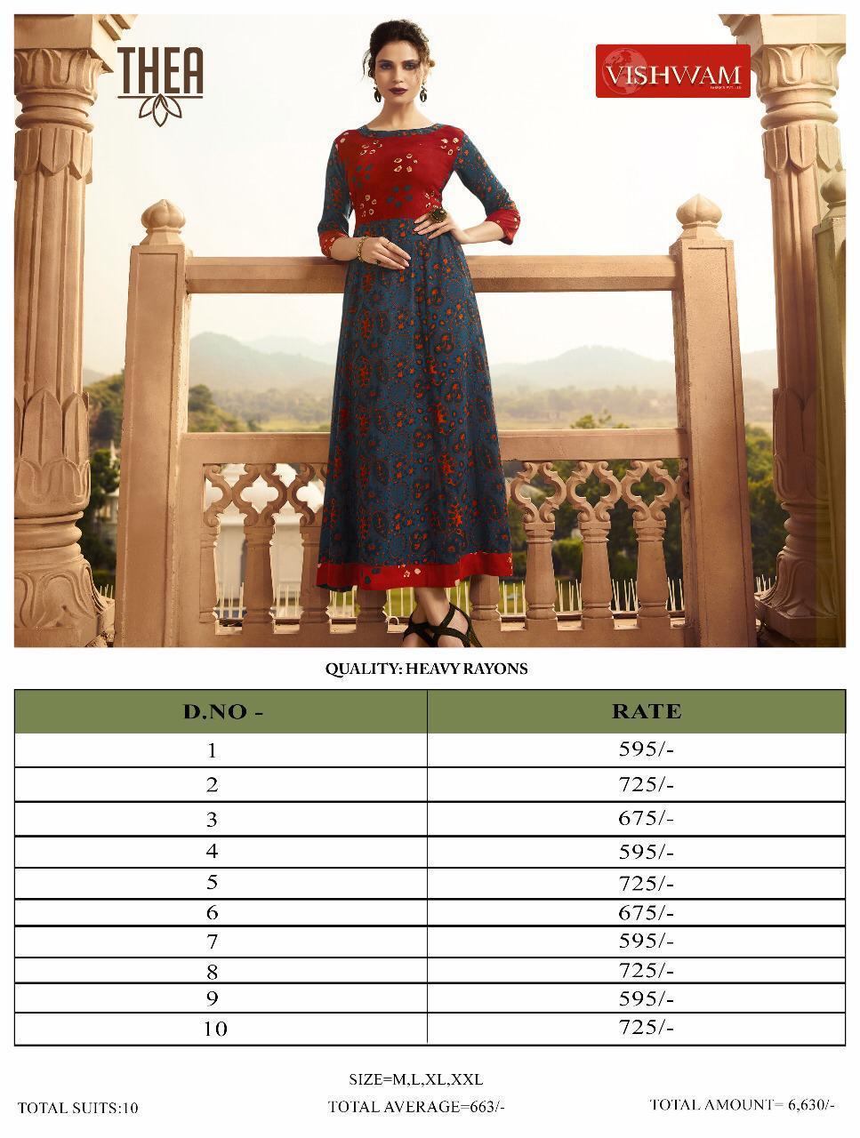 Buy Online Thea By Vishwam 1 Series Fancy Reyon Printed Kurti Collection Wholesaler Surat 10 Pcs of Full Catalogue at Wholesale Price. Looking for Thea By Vishwam 1 Series Fancy Reyon Printed Kurti Collection Wholesaler Surat Full Catalouge at Best Price? Buy Now Thea By Vishwam 1 Series Fancy Reyon Printed Kurti Collection Wholesaler Surat at Wholesale Rate of Rs 6630 with Total 10 Pcs from authroized dealer and supplier of Vishwam fabrics pvt ltd Brand. Cost of Each piece is just only Rs 663 which is very low and affordable price to resale the product in your retail store ,This is Surat based Wholesale Supplier & Dealer of Vishwam fabrics pvt ltd Brand. Click on Brand name to Know more about Vishwam fabrics pvt ltd Brand's products.Call or Whatsapp on 9898838984 for booking or enquiry