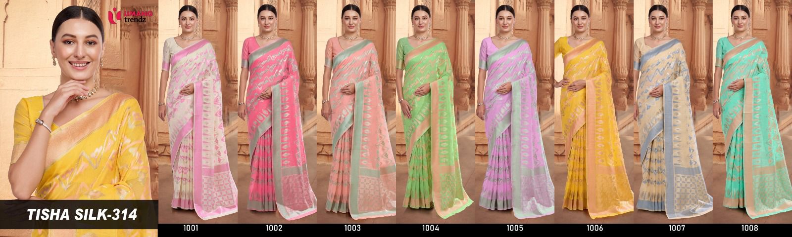 UMANG TRENDZ(FIRM OF KL ENTERPRISES) PRESENTS Catalog Name :? *TISHA 314* No of Pcs : *8* Fabric : *LILEN SILK +JECARD* Packing : Premium Pouch Bag Rate :795/- Gst extra 5% GST Regards UMANG TRENDZ? 100+single |