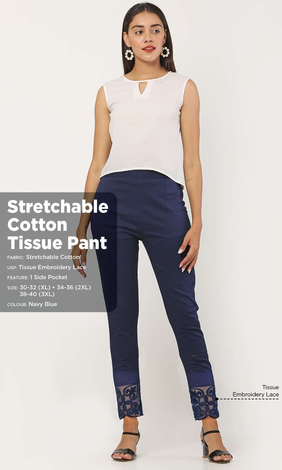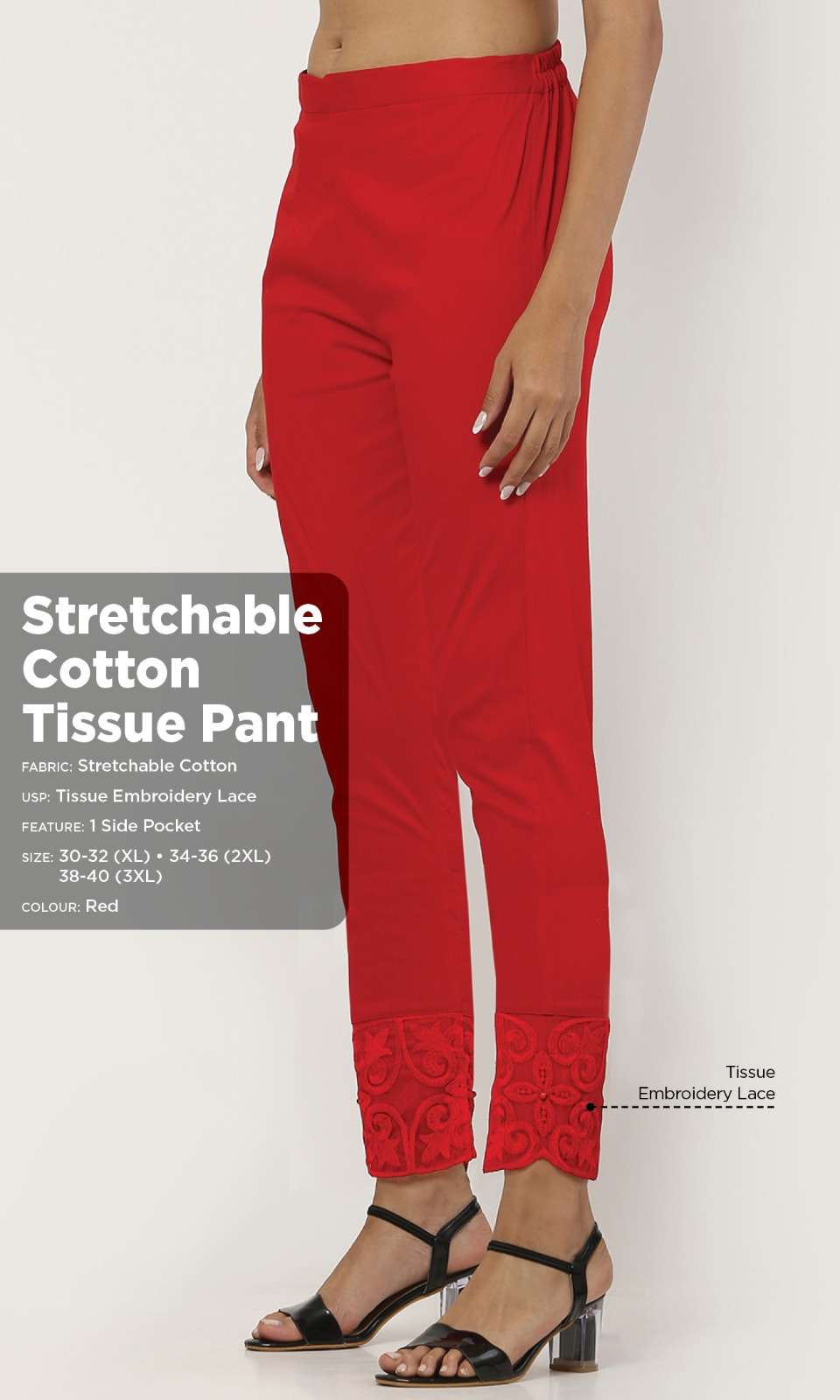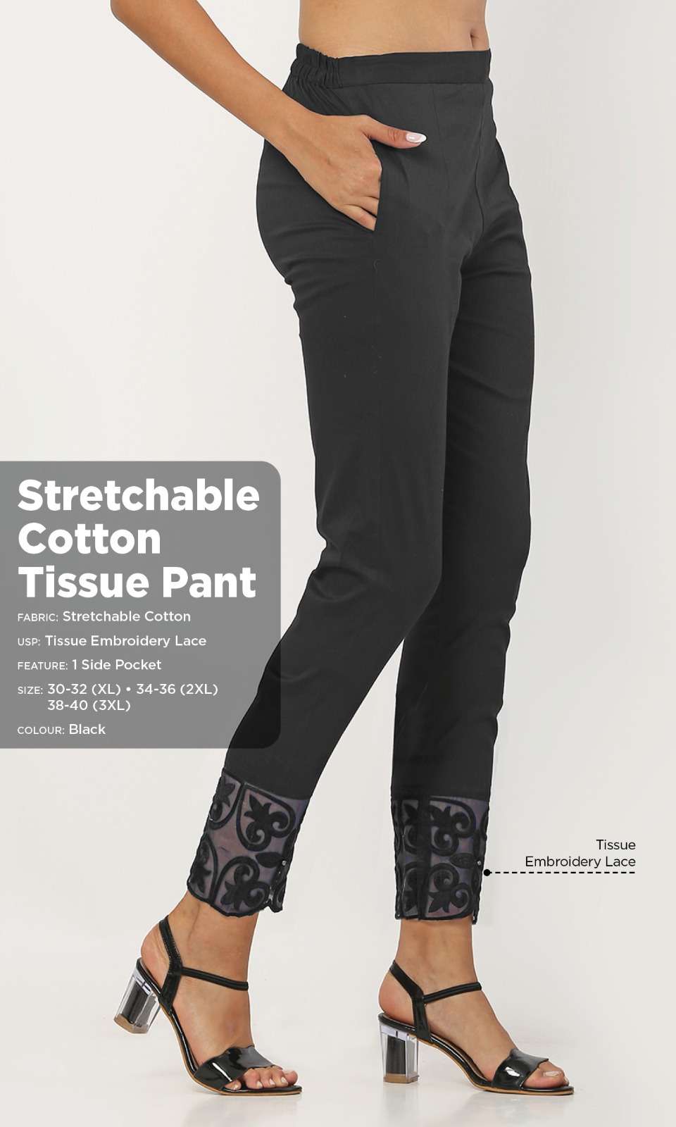 *TISSUE PANT* *Fabric:* Stretchable Cotton *Style:* Ethnic *USP:* Tissue Embroidery with Matching Pearl *Feature 2:* One Side Pocket