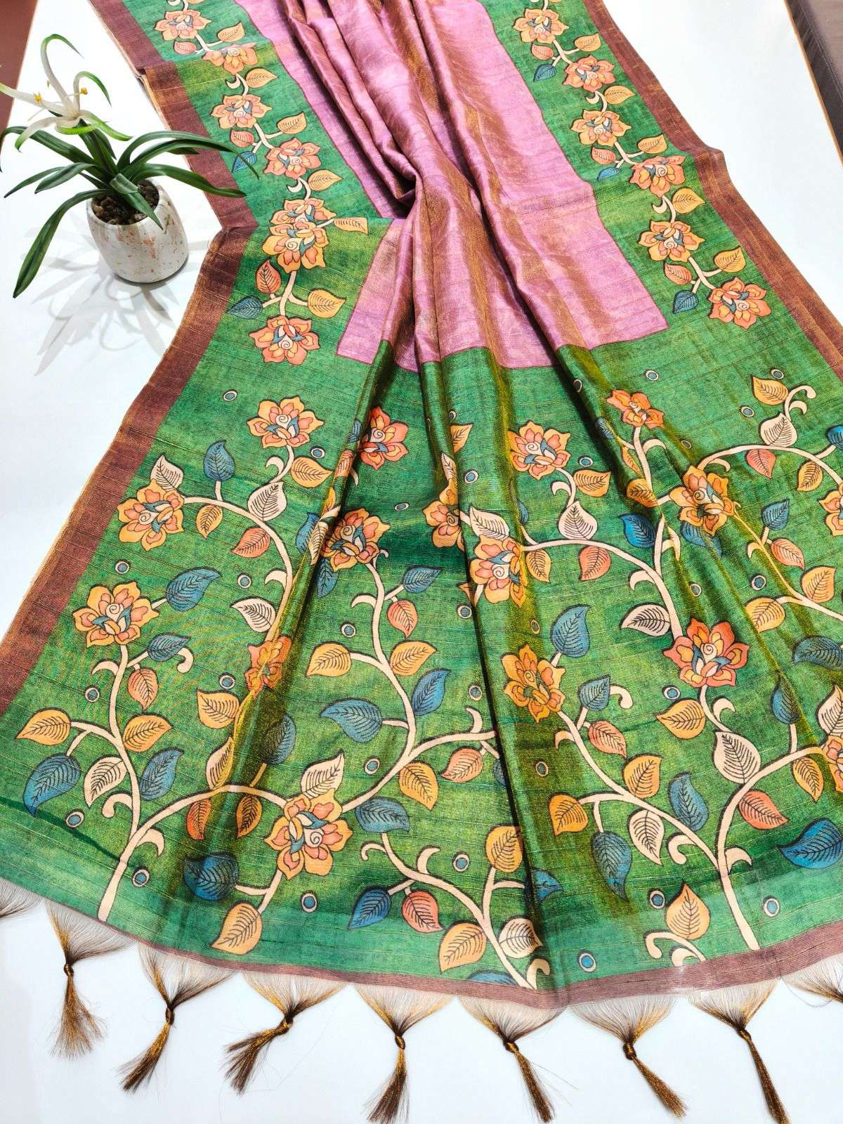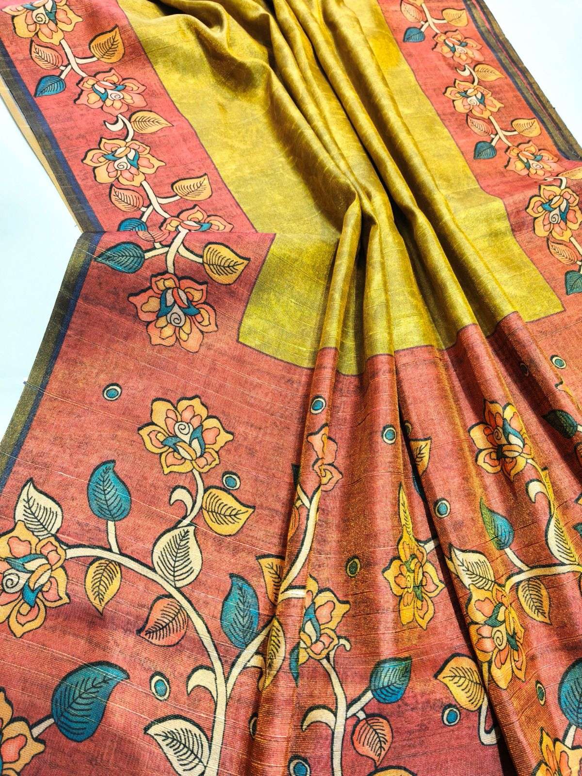 Presenting Tissue Tussar 3, a premium soft Tissue Tussar silk saree designed to give a rich and graceful appearance. Adorned with a traditional floral print and a classic contrast printed border, this saree stands out with its unique weaving texture that gives a pure-saree look. Comes with a contrast blouse piece, perfect for festive and traditional occasions. ✨ Premium soft Tissue Tussar silk Ready stock available 🌹 |