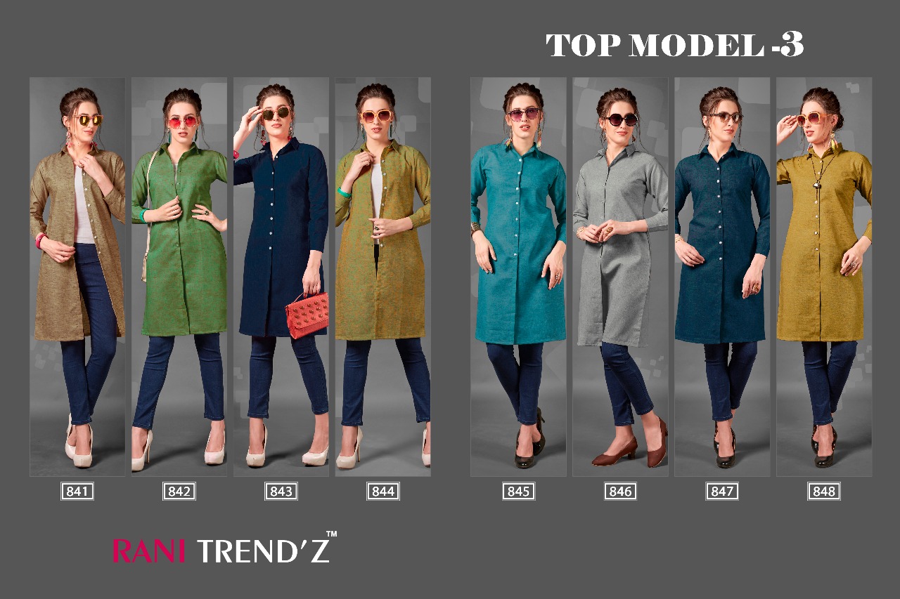 Buy Online Top Model Vol 3 By Rani Trendz 841 Series Fancy Heavy Reyon Kurti Catlog Wholesale Dealer Surat 8 Pcs of Full Catalogue at Wholesale Price. Looking for Top Model Vol 3 By Rani Trendz 841 Series Fancy Heavy Reyon Kurti Catlog Wholesale Dealer Surat Full Catalouge at Best Price? Buy Now Top Model Vol 3 By Rani Trendz 841 Series Fancy Heavy Reyon Kurti Catlog Wholesale Dealer Surat at Wholesale Rate of Rs 2976 with Total 8 Pcs from authroized dealer and supplier of RANI TRENDZ Brand. Cost of Each piece is just only Rs 372 which is very low and affordable price to resale the product in your retail store ,This is Surat based Wholesale Supplier & Dealer of RANI TRENDZ Brand. Click on Brand name to Know more about RANI TRENDZ Brand's products.Call or Whatsapp on 9898838984 for booking or enquiry