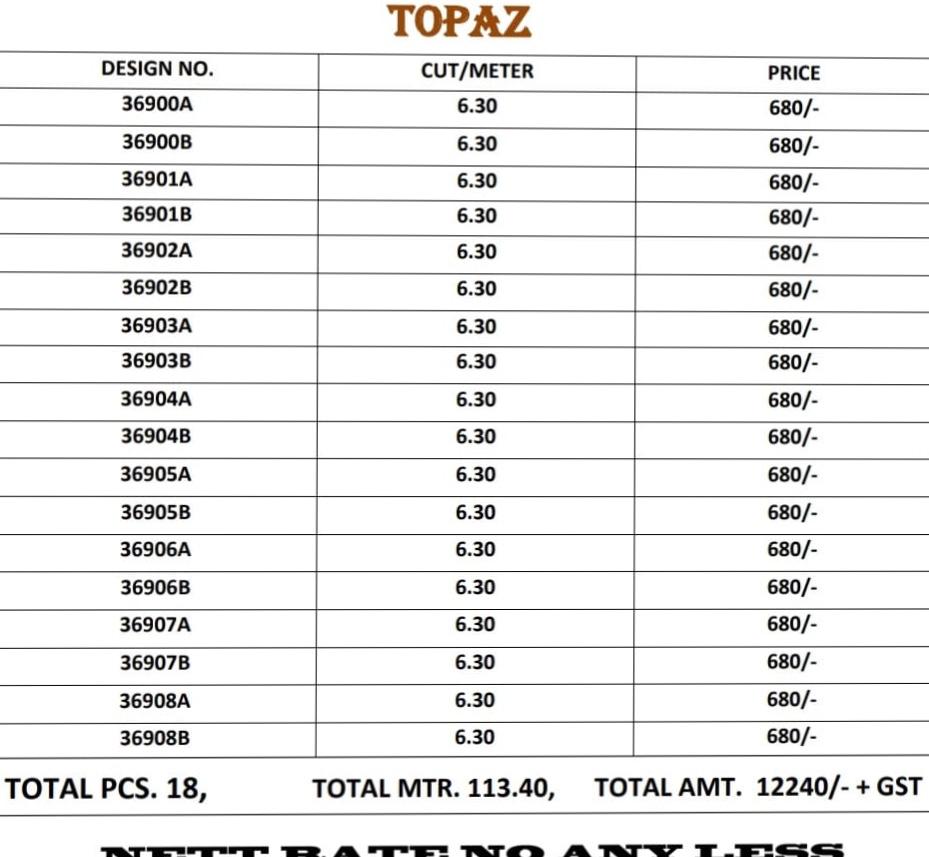 Buy Online Topaz By Bela Series 36900a To 36908ab Sarees Wholesale Supplier And Dealer Surat 18 Pcs of Full Catalogue at Wholesale Price. Looking for Topaz By Bela Series 36900a To 36908ab Sarees Wholesale Supplier And Dealer Surat Full Catalouge at Best Price? Buy Now Topaz By Bela Series 36900a To 36908ab Sarees Wholesale Supplier And Dealer Surat at Wholesale Rate of Rs 12240 with Total 18 Pcs from authroized dealer and supplier of BELA Brand. Cost of Each piece is just only Rs 680 which is very low and affordable price to resale the product in your retail store ,This is Surat based Wholesale Supplier & Dealer of BELA Brand. Click on Brand name to Know more about BELA Brand's products.Call or Whatsapp on 9898838984 for booking or enquiry
