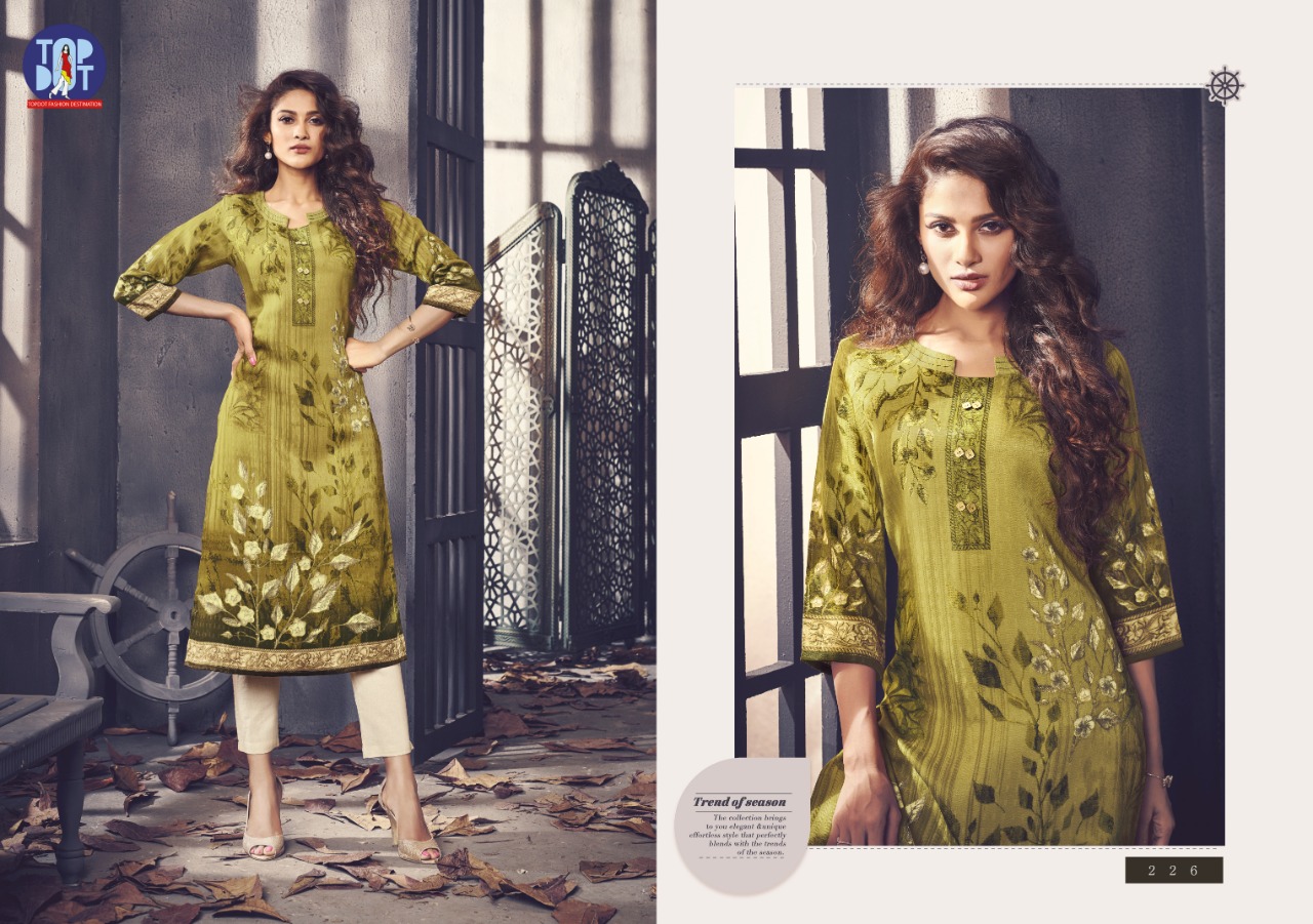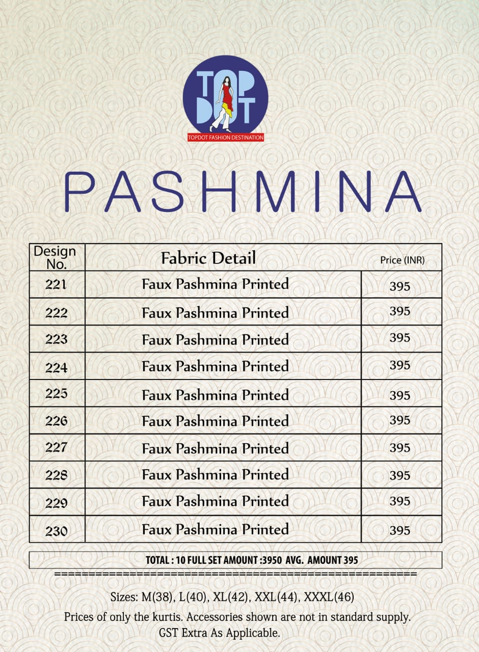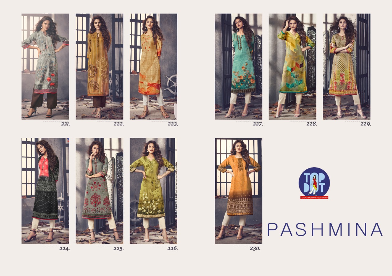 Buy Online Topdot Pashmina Kurtis Wholesale Supplier Surat 10 Pcs of Full Catalogue at Wholesale Price. Looking for Topdot Pashmina Kurtis Wholesale Supplier Surat Full Catalouge at Best Price? Buy Now Topdot Pashmina Kurtis Wholesale Supplier Surat at Wholesale Rate of Rs 3950 with Total 10 Pcs from authroized dealer and supplier of BRAND'S Brand. Cost of Each piece is just only Rs 395 which is very low and affordable price to resale the product in your retail store ,This is Surat based Wholesale Supplier & Dealer of BRAND'S Brand. Click on Brand name to Know more about BRAND'S Brand's products.Call or Whatsapp on 9898838984 for booking or enquiry