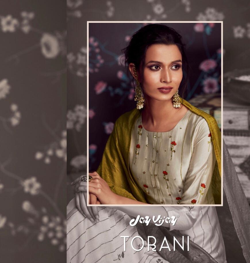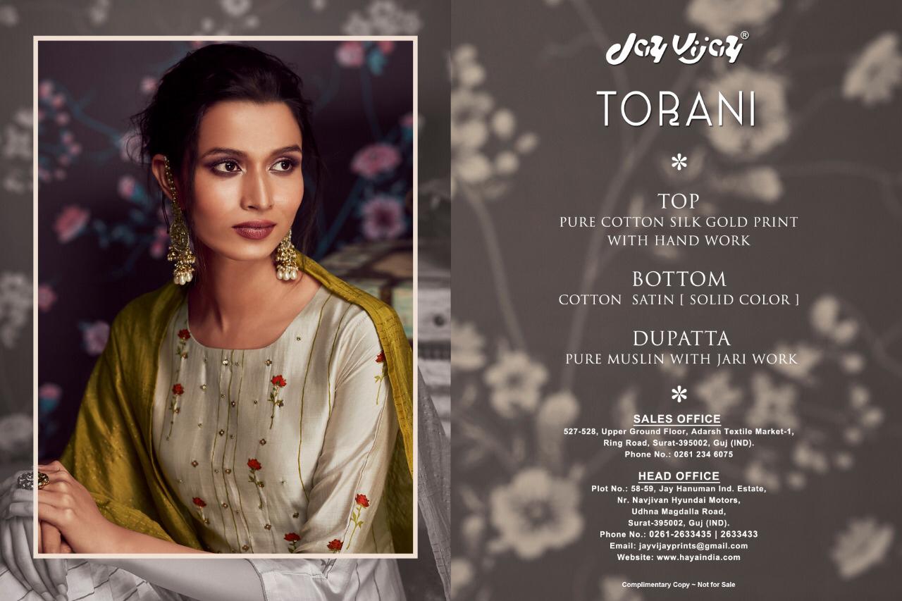 Brand - Jay Vijya . Catlog name - Torani . 10 Designs Singal Colour Fabric Details Top = Pure Cotton Silk Gold Print With Hand Work Bottom = Pure Cotton Satin(Solid Color) Dupatta = Pure Muslin Silk With Jari Work Total pieces = 10 Rate = 1260/- Delivery 4-5 days . Set To Set. GST 5 Percent Extra |