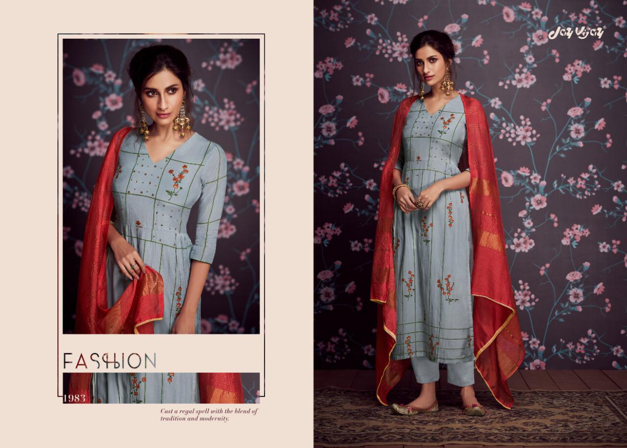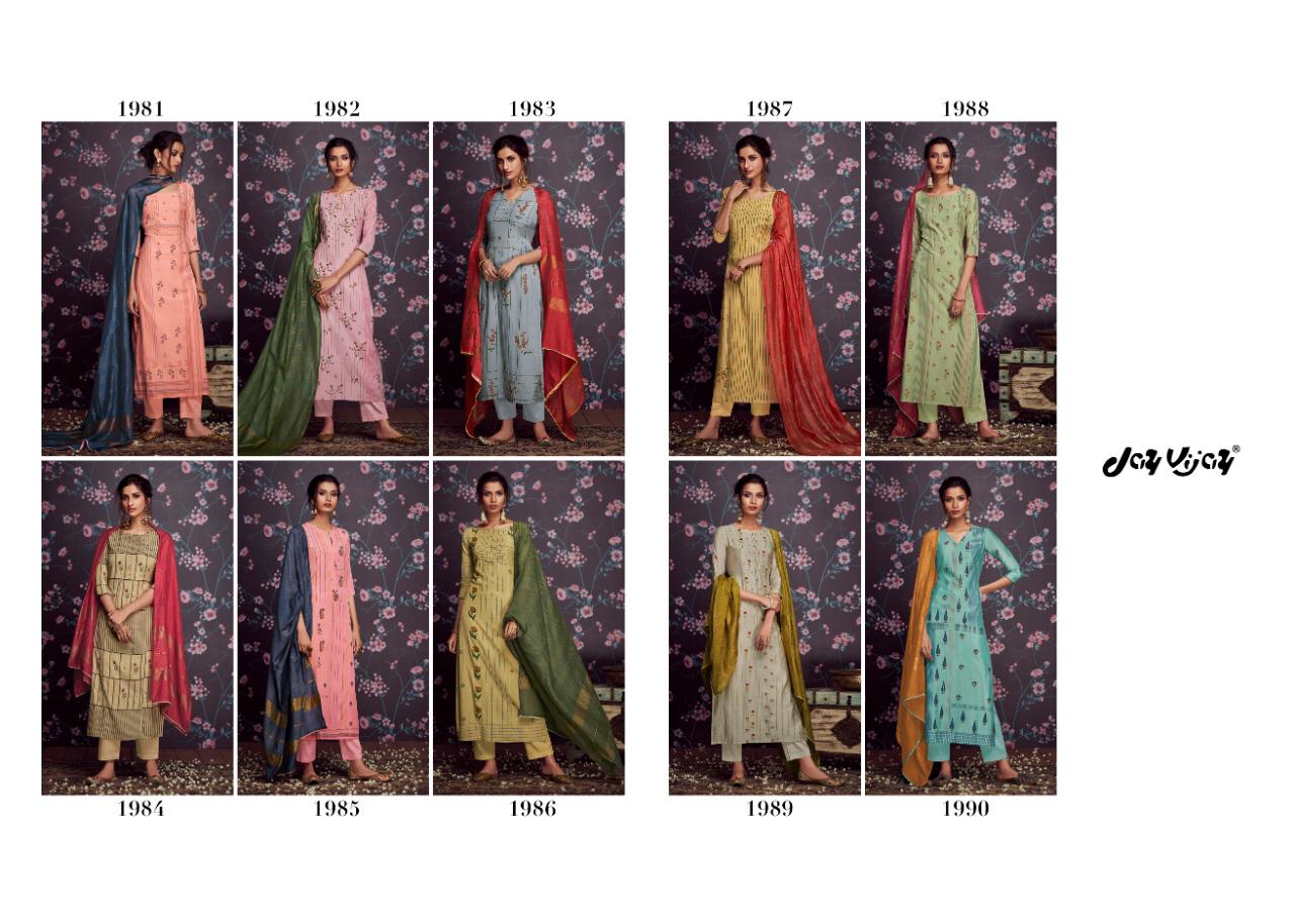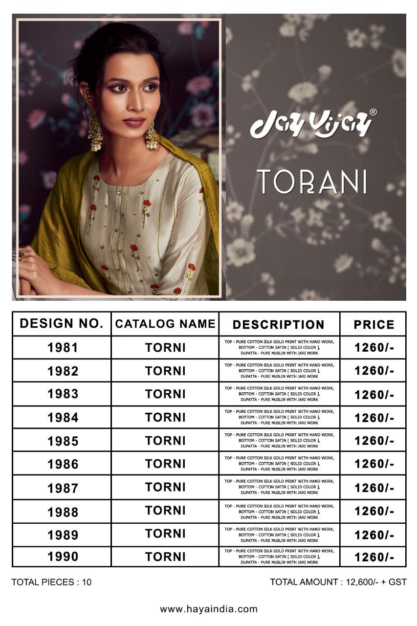 Buy Online Torani By Jai Vijay Series 1981 To 1990 Cotton Silk Suits Wholesale Supplier Gujarat 10 Pcs of Full Catalogue at Wholesale Price. Looking for Torani By Jai Vijay Series 1981 To 1990 Cotton Silk Suits Wholesale Supplier Gujarat Full Catalouge at Best Price? Buy Now Torani By Jai Vijay Series 1981 To 1990 Cotton Silk Suits Wholesale Supplier Gujarat at Wholesale Rate of Rs 12600 with Total 10 Pcs from authroized dealer and supplier of JAY VIJAY Brand. Cost of Each piece is just only Rs 1260 which is very low and affordable price to resale the product in your retail store ,This is Surat based Wholesale Supplier & Dealer of JAY VIJAY Brand. Click on Brand name to Know more about JAY VIJAY Brand's products.Call or Whatsapp on 9898838984 for booking or enquiry