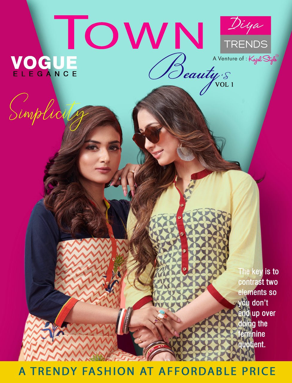 Buy Online Town Beautys Vol 1 By Diya Kajal Style 1001 Series Fancy Loan Cotton Kurti Catlog Wholesale Dealer Surat 20 Pcs of Full Catalogue at Wholesale Price. Looking for Town Beautys Vol 1 By Diya Kajal Style 1001 Series Fancy Loan Cotton Kurti Catlog Wholesale Dealer Surat Full Catalouge at Best Price? Buy Now Town Beautys Vol 1 By Diya Kajal Style 1001 Series Fancy Loan Cotton Kurti Catlog Wholesale Dealer Surat at Wholesale Rate of Rs 5100 with Total 20 Pcs from authroized dealer and supplier of KAJAL STYLE Brand. Cost of Each piece is just only Rs 255 which is very low and affordable price to resale the product in your retail store ,This is Surat based Wholesale Supplier & Dealer of KAJAL STYLE Brand. Click on Brand name to Know more about KAJAL STYLE Brand's products.Call or Whatsapp on 9898838984 for booking or enquiry