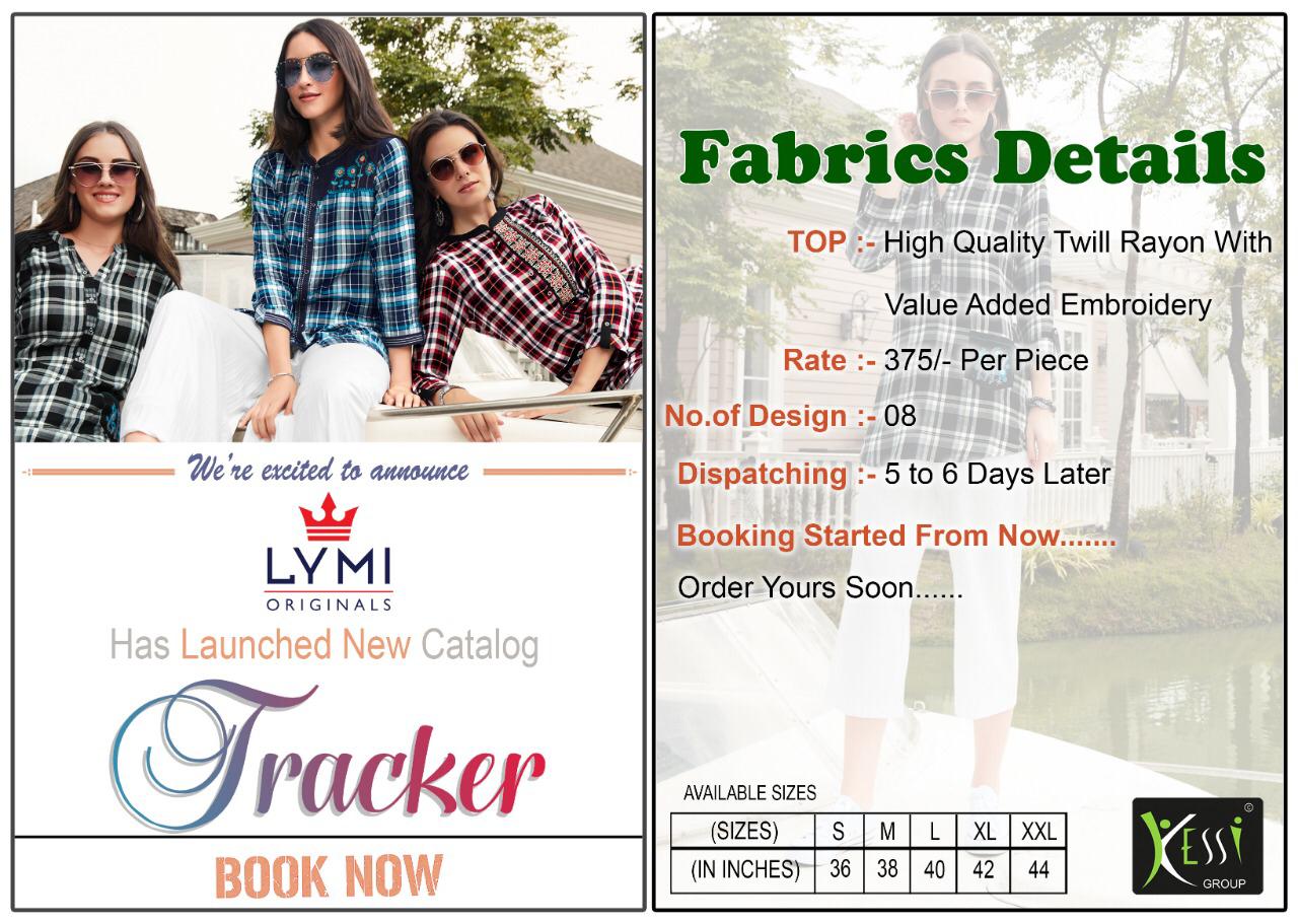 ? *LYMI (Kessi Fabrics Pvt. Ltd.)* has launched _Catalog name_ : *Tracker* ? _Fabric Details_ ? ?Top :- High Quality Twill Rayon with Value Added Embroidery ?Total Design :- 8 ?Rate:- Rs.375/- per Piece ?Size;- S-36, M-38, L-40, XL-42, XXL-44 ?Dispatching 5 to 6 days later ?Booking started from now... ?Order yours soon.... Set To Set. GST 5 Percent Extra. |