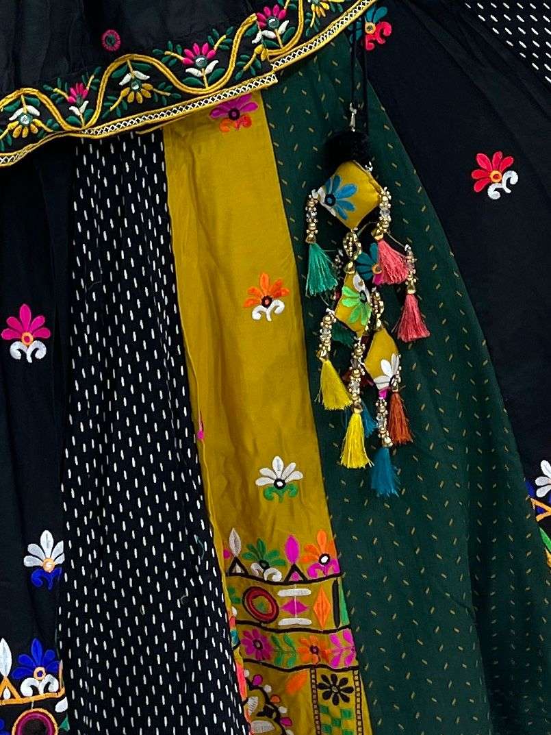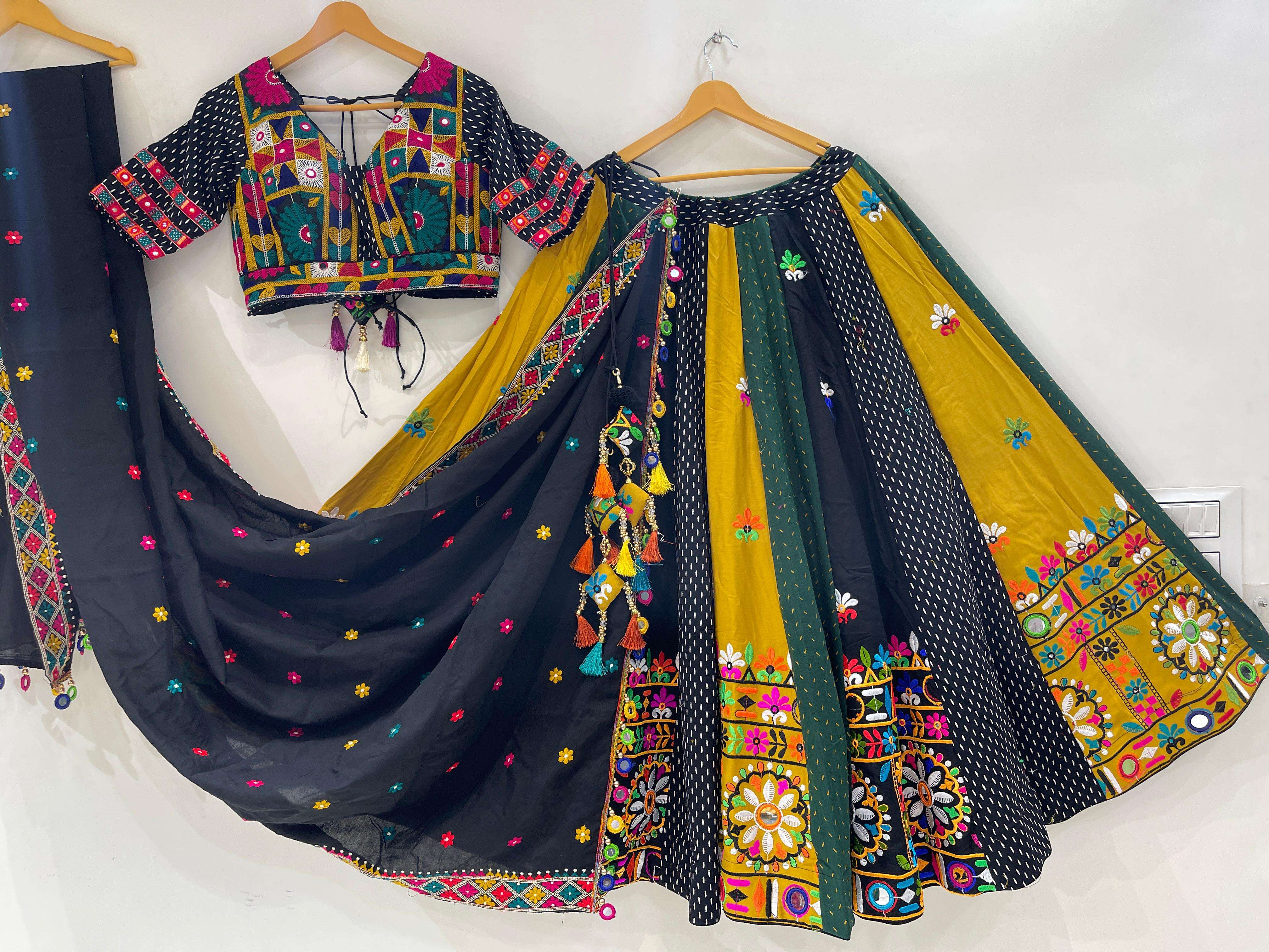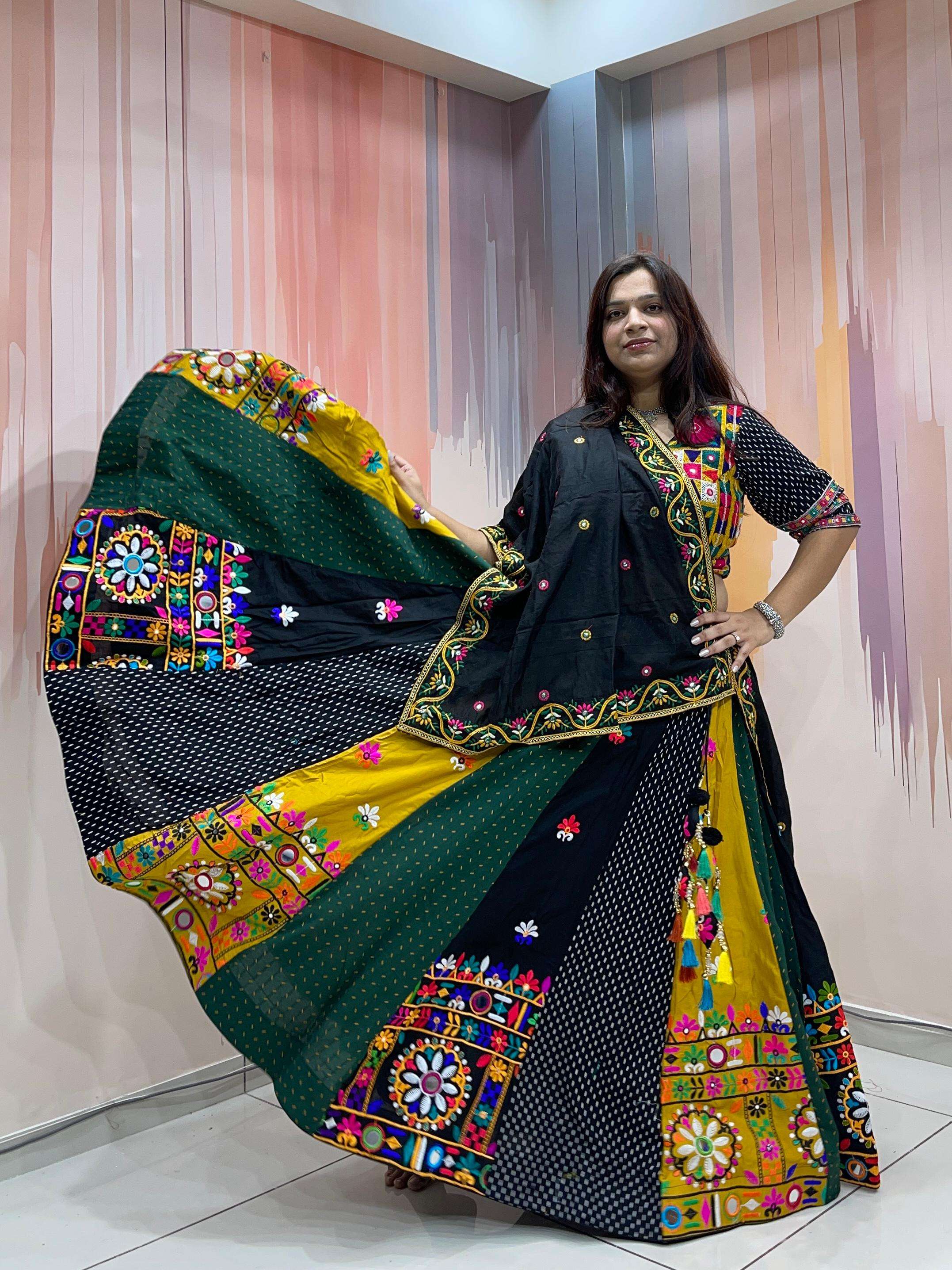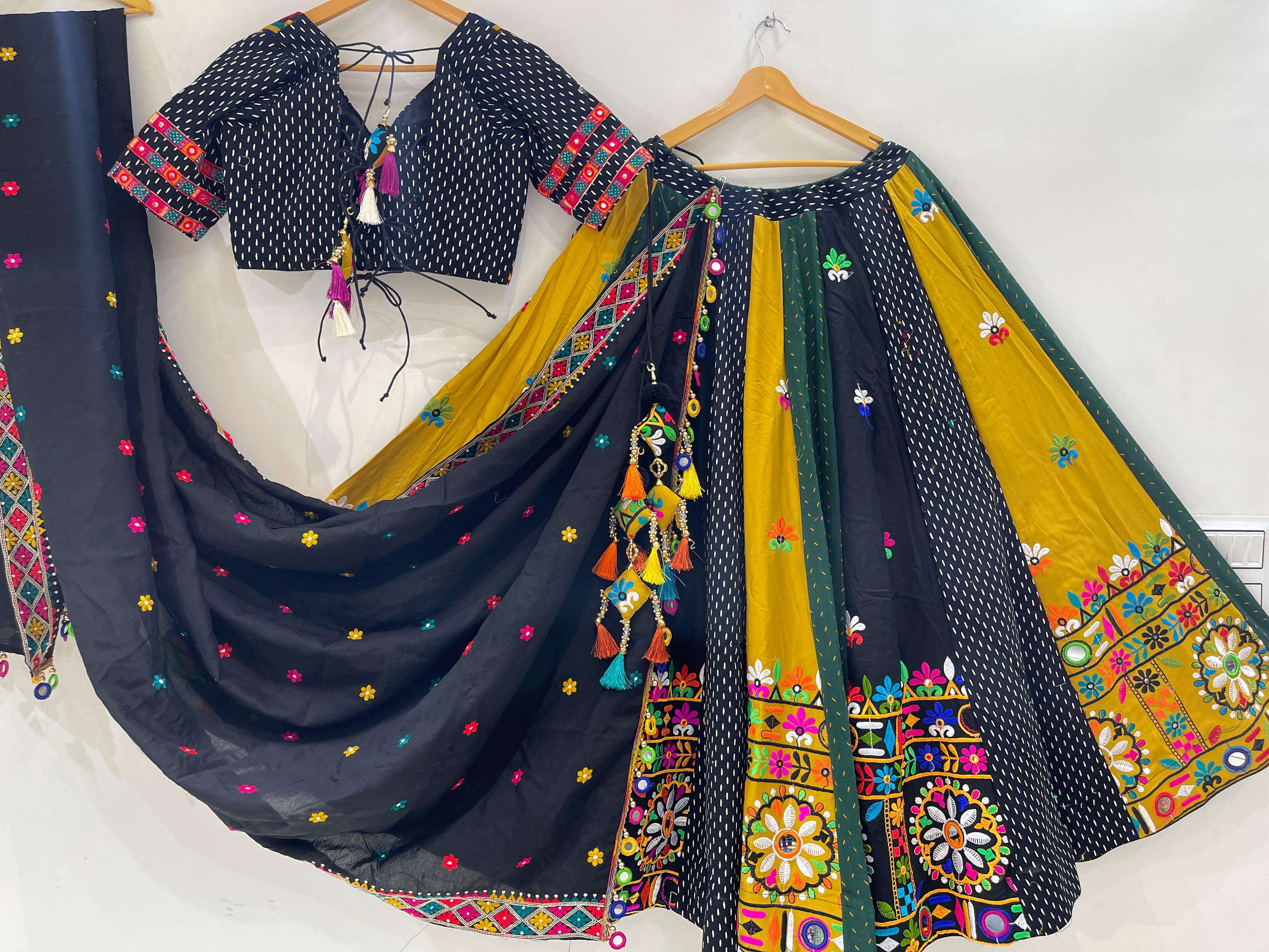 *Skirt/bottom*: *Pure Mal Cotton Sober Classic Elegant touch traditional border sober look Heavy Embroidered Cut & Sew multiple Embroidery chaniya with approx 5.5 to 6.0 Mtrs flair with good aster heavy quality side zip on waist & best quality latkan gives perfect look to lehenga* *Length 40/41”* *Upto 42”-46” waist*
