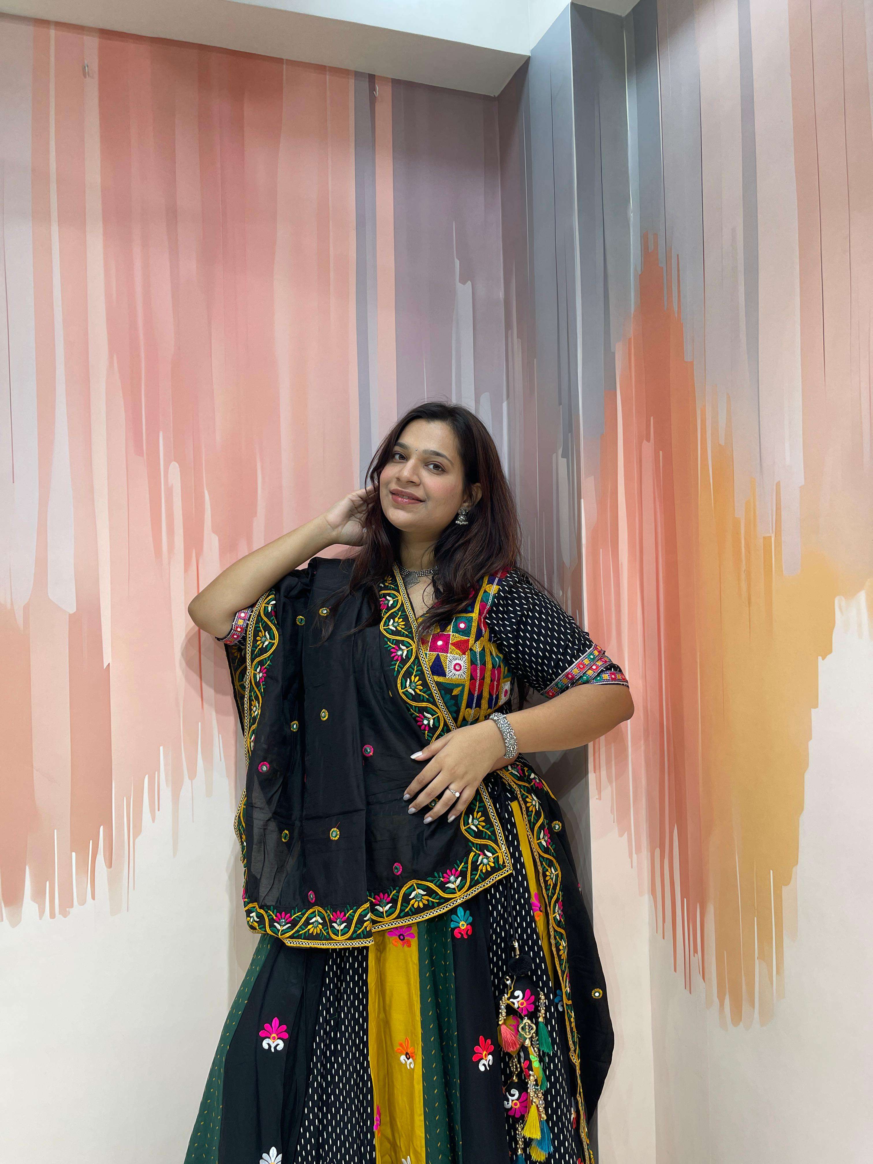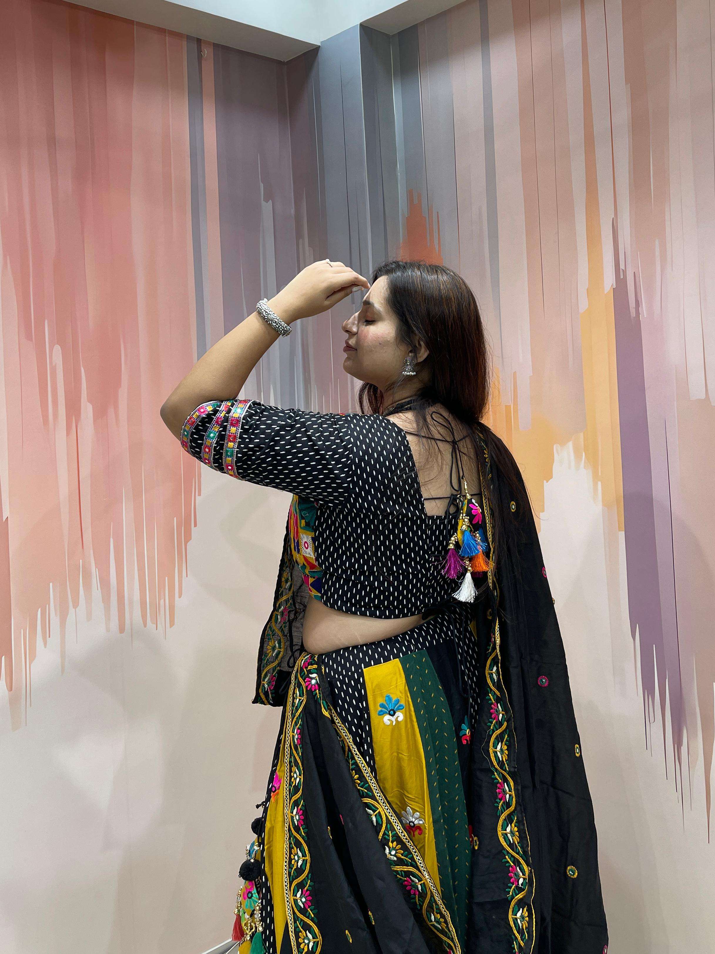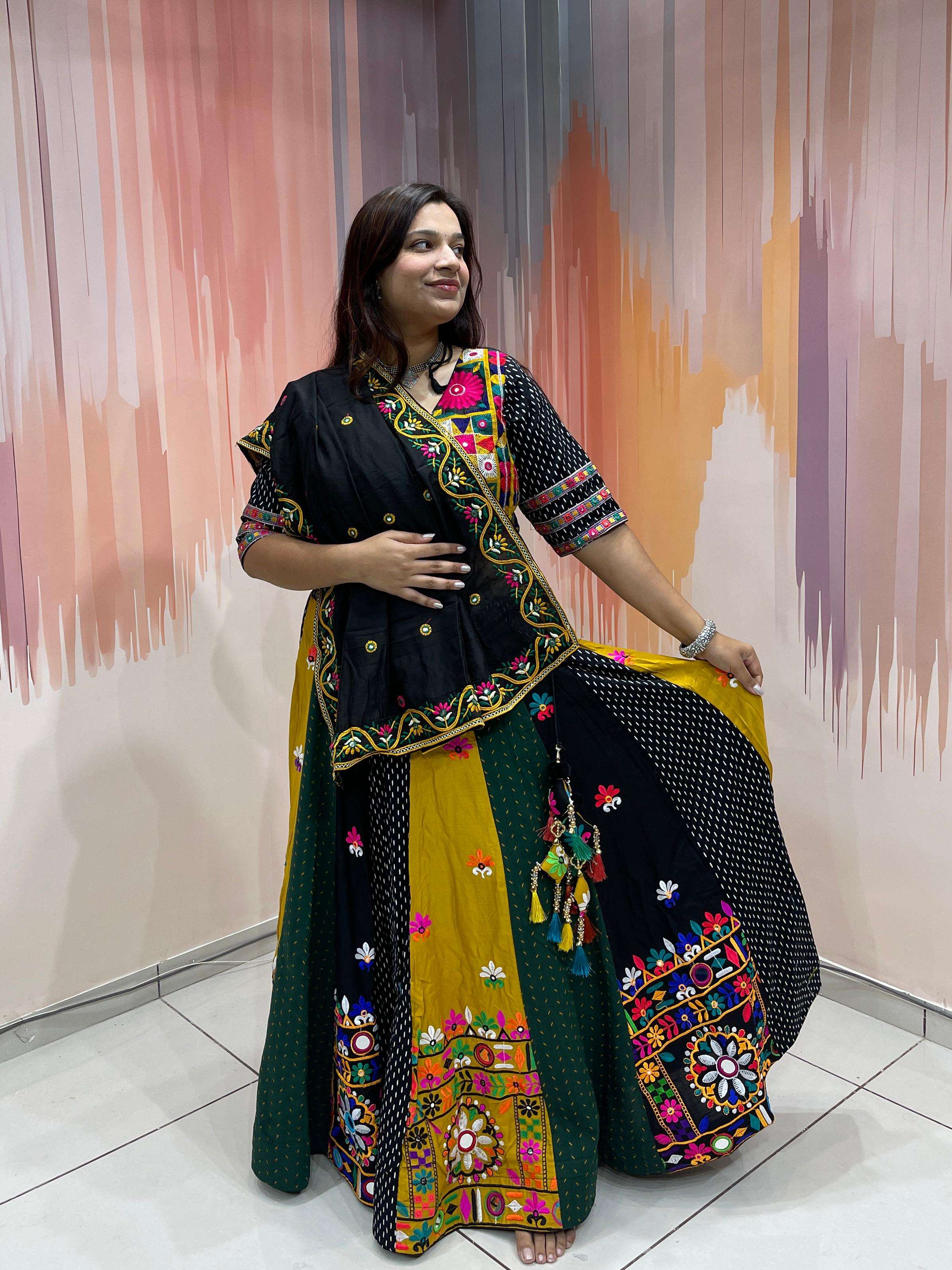 *Skirt/bottom*: *Pure Mal Cotton Sober Classic Elegant touch traditional border sober look Heavy Embroidered Cut & Sew multiple Embroidery chaniya with approx 5.5 to 6.0 Mtrs flair with good aster heavy quality side zip on waist & best quality latkan gives perfect look to lehenga* *Length 40/41”* *Upto 42”-46” waist*