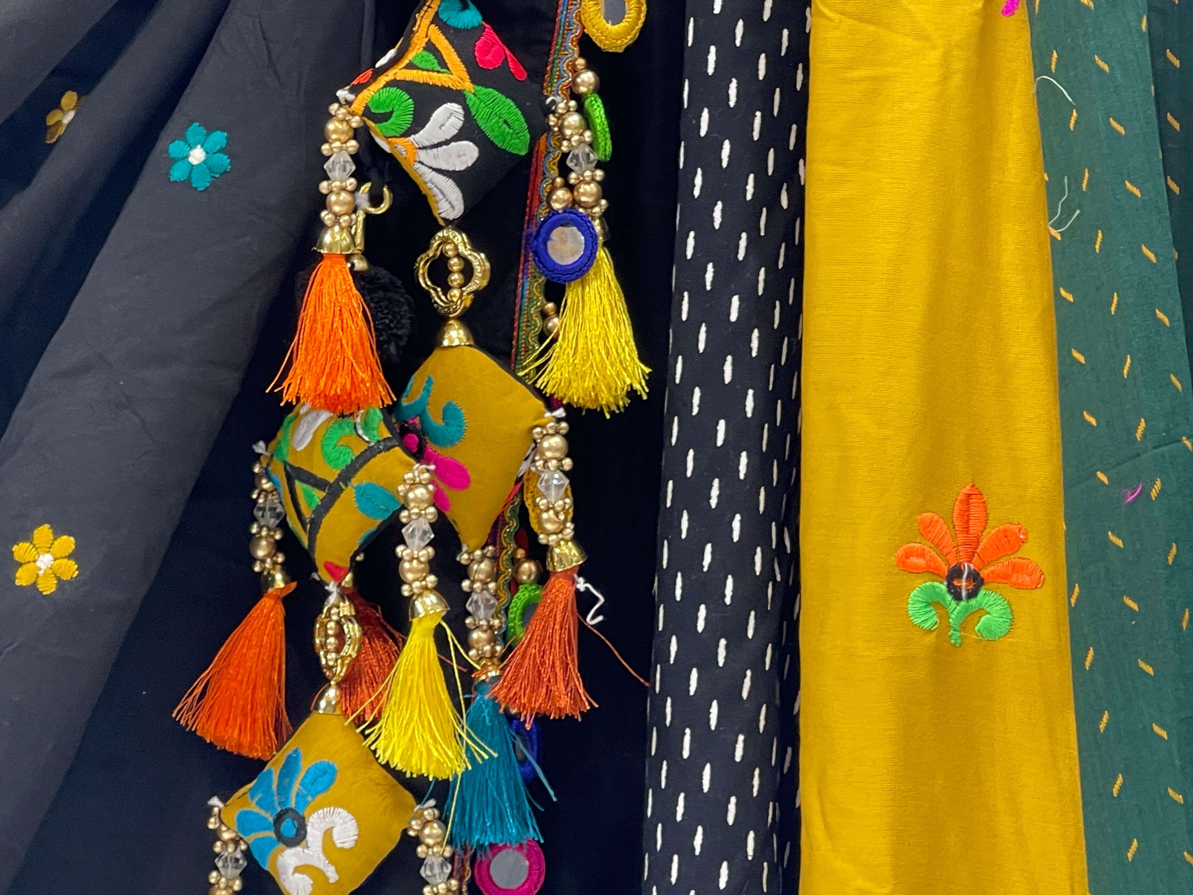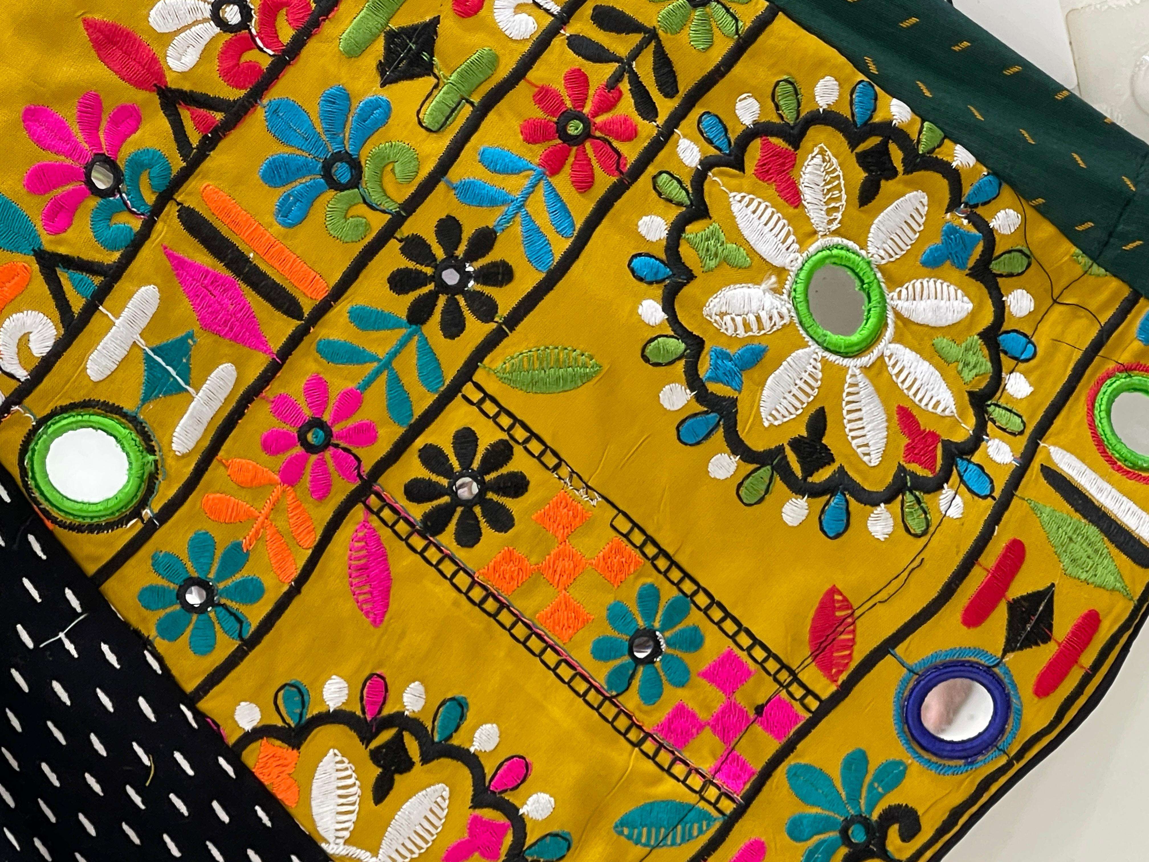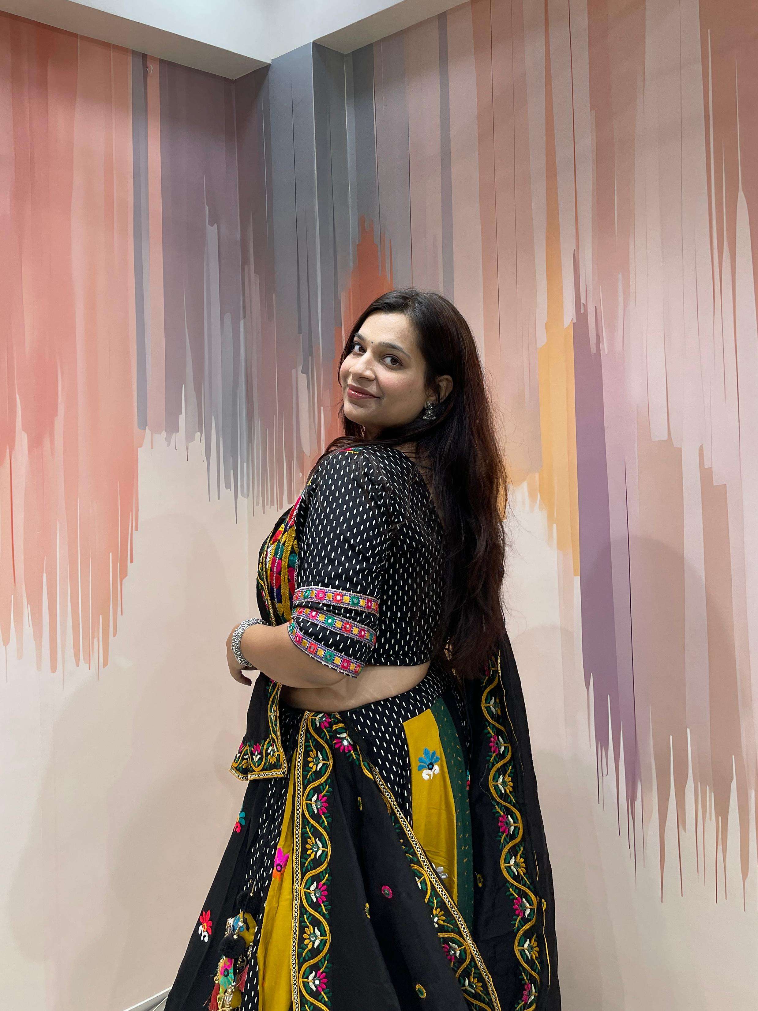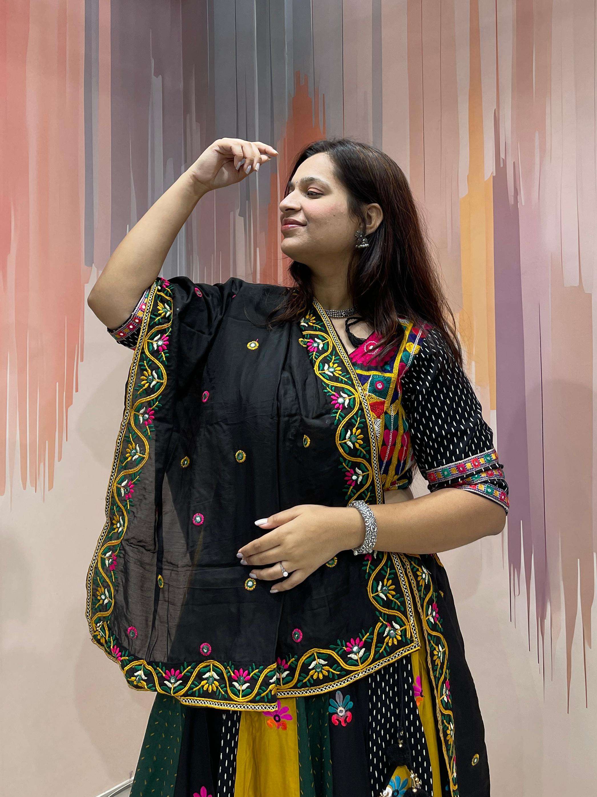 *Skirt/bottom*: *Pure Mal Cotton Sober Classic Elegant touch traditional border sober look Heavy Embroidered Cut & Sew multiple Embroidery chaniya with approx 5.5 to 6.0 Mtrs flair with good aster heavy quality side zip on waist & best quality latkan gives perfect look to lehenga* *Length 40/41”* *Upto 42”-46” waist*