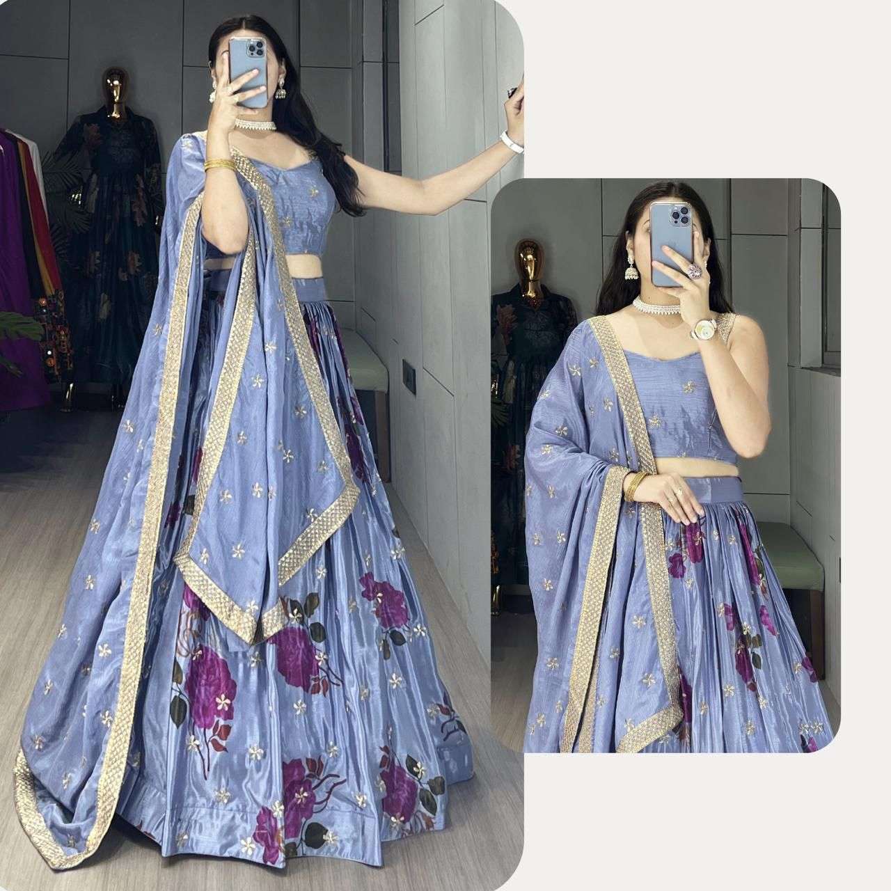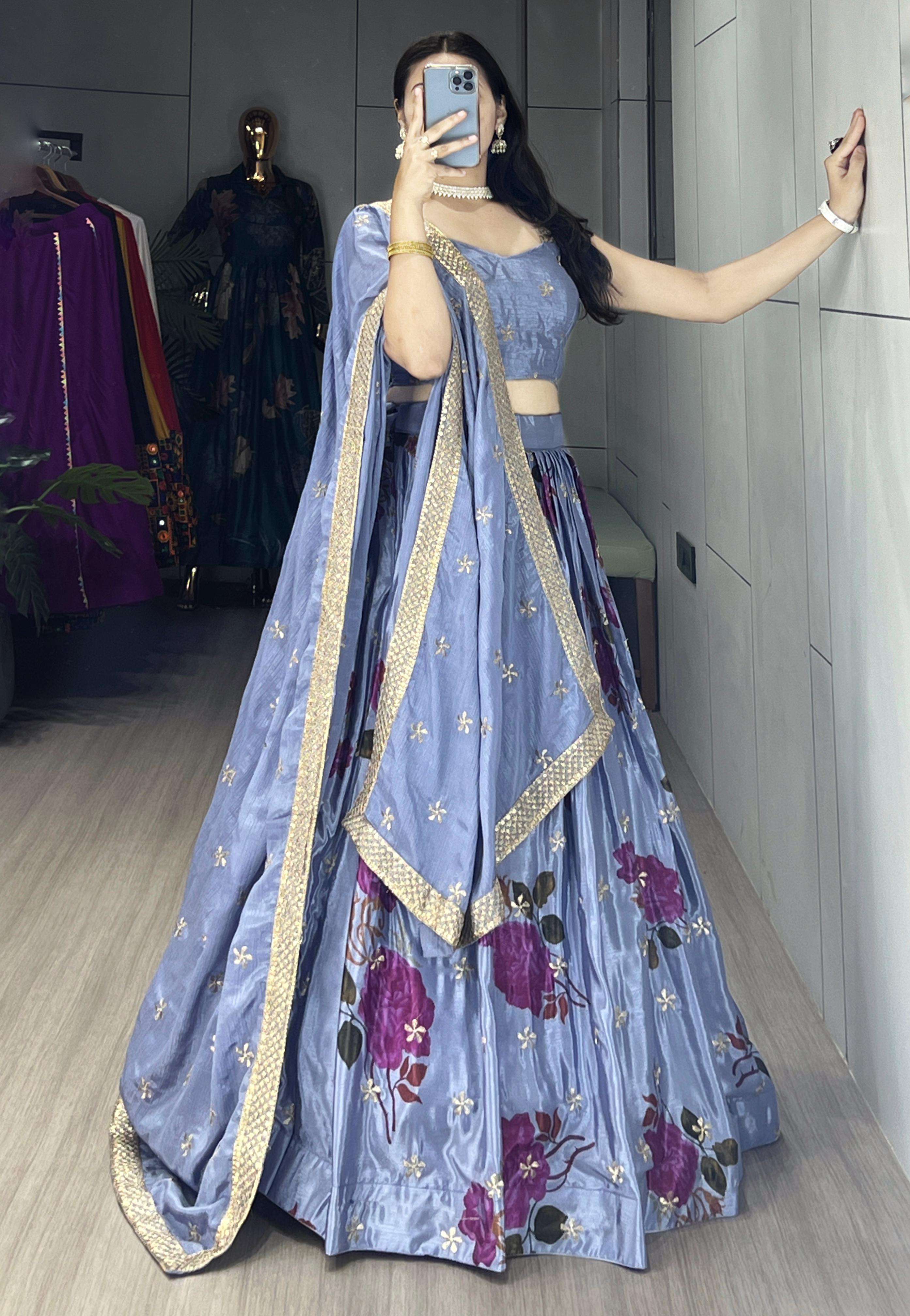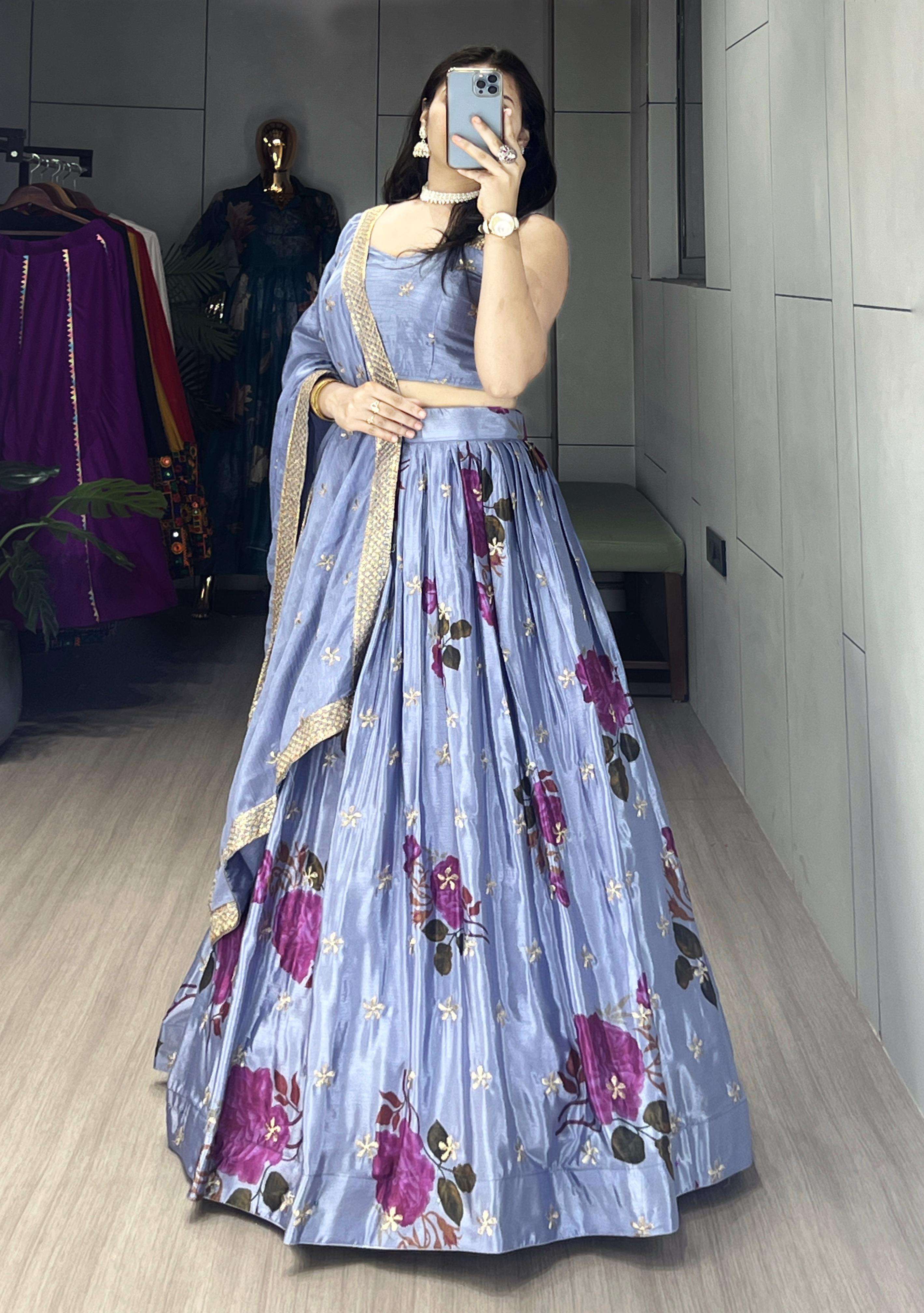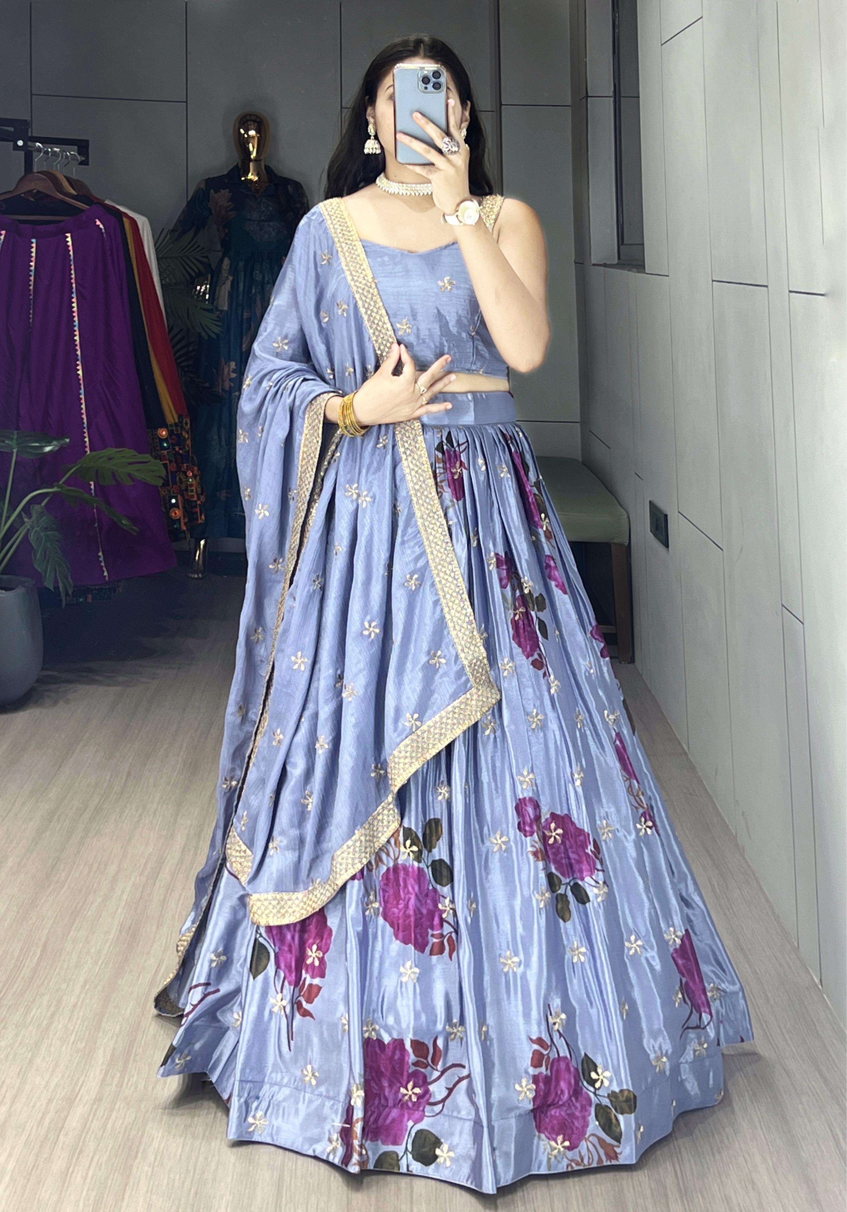 🌸 Enchanting Drapes: Step into elegance with this premium Chinon Lehenga, beautifully crafted with floral prints and intricate embroidery. Perfect for weddings, festive occasions, or any grand celebration!