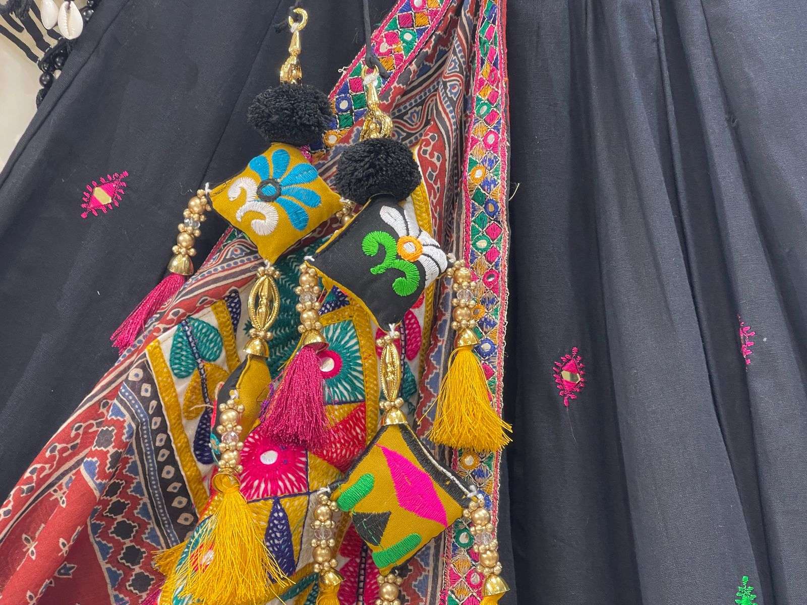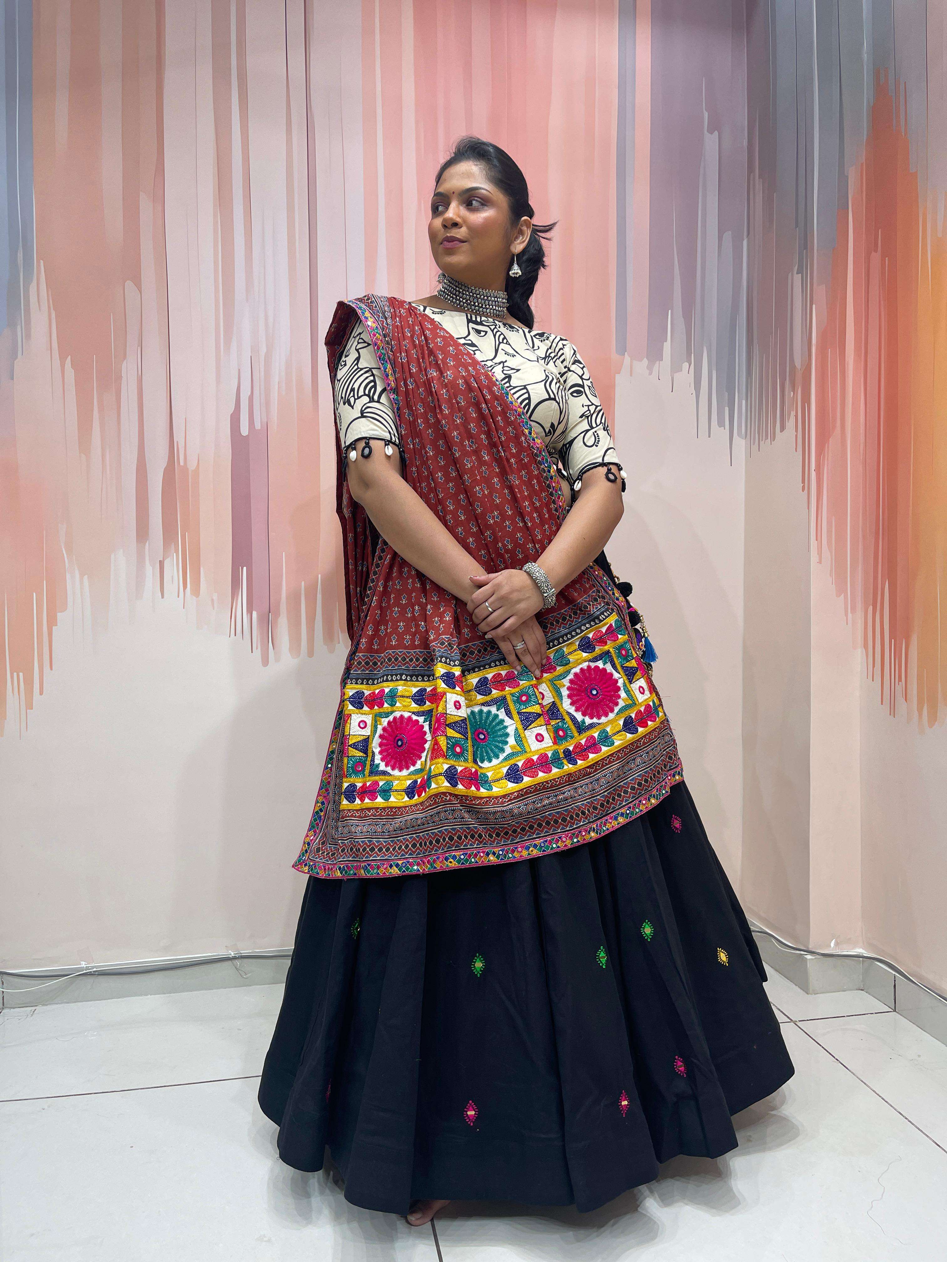 *Skirt/bottom*: *Pure Mal Cotton Sober & Elegant Small multiple floral Embroidered Classic chaniya with approx 6.0 Mtrs flair with good aster heavy quality side zip on waist & best quality latkan gives perfect look to lehenga* *Length 40/41”* *Upto 42” waist*