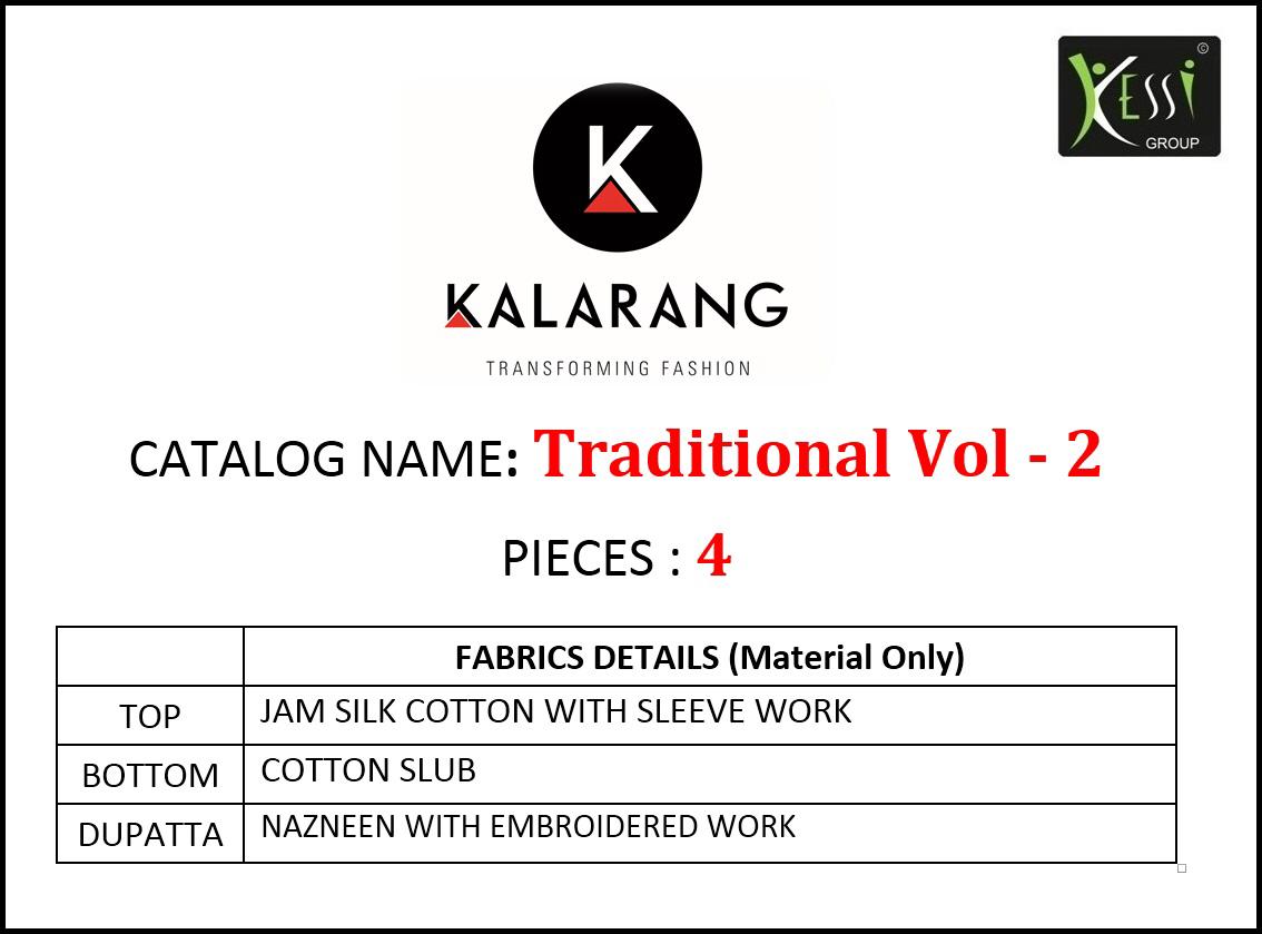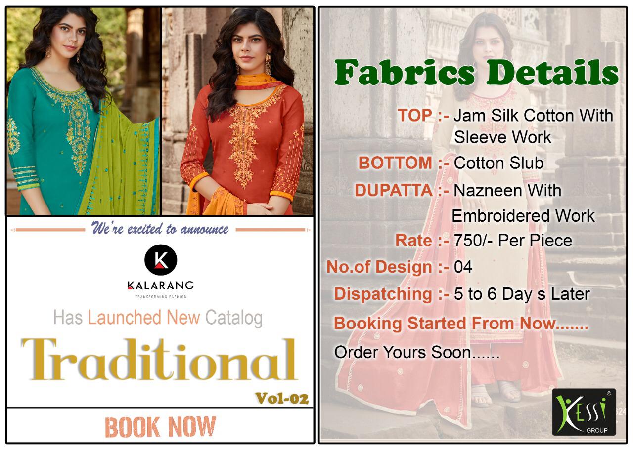 Buy Online Traditional Vol 2 By Kalarang 321 Series Fancy Jam Silk Cotton Salwar Kameez Catlog Wholesale Dealer Surat 4 Pcs of Full Catalogue at Wholesale Price. Looking for Traditional Vol 2 By Kalarang 321 Series Fancy Jam Silk Cotton Salwar Kameez Catlog Wholesale Dealer Surat Full Catalouge at Best Price? Buy Now Traditional Vol 2 By Kalarang 321 Series Fancy Jam Silk Cotton Salwar Kameez Catlog Wholesale Dealer Surat at Wholesale Rate of Rs 3000 with Total 4 Pcs from authroized dealer and supplier of KALARANG Brand. Cost of Each piece is just only Rs 750 which is very low and affordable price to resale the product in your retail store ,This is Surat based Wholesale Supplier & Dealer of KALARANG Brand. Click on Brand name to Know more about KALARANG Brand's products.Call or Whatsapp on 9898838984 for booking or enquiry