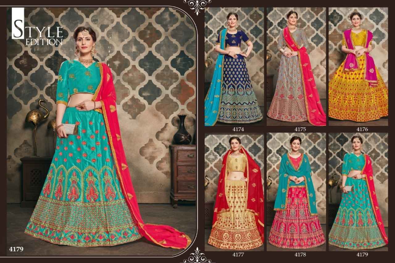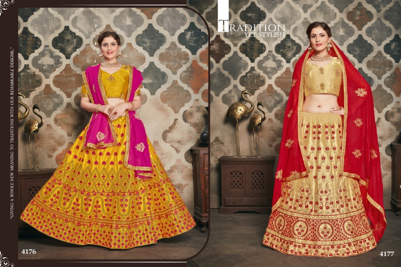 *SANSKAR STYLE -TRENDS* *RATE - 1275/-* Set To Set. GST 12 Percent Extra. Delivery from today *PURE SATIN LEHENGA* HEAVY WORK BLOUSE & DUPATTA DUPATTA COLOR THREAD WORK 6 DESIGN CATALOG |