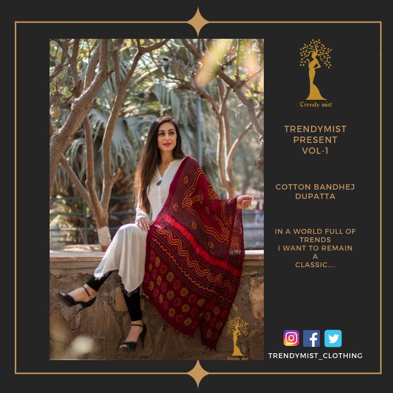 Buy Online Trendymist Vol 2 By Trandy Mist Fancy Cotton Bandhej Printed Dupatta Collection 12 Pcs of Full Catalogue at Wholesale Price. Looking for Trendymist Vol 2 By Trandy Mist Fancy Cotton Bandhej Printed Dupatta Collection Full Catalouge at Best Price? Buy Now Trendymist Vol 2 By Trandy Mist Fancy Cotton Bandhej Printed Dupatta Collection at Wholesale Rate of Rs 1500 with Total 12 Pcs from authroized dealer and supplier of Brand. Cost of Each piece is just only Rs 125 which is very low and affordable price to resale the product in your retail store ,This is Surat based Wholesale Supplier & Dealer of Brand. Click on Brand name to Know more about Brand's products.Call or Whatsapp on 9898838984 for booking or enquiry