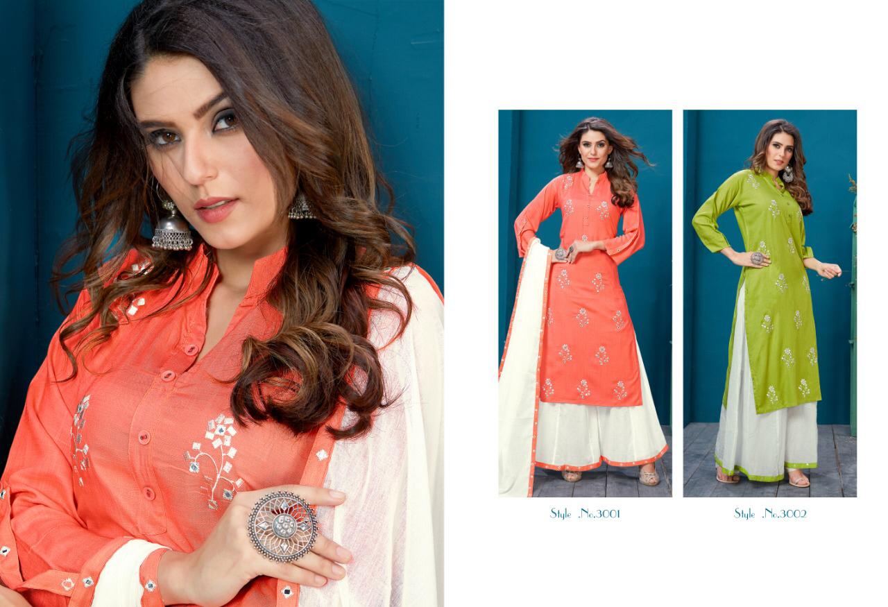 *?? ??? ????? ?? ?? ???? ??? ????? *KALAKARI nx* ??????? *???????? ???? ?? ?? ??? ?????? ?? ??????* *Catalogue name*Â *" TRENDZ VOL -3"* *Details & Fabrics :-* *NEW STICHING STYLE* *1 pattern in two colour, With mirror embroidery concept on Top , cambric mal Dupatta with four embroidery work Lace , with Sharara with inner with embroidery Lace 2 piece catalogue* ? *TOP FABRIC:-* *Liva reyon slub* *Length - 46 inches* *Duppta:-* *2.25 Miter 100Ã?100 Malmal Cotton* *With four side embroidery lace* *Sharara:-* *100Ã?100 Malmal cotton* *Full length with full ghera* ?Size - *L (40)* *XL (42)* *XXL (44)* ? *Designs- 2 pcs* Rate- *1199/-* ? *5% GST* Set To Set . |