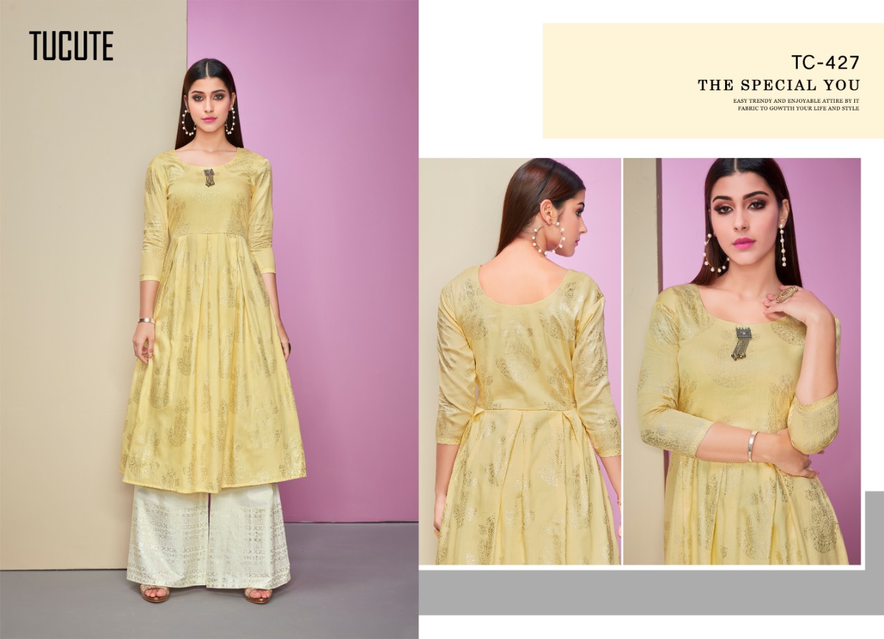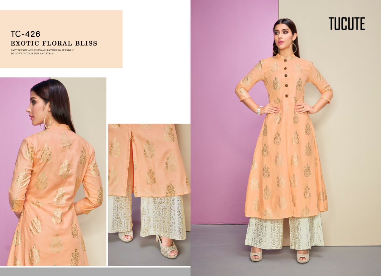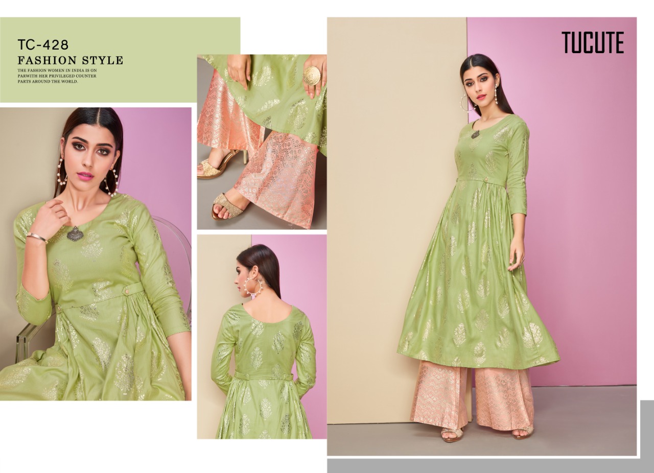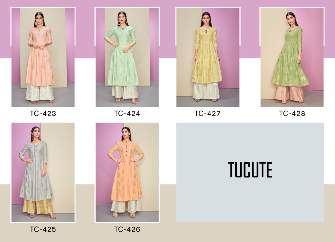 Buy Online Tucute 423 Series By Karma Cotton Foil Printed Kurtis With Plazzo Bottom Wholesale Supplier And Dealer Surat 6 Pcs of Full Catalogue at Wholesale Price. Looking for Tucute 423 Series By Karma Cotton Foil Printed Kurtis With Plazzo Bottom Wholesale Supplier And Dealer Surat Full Catalouge at Best Price? Buy Now Tucute 423 Series By Karma Cotton Foil Printed Kurtis With Plazzo Bottom Wholesale Supplier And Dealer Surat at Wholesale Rate of Rs 6570 with Total 6 Pcs from authroized dealer and supplier of KARMA Brand. Cost of Each piece is just only Rs 1095 which is very low and affordable price to resale the product in your retail store ,This is Surat based Wholesale Supplier & Dealer of KARMA Brand. Click on Brand name to Know more about KARMA Brand's products.Call or Whatsapp on 9898838984 for booking or enquiry