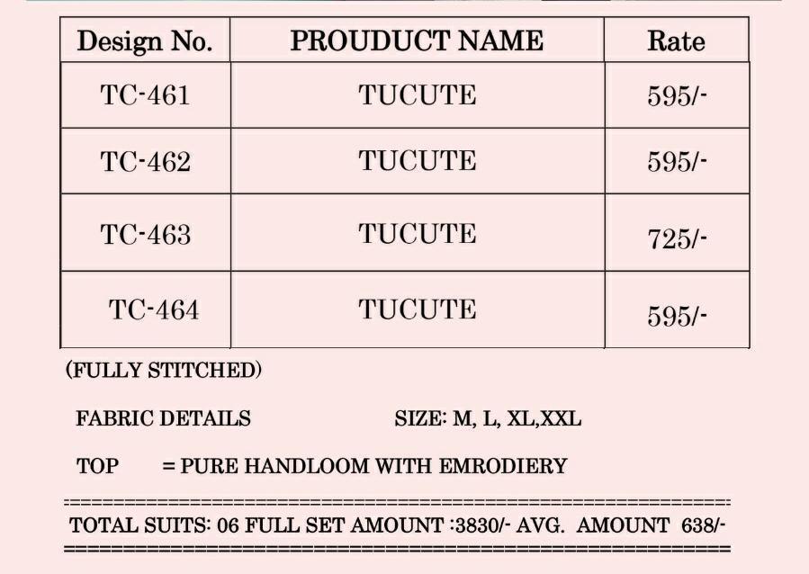 Buy Online Tucute 461 Series By Karma Handloom Kurtis Wholesale Supplier Surat 6 Pcs of Full Catalogue at Wholesale Price. Looking for Tucute 461 Series By Karma Handloom Kurtis Wholesale Supplier Surat Full Catalouge at Best Price? Buy Now Tucute 461 Series By Karma Handloom Kurtis Wholesale Supplier Surat at Wholesale Rate of Rs 3828 with Total 6 Pcs from authroized dealer and supplier of KARMA Brand. Cost of Each piece is just only Rs 638 which is very low and affordable price to resale the product in your retail store ,This is Surat based Wholesale Supplier & Dealer of KARMA Brand. Click on Brand name to Know more about KARMA Brand's products.Call or Whatsapp on 9898838984 for booking or enquiry