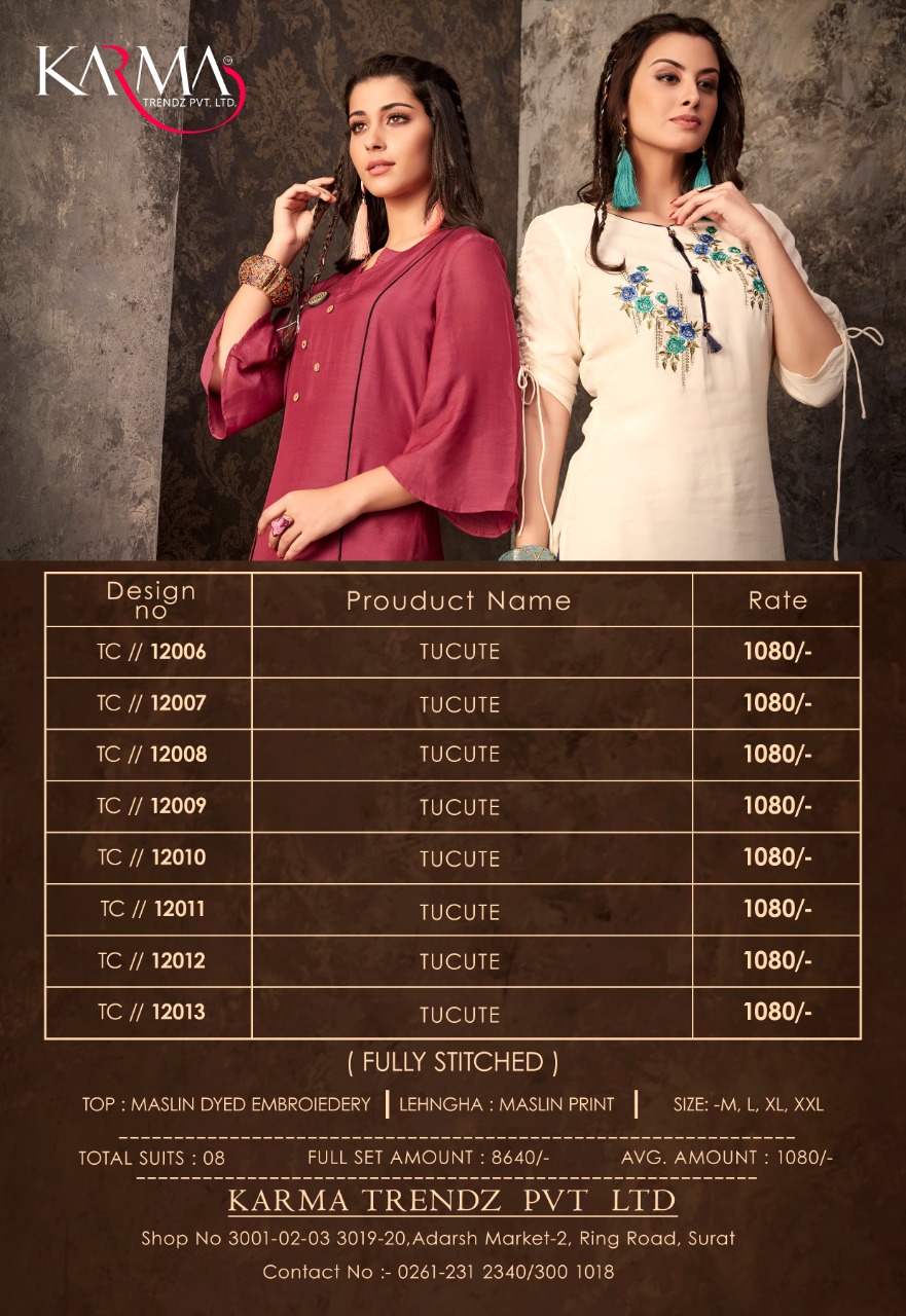Buy Online Tucute By Karma 12006 Series Designer Muslin Kurti With Muslin Print Lehnga Collection Wholesale Dealer Surat 8 Pcs of Full Catalogue at Wholesale Price. Looking for Tucute By Karma 12006 Series Designer Muslin Kurti With Muslin Print Lehnga Collection Wholesale Dealer Surat Full Catalouge at Best Price? Buy Now Tucute By Karma 12006 Series Designer Muslin Kurti With Muslin Print Lehnga Collection Wholesale Dealer Surat at Wholesale Rate of Rs 8640 with Total 8 Pcs from authroized dealer and supplier of KARMA Brand. Cost of Each piece is just only Rs 1080 which is very low and affordable price to resale the product in your retail store ,This is Surat based Wholesale Supplier & Dealer of KARMA Brand. Click on Brand name to Know more about KARMA Brand's products.Call or Whatsapp on 9898838984 for booking or enquiry