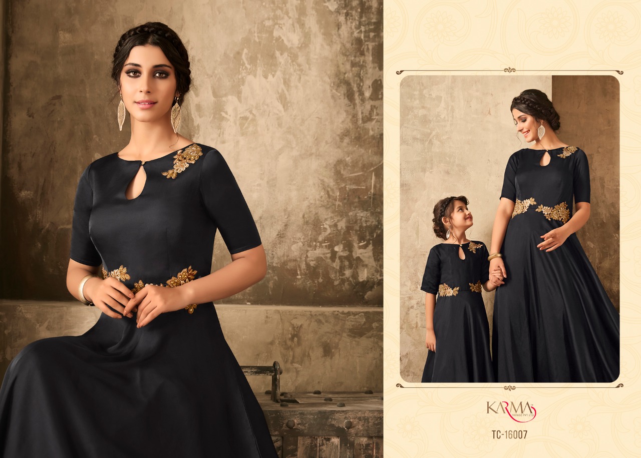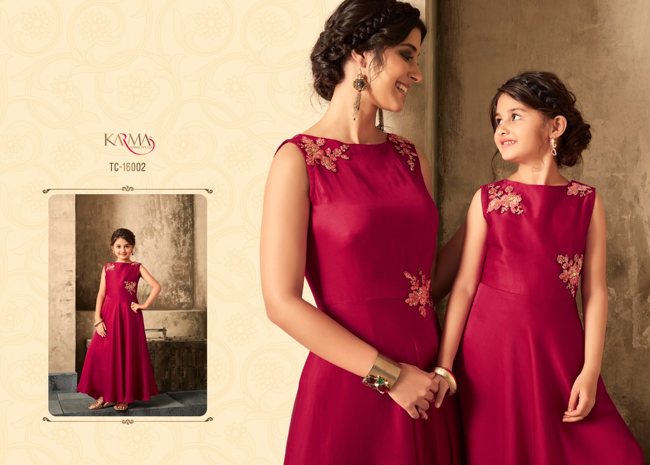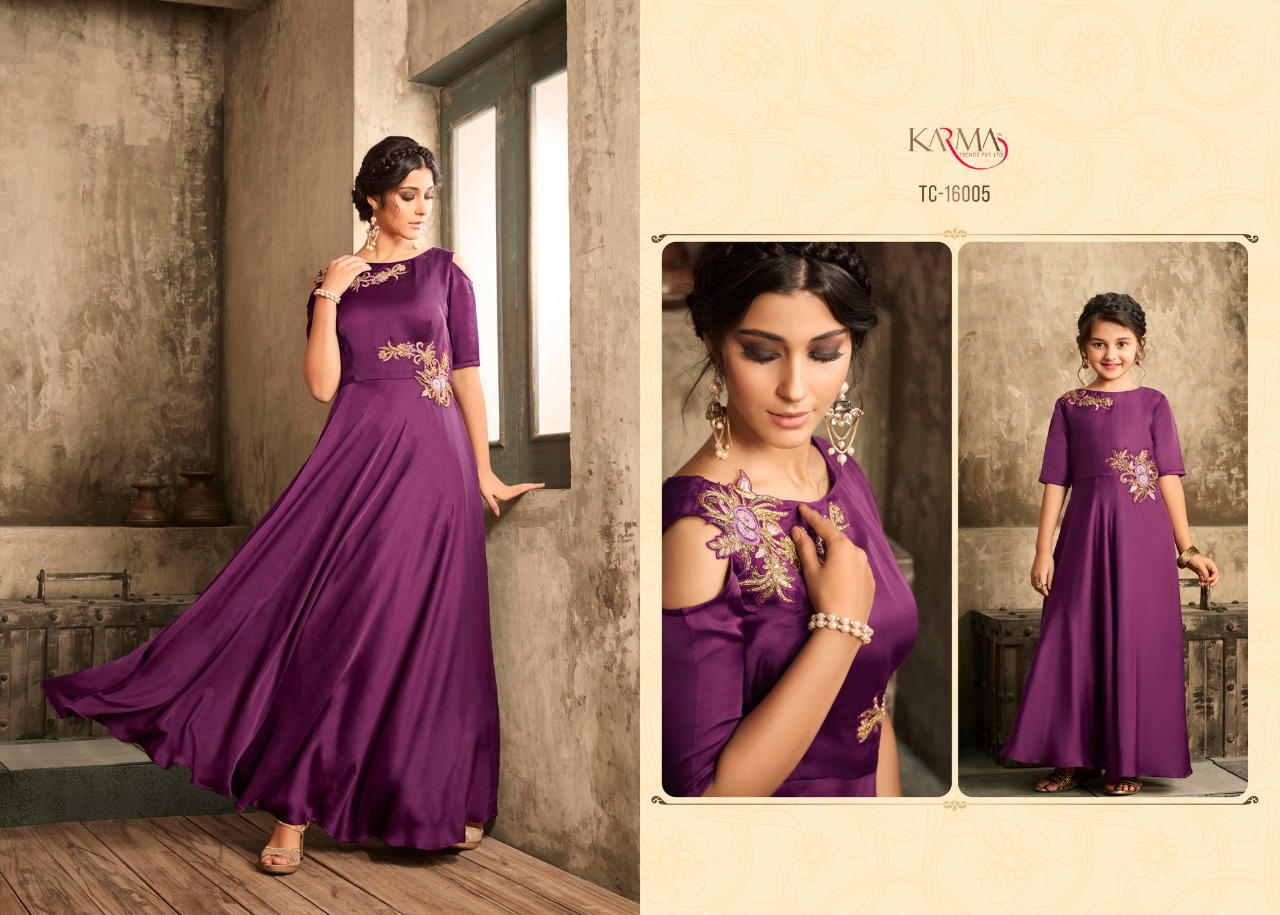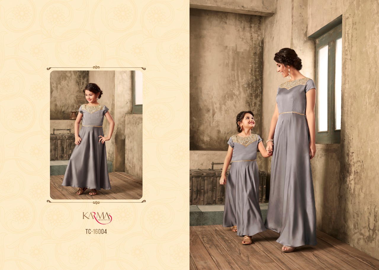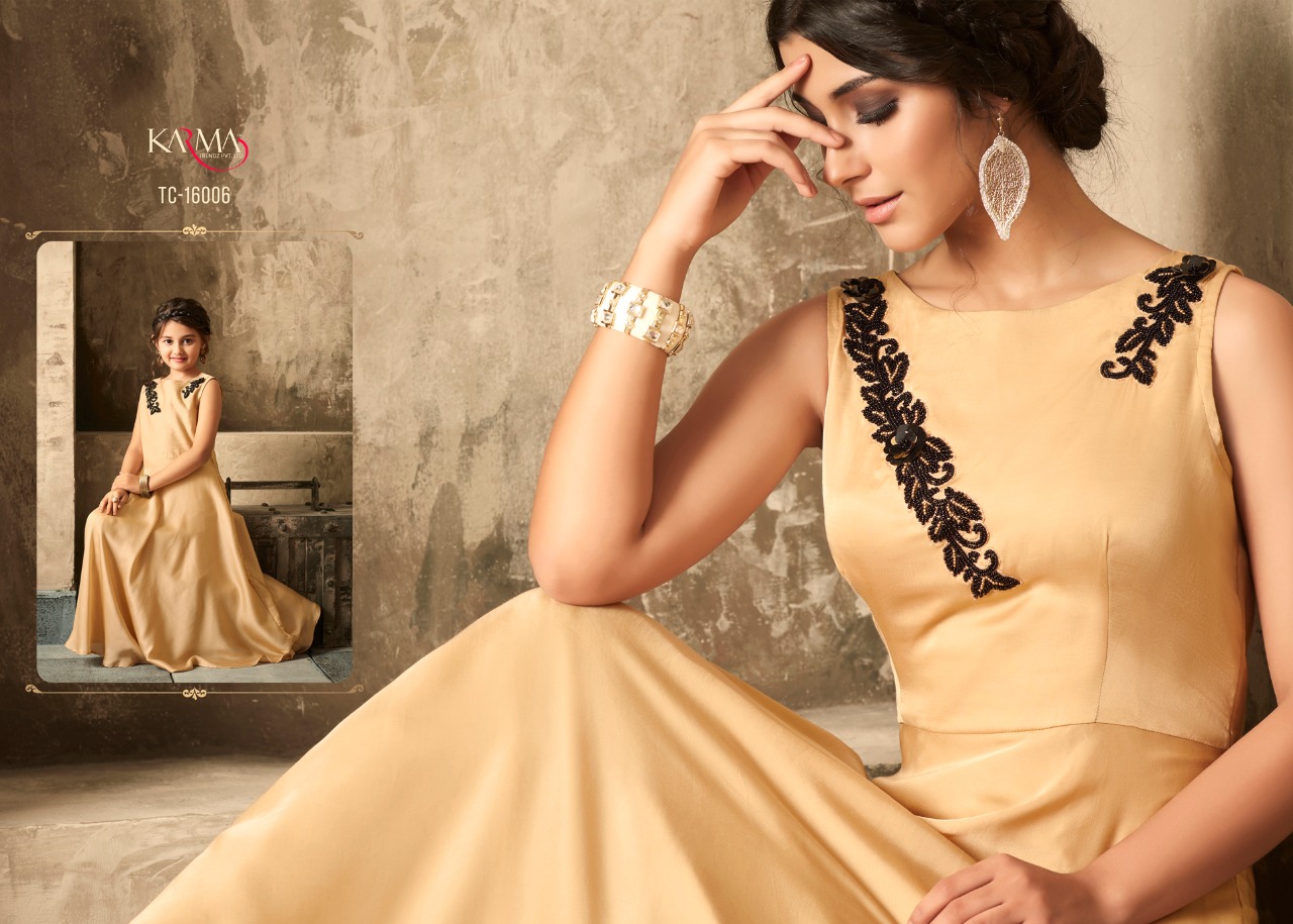 *KARMA TRENDZ* _presents_ *Readymade collections* *?TUCUTE VOL:-16?* *TC-16002 SERIES..* Karma proudly present introductory collection of ready made festive and party wear Gowns not only for the beautiful moms but also the gorgeous daughters to up your style quotient ?Description? ?Fabric: *Satin with embroidered stone work.* ? The Gown Length 52 inches Size - L-40, XL-42 ( with two inch margin) KIDS:-Chest -13.4Â? Length -40Â? ?Beautiful -06 design set *#Festival_collection* *#Party wear gown* *Regards* *KARMA TRENDZ* Kids size - 26 to 28 Mother size - L & XL |