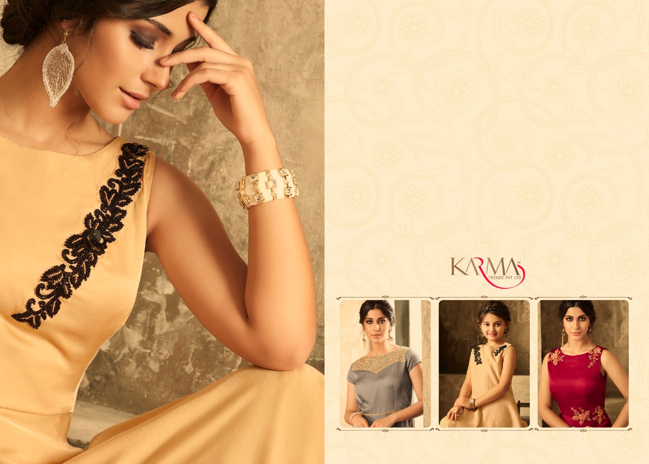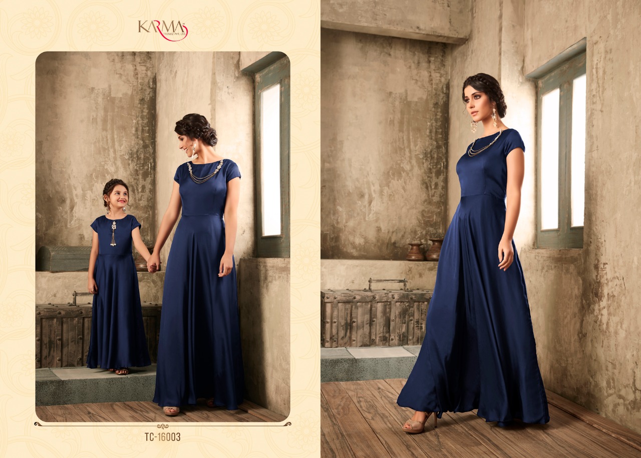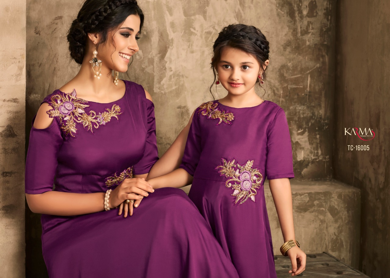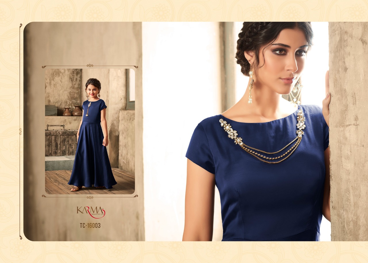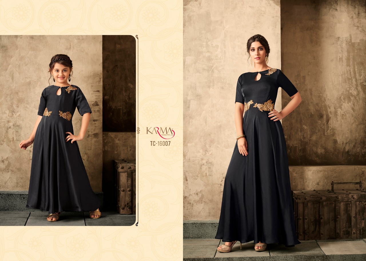 *KARMA TRENDZ* _presents_ *Readymade collections* *?TUCUTE VOL:-16?* *TC-16002 SERIES..* Karma proudly present introductory collection of ready made festive and party wear Gowns not only for the beautiful moms but also the gorgeous daughters to up your style quotient ?Description? ?Fabric: *Satin with embroidered stone work.* ? The Gown Length 52 inches Size - L-40, XL-42 ( with two inch margin) KIDS:-Chest -13.4Â? Length -40Â? ?Beautiful -06 design set *#Festival_collection* *#Party wear gown* *Regards* *KARMA TRENDZ* Kids size - 26 to 28 Mother size - L & XL |