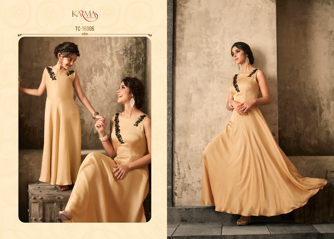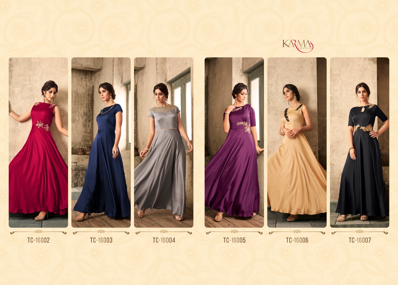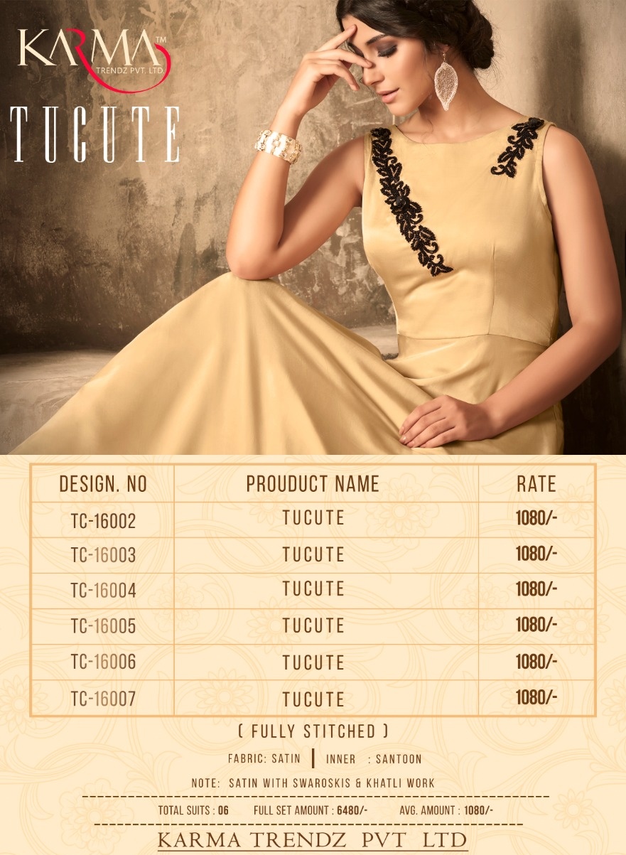 Buy Online Tucute Vol 16 By Karma 16002 Series Fancy Designer Gown Collection Wholesale Dealer Surat 6 Pcs of Full Catalogue at Wholesale Price. Looking for Tucute Vol 16 By Karma 16002 Series Fancy Designer Gown Collection Wholesale Dealer Surat Full Catalouge at Best Price? Buy Now Tucute Vol 16 By Karma 16002 Series Fancy Designer Gown Collection Wholesale Dealer Surat at Wholesale Rate of Rs 6480 with Total 6 Pcs from authroized dealer and supplier of KARMA Brand. Cost of Each piece is just only Rs 1080 which is very low and affordable price to resale the product in your retail store ,This is Surat based Wholesale Supplier & Dealer of KARMA Brand. Click on Brand name to Know more about KARMA Brand's products.Call or Whatsapp on 9898838984 for booking or enquiry