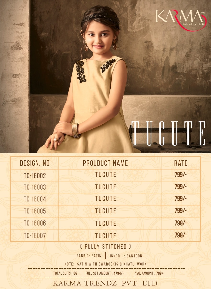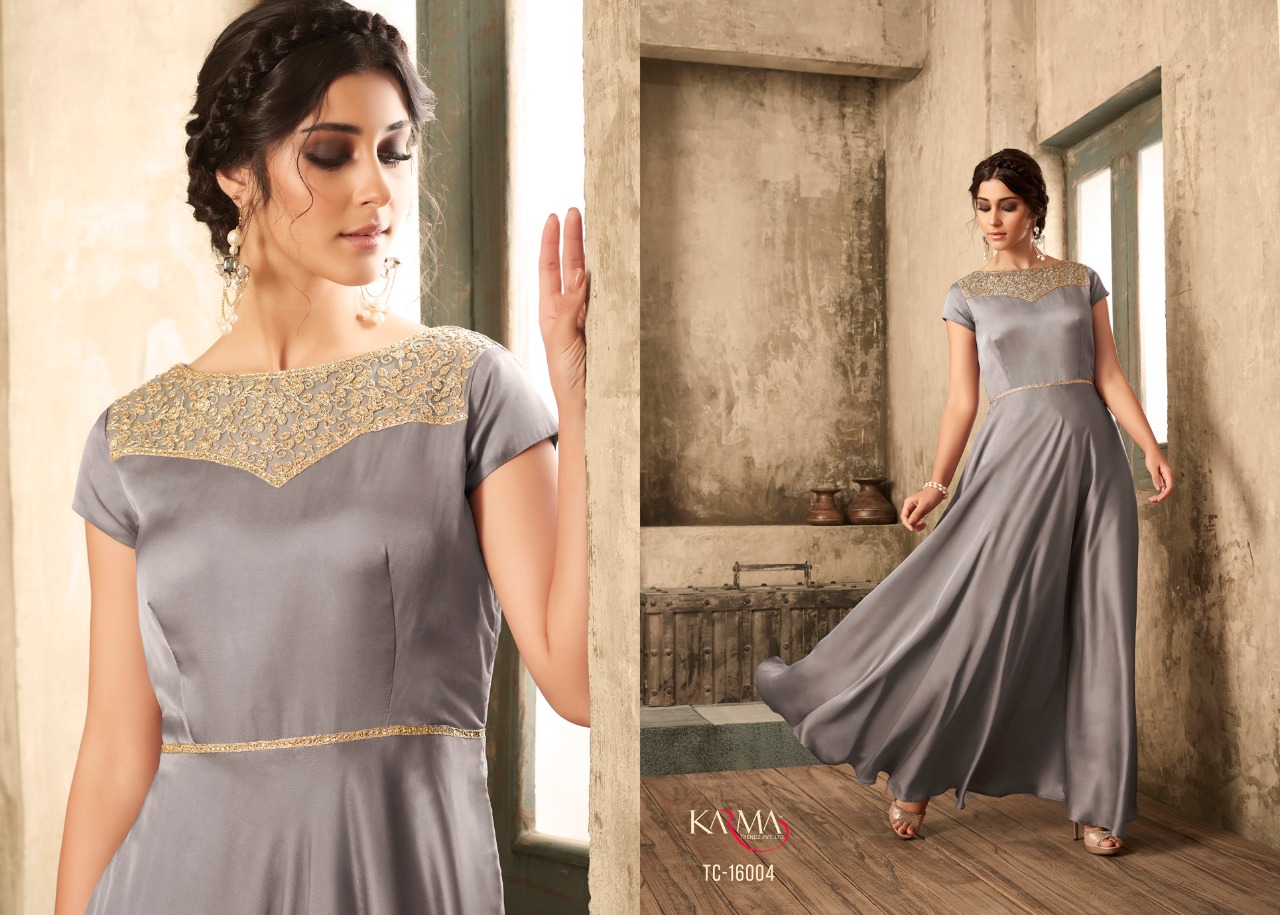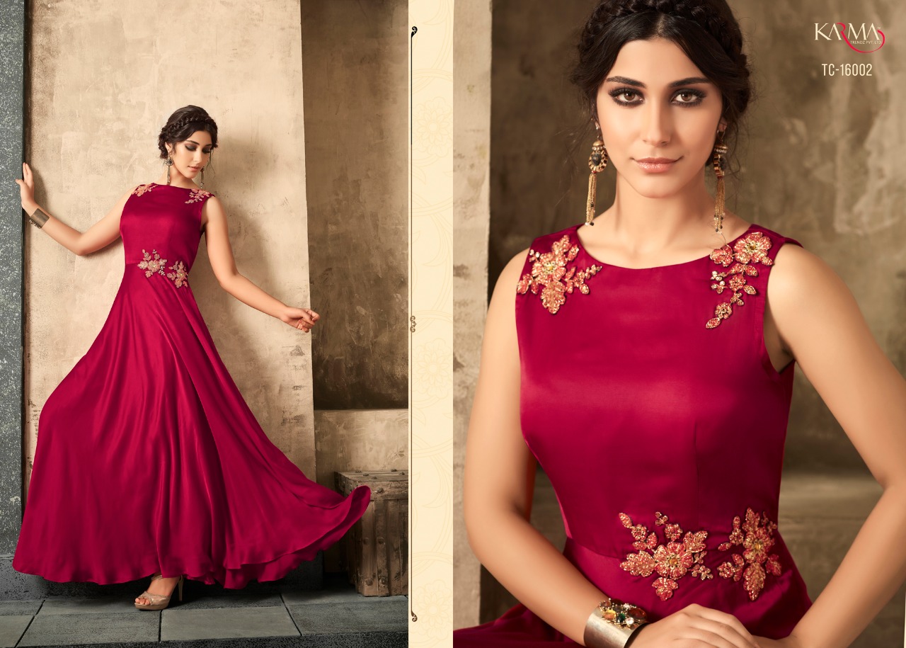 Buy Online Tucute Vol 16 By Karma 16002 Series Fancy Designer Gown Collection Wholesale Dealer Surat 6 Pcs of Full Catalogue at Wholesale Price. Looking for Tucute Vol 16 By Karma 16002 Series Fancy Designer Gown Collection Wholesale Dealer Surat Full Catalouge at Best Price? Buy Now Tucute Vol 16 By Karma 16002 Series Fancy Designer Gown Collection Wholesale Dealer Surat at Wholesale Rate of Rs 6480 with Total 6 Pcs from authroized dealer and supplier of KARMA Brand. Cost of Each piece is just only Rs 1080 which is very low and affordable price to resale the product in your retail store ,This is Surat based Wholesale Supplier & Dealer of KARMA Brand. Click on Brand name to Know more about KARMA Brand's products.Call or Whatsapp on 9898838984 for booking or enquiry