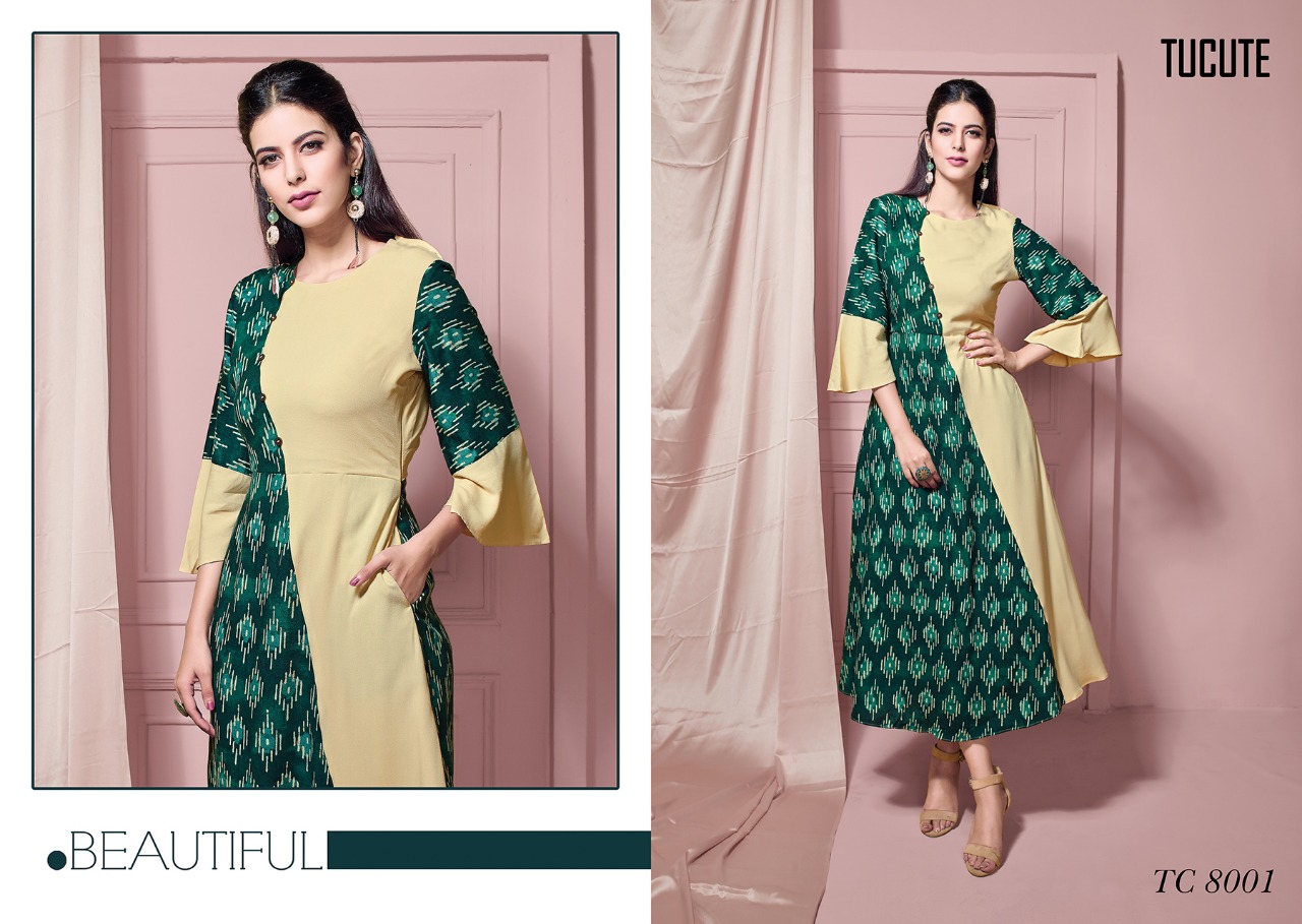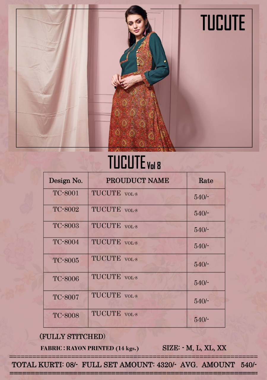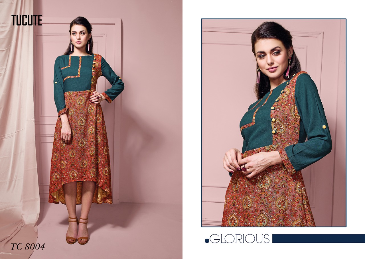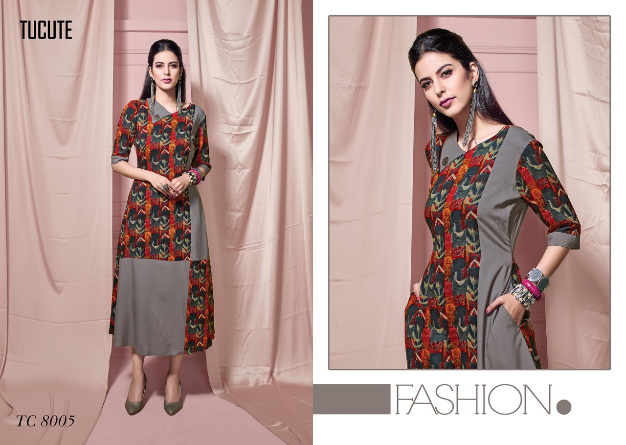 Buy Online Tucute Vol 8 By Karma Series 8001 Reyon Printed Designer Kurtis Catalog Wholesale Supplier And Dealer Gujarat 8 Pcs of Full Catalogue at Wholesale Price. Looking for Tucute Vol 8 By Karma Series 8001 Reyon Printed Designer Kurtis Catalog Wholesale Supplier And Dealer Gujarat Full Catalouge at Best Price? Buy Now Tucute Vol 8 By Karma Series 8001 Reyon Printed Designer Kurtis Catalog Wholesale Supplier And Dealer Gujarat at Wholesale Rate of Rs 4320 with Total 8 Pcs from authroized dealer and supplier of KARMA Brand. Cost of Each piece is just only Rs 540 which is very low and affordable price to resale the product in your retail store ,This is Surat based Wholesale Supplier & Dealer of KARMA Brand. Click on Brand name to Know more about KARMA Brand's products.Call or Whatsapp on 9898838984 for booking or enquiry
