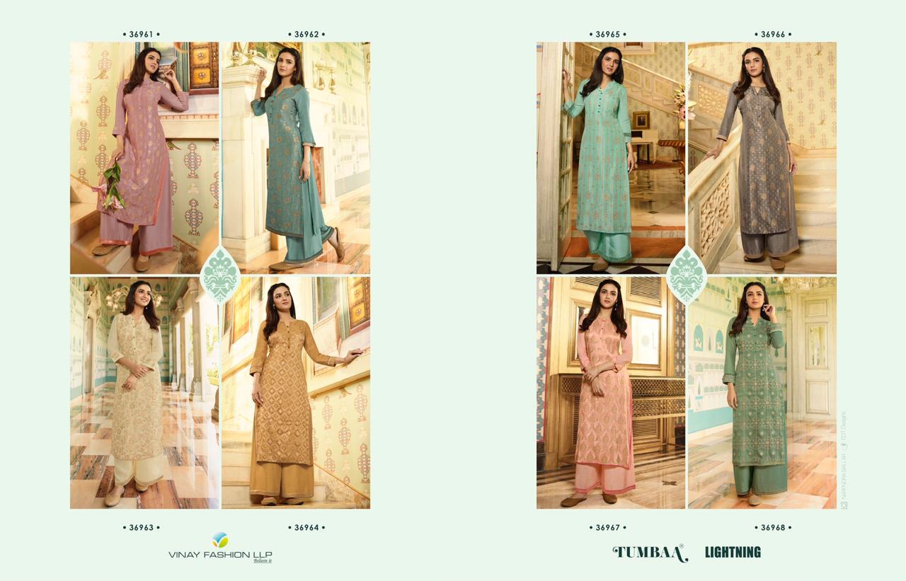 Buy Online Tumbaa Lightning By Vinay Series 36961 To 36968 Dola Jaquard Kurtis With Plazzo Wholesale Supplier Surat 8 Pcs of Full Catalogue at Wholesale Price. Looking for Tumbaa Lightning By Vinay Series 36961 To 36968 Dola Jaquard Kurtis With Plazzo Wholesale Supplier Surat Full Catalouge at Best Price? Buy Now Tumbaa Lightning By Vinay Series 36961 To 36968 Dola Jaquard Kurtis With Plazzo Wholesale Supplier Surat at Wholesale Rate of Rs 9320 with Total 8 Pcs from authroized dealer and supplier of VINAY Brand. Cost of Each piece is just only Rs 1165 which is very low and affordable price to resale the product in your retail store ,This is Surat based Wholesale Supplier & Dealer of VINAY Brand. Click on Brand name to Know more about VINAY Brand's products.Call or Whatsapp on 9898838984 for booking or enquiry