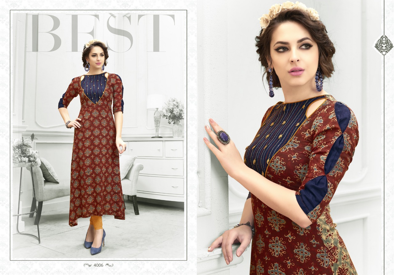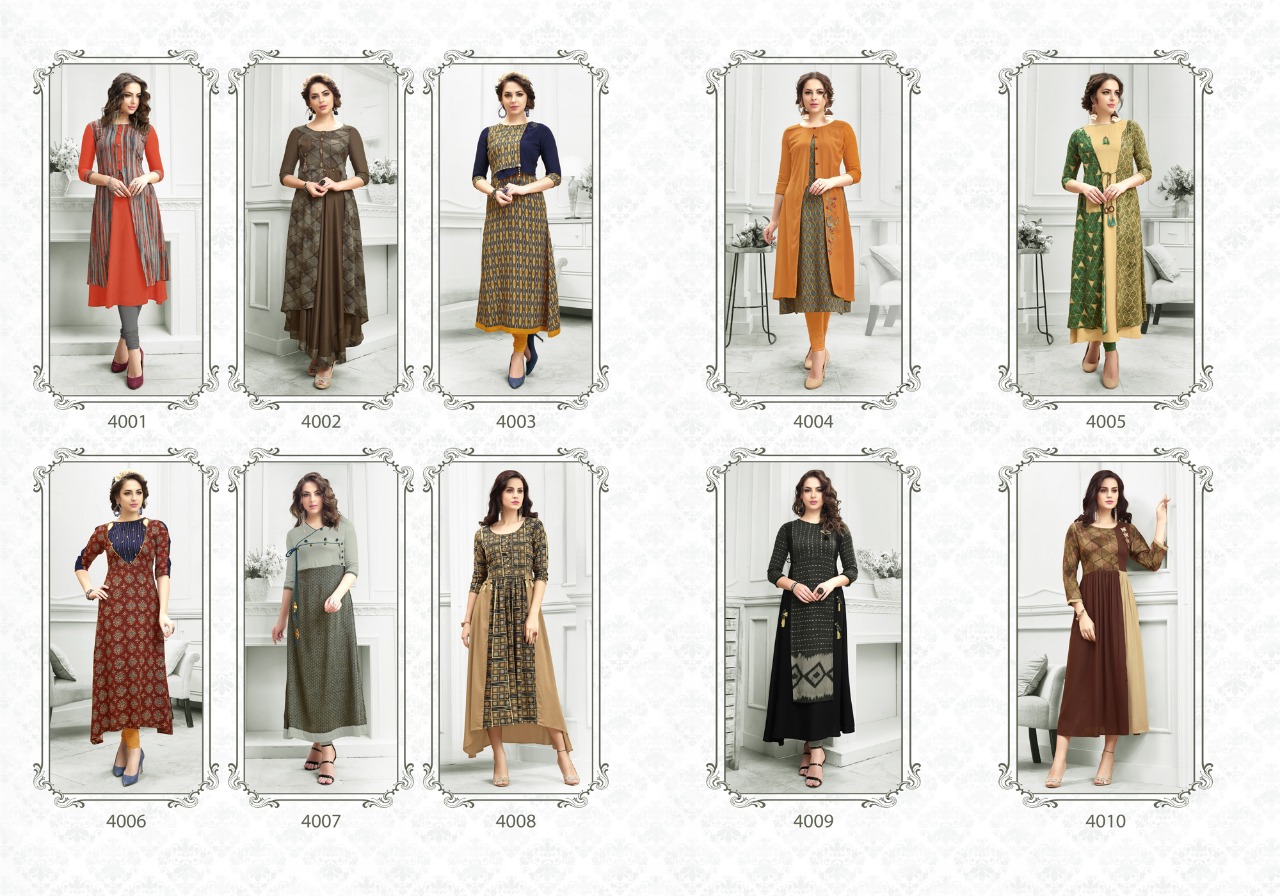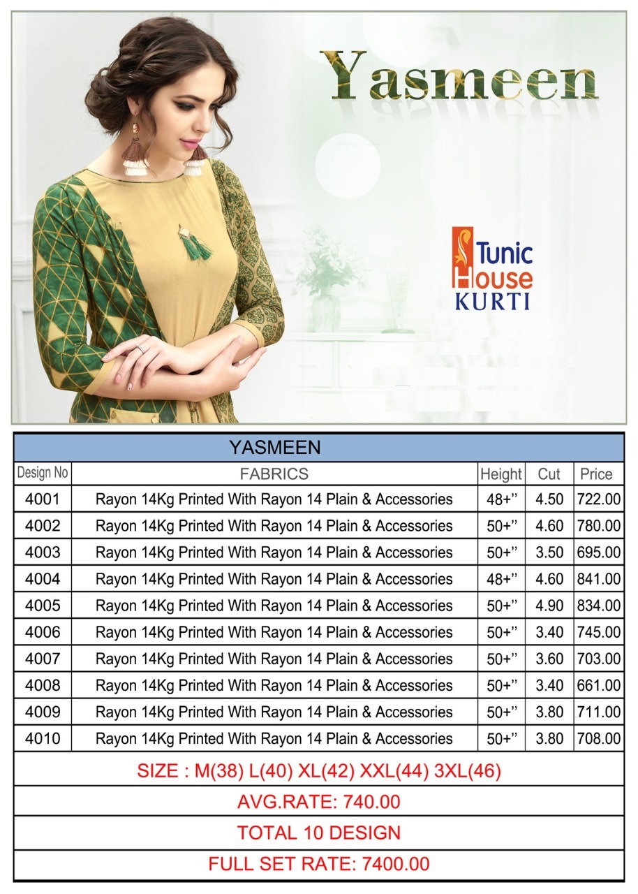 Buy Online Tunic House Yasmeen 4001 Series Designer Kurti Dealer Surat 10 Pcs of Full Catalogue at Wholesale Price. Looking for Tunic House Yasmeen 4001 Series Designer Kurti Dealer Surat Full Catalouge at Best Price? Buy Now Tunic House Yasmeen 4001 Series Designer Kurti Dealer Surat at Wholesale Rate of Rs 7400 with Total 10 Pcs from authroized dealer and supplier of TUNIC HOUSE Brand. Cost of Each piece is just only Rs 740 which is very low and affordable price to resale the product in your retail store ,This is Surat based Wholesale Supplier & Dealer of TUNIC HOUSE Brand. Click on Brand name to Know more about TUNIC HOUSE Brand's products.Call or Whatsapp on 9898838984 for booking or enquiry
