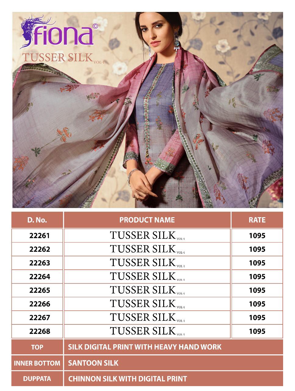 Buy Online Tussar Silk Vol 1 By Fiona 22261 Series Fancy Silk Digital Printed Salwar Kameez Catlog Wholesale Dealer Surat 8 Pcs of Full Catalogue at Wholesale Price. Looking for Tussar Silk Vol 1 By Fiona 22261 Series Fancy Silk Digital Printed Salwar Kameez Catlog Wholesale Dealer Surat Full Catalouge at Best Price? Buy Now Tussar Silk Vol 1 By Fiona 22261 Series Fancy Silk Digital Printed Salwar Kameez Catlog Wholesale Dealer Surat at Wholesale Rate of Rs 8760 with Total 8 Pcs from authroized dealer and supplier of FIONA Brand. Cost of Each piece is just only Rs 1095 which is very low and affordable price to resale the product in your retail store ,This is Surat based Wholesale Supplier & Dealer of FIONA Brand. Click on Brand name to Know more about FIONA Brand's products.Call or Whatsapp on 9898838984 for booking or enquiry
