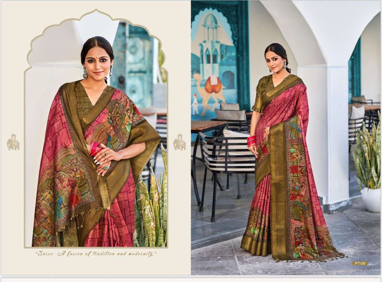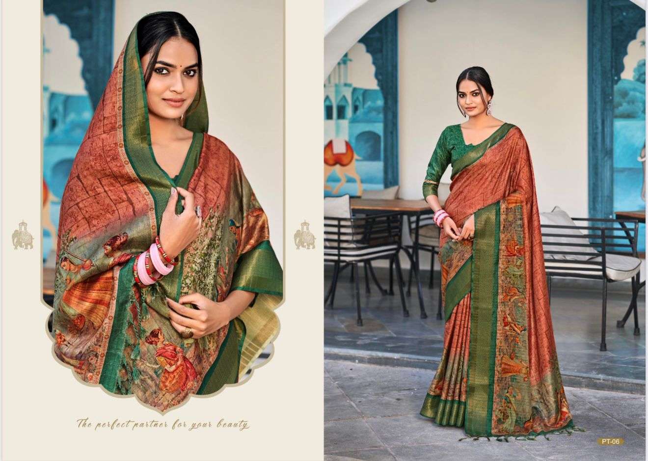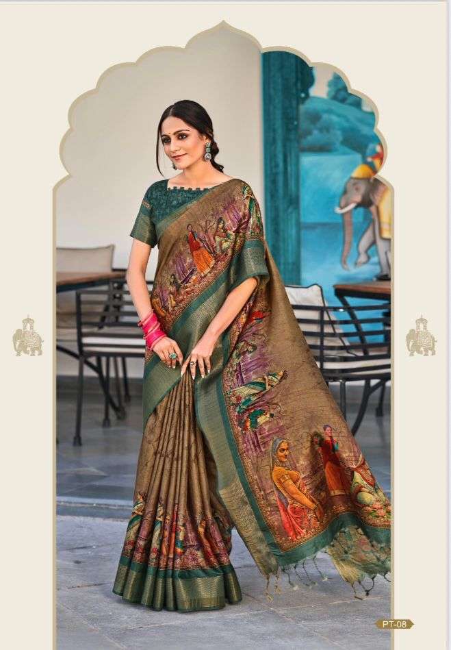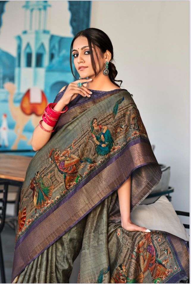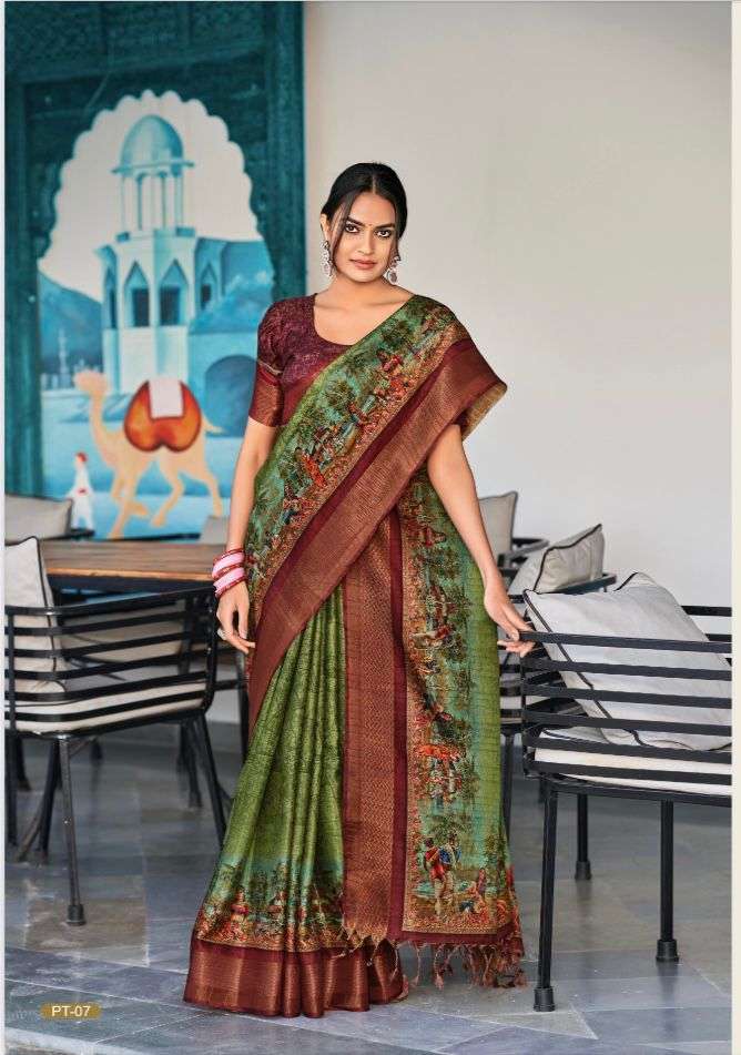 Fabric Panerai tusser silk with beautiful print and zari work Border Rich Pallu with Latkan Blouse ranning fabric